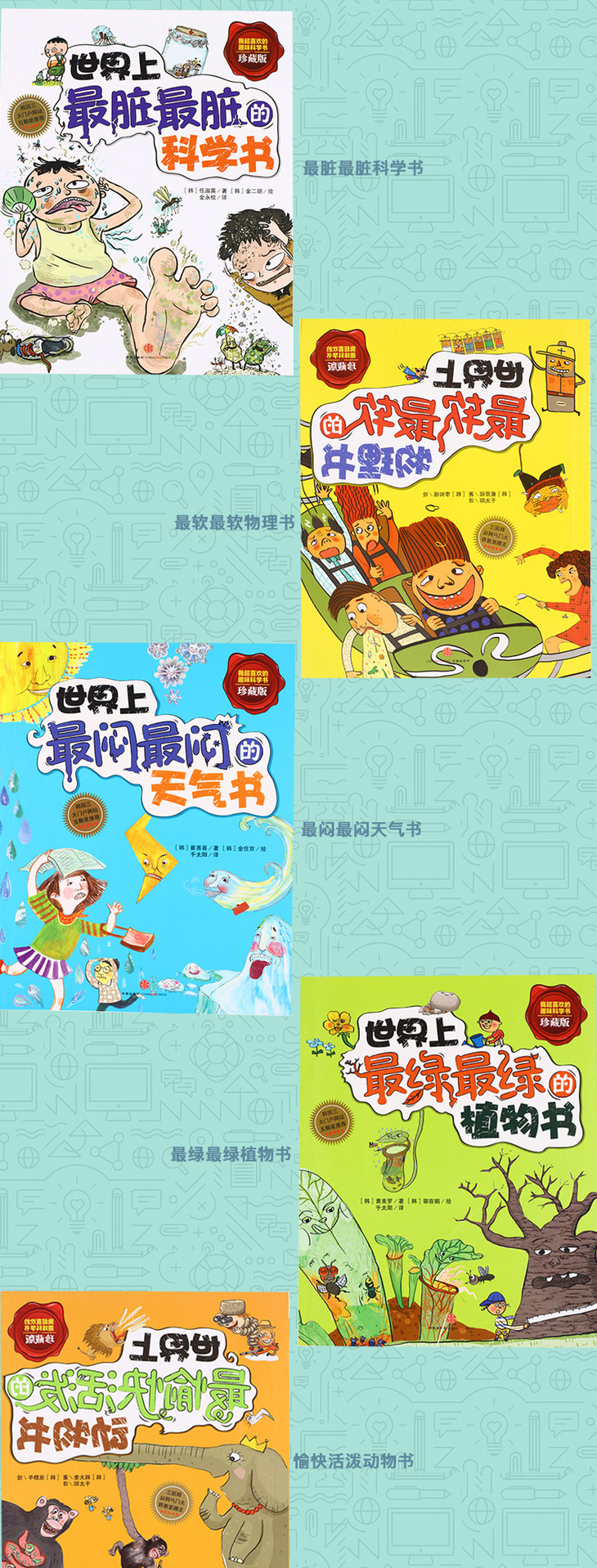 《世界上脏脏的科学书》内容简介:没有比这更脏、更恶心的书了!也肯定不会有比这更好看、更耐人寻味的科学书了!谁不想做一个干干净净的人,可是脏东西就是怎么也甩不掉!我们总是不断产生眼屎、鼻屎,还有耳屎!脸上会长出又红又的痘痘!屎、尿、屁,呀,臭死了!我们的肚子里经常会有虫子,脸上也是!你也许会说,脏东西真是太可怕了!可是,读完《世界上脏脏的科学书》后,你就会发现,原来世界上根本就不存在脏的东西,那些所谓的脏东西里居然隐藏着那么多的科学知识!那就让我们战战兢兢地翻开这本脏兮兮却生动有趣的科学书吧!