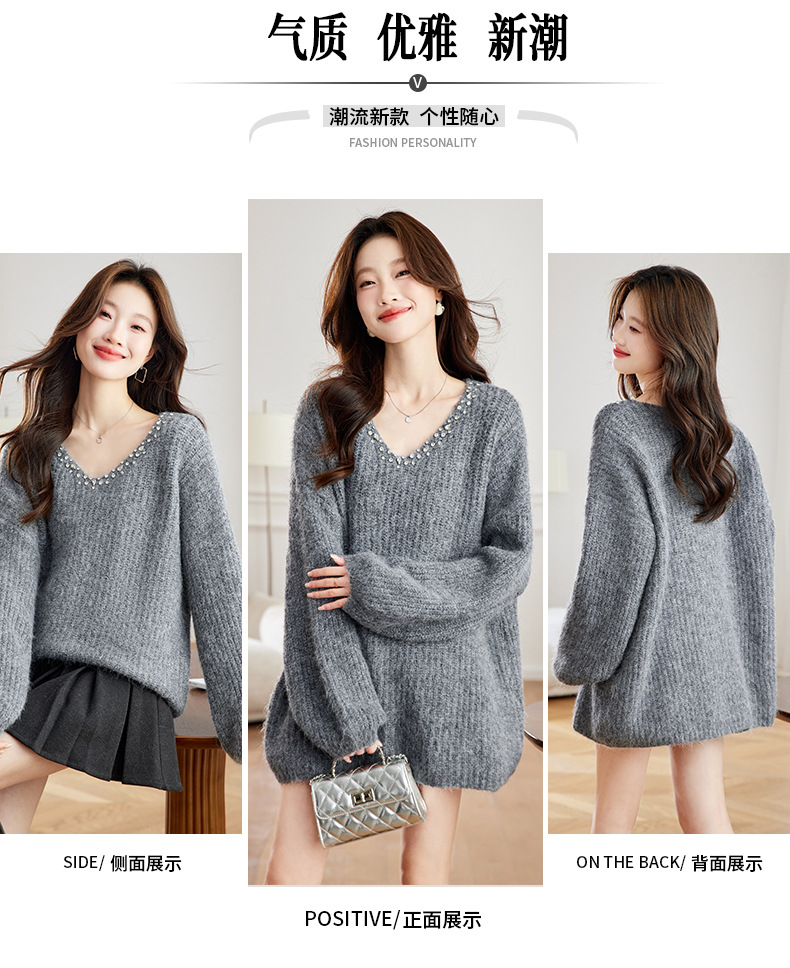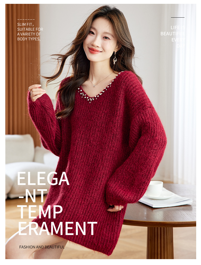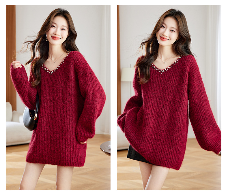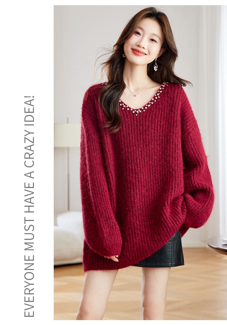 CC红色本命年慵懒风v领针织衫女秋冬大码宽松毛衣遮屁股小个子上衣
