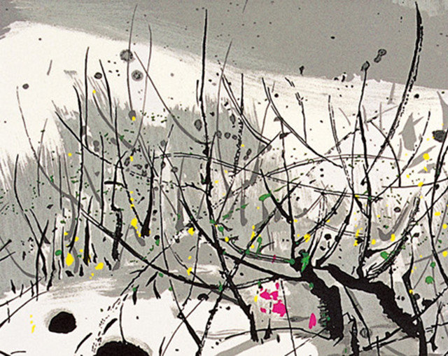 雪地里的灌木树丛枝枝如刺,如针,那是显现在宣纸上的刚劲的线,锋利的线。这里那里,虽然冒着点点新芽,或垂挂着败落的秋叶,但整体效果,仍予人墨黑、浓灰、浅绛渲染出的水墨画情调。