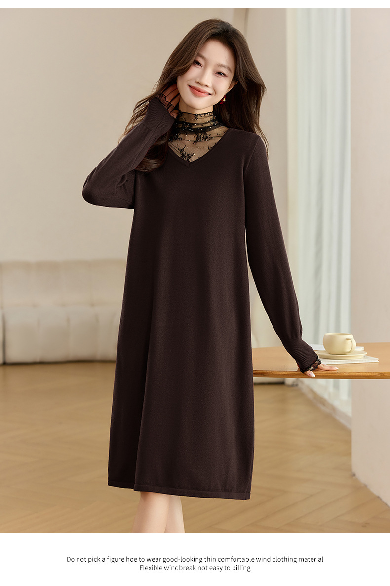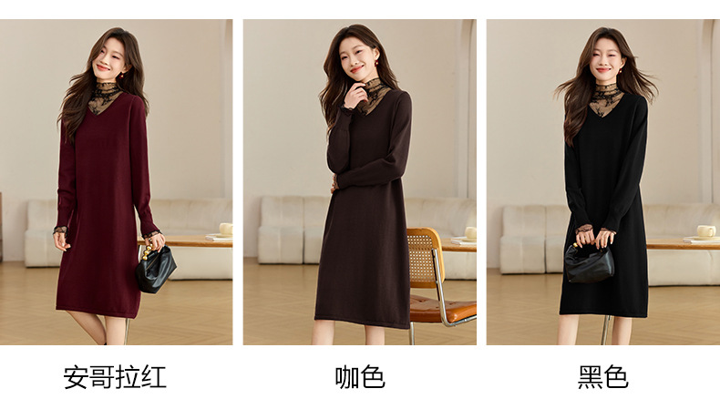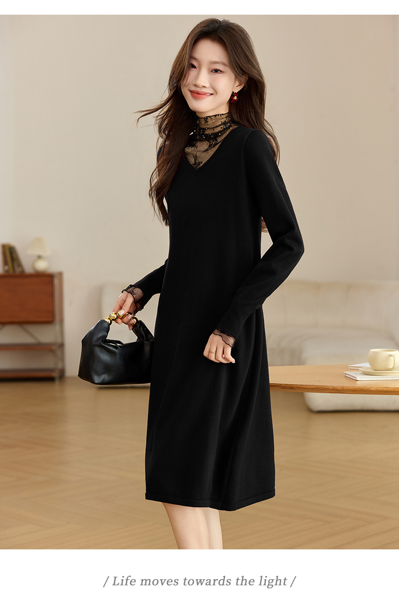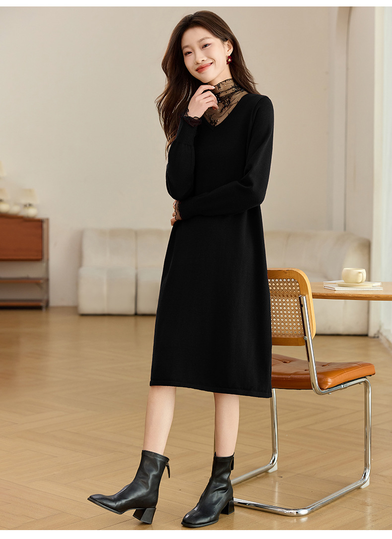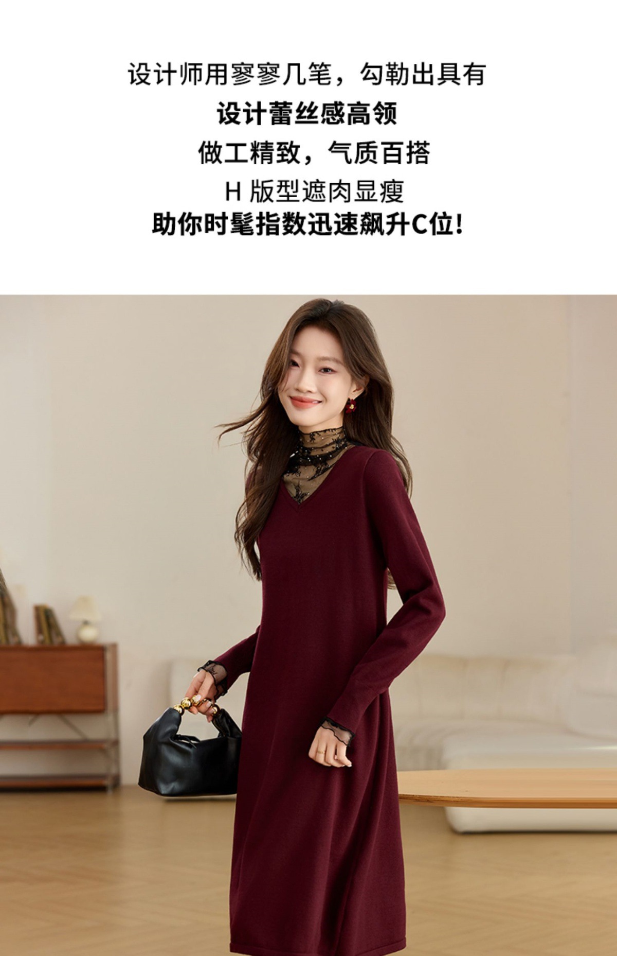 CC-XFY-2338蕾丝拼接毛衣连衣裙女中长款秋冬小个子配大衣内搭打底裙