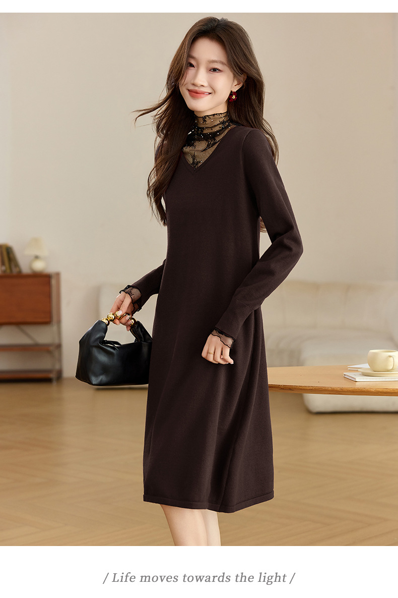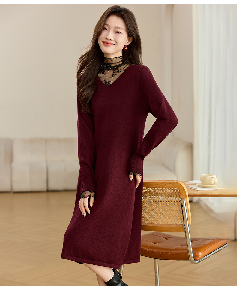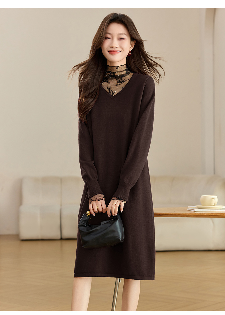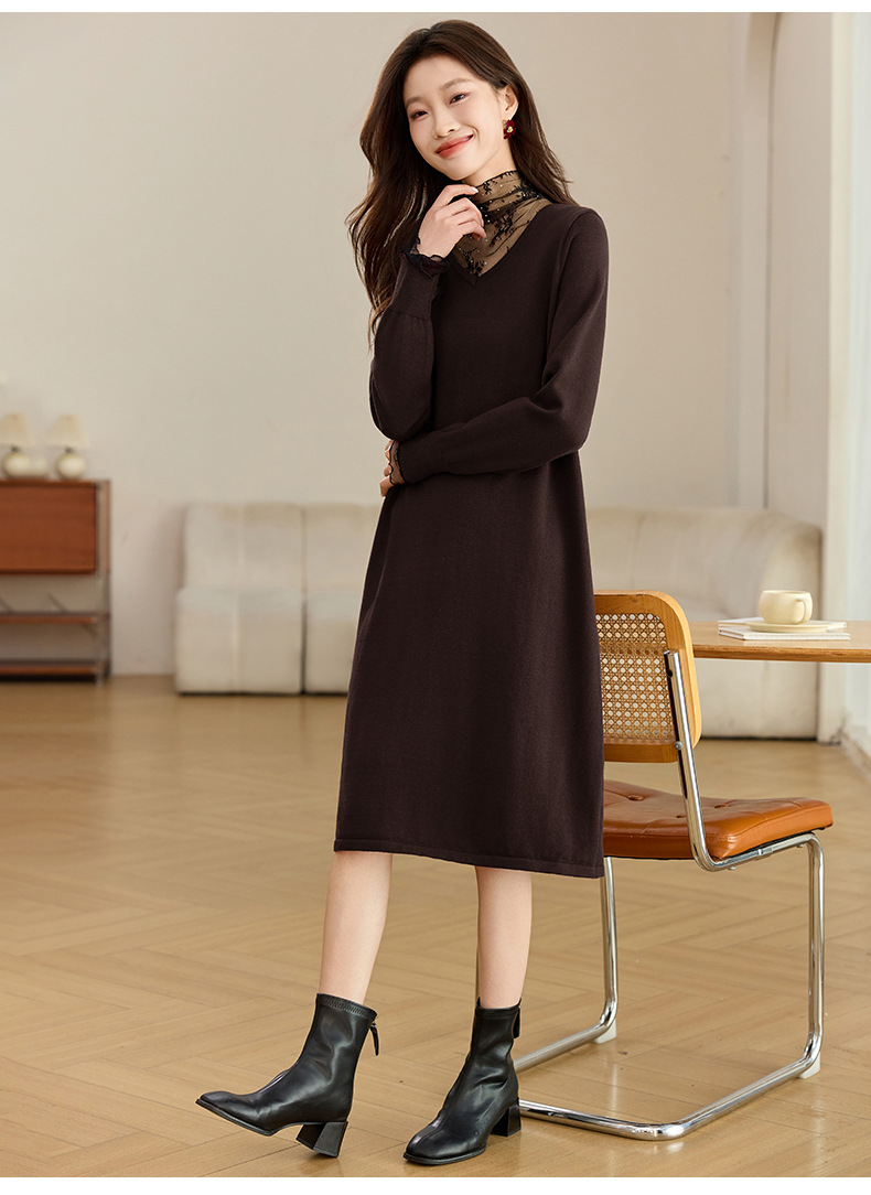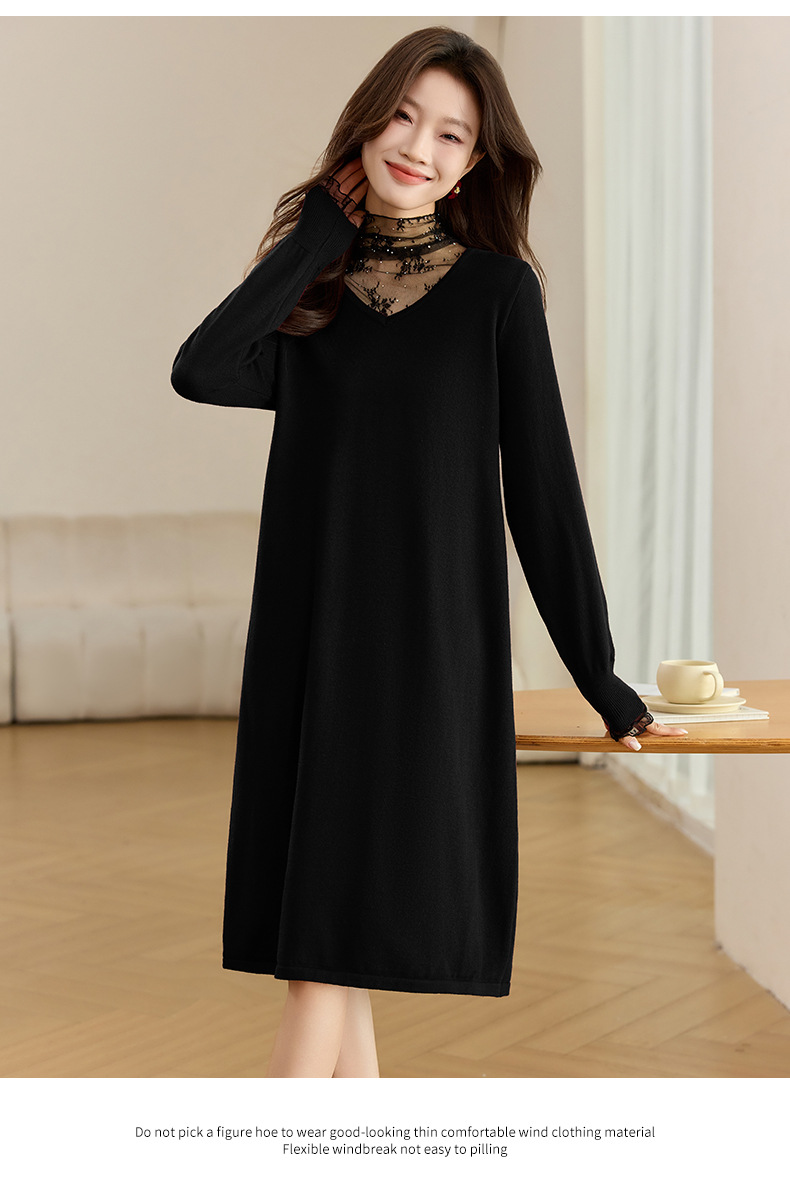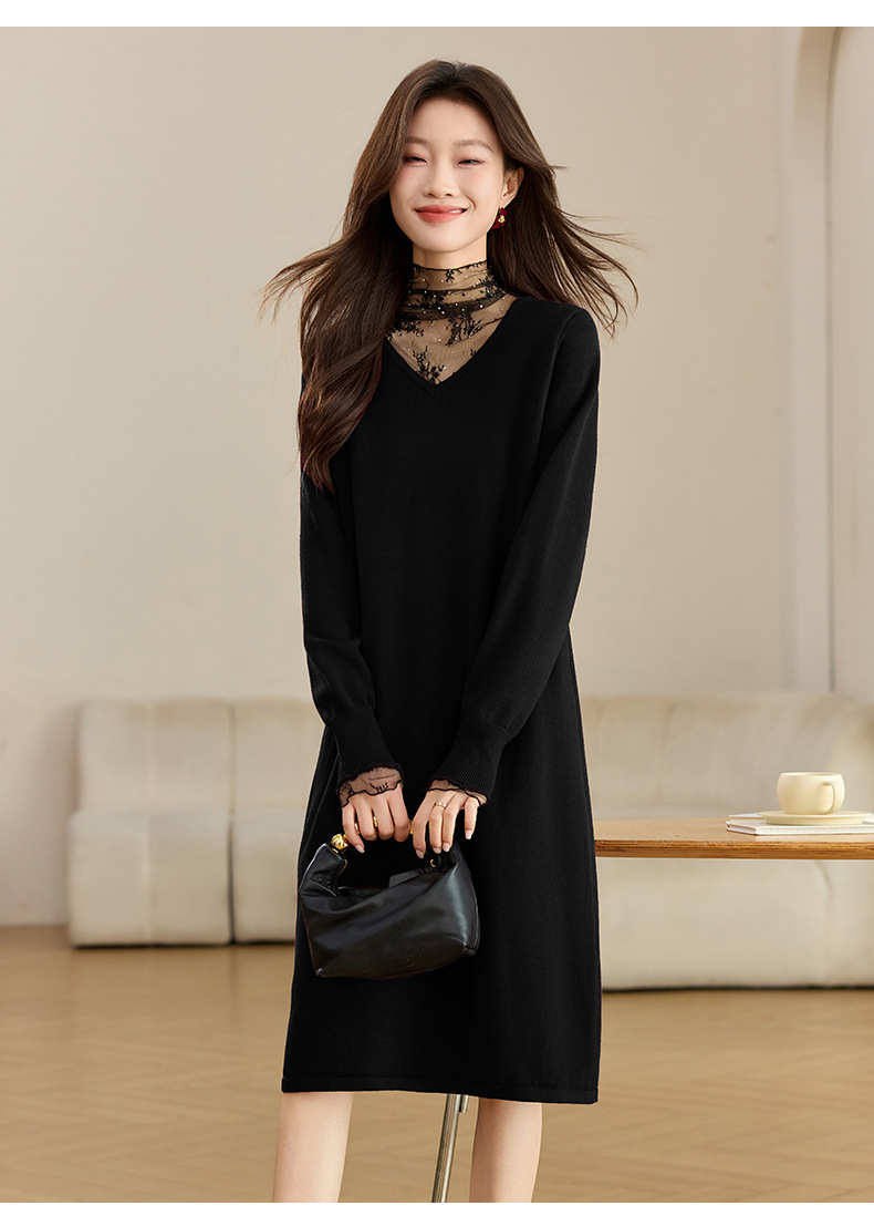 CC-XFY-2338蕾丝拼接毛衣连衣裙女中长款秋冬小个子配大衣内搭打底裙