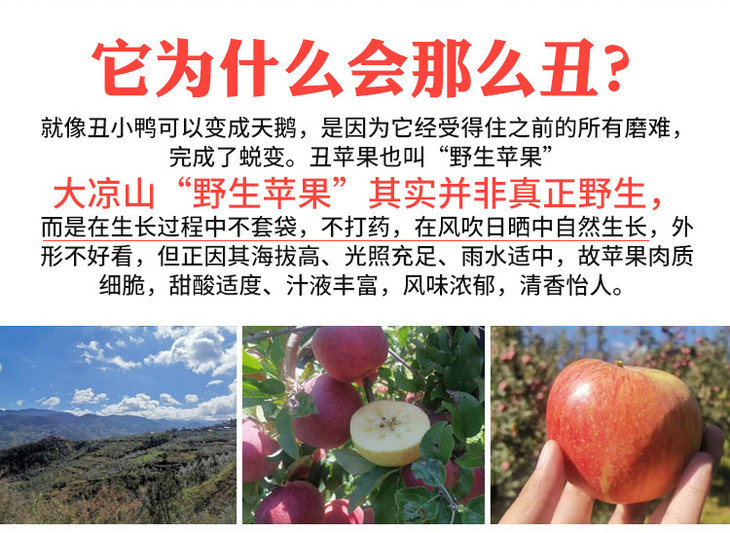 高海拔,不套袋!丑的美丽,丑的自在!从树尖到舌尖, 从尝试到喜欢,从喜欢到喜爱,每一个高原生态丑苹果,都传递着大自然的甜蜜与美味。