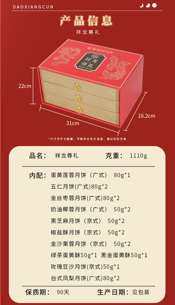 【稻香村】祥龙尊礼1110g/18饼11味【精美手提袋】高档礼盒 京式广式月饼多口味五仁蛋黄莲蓉经典味道