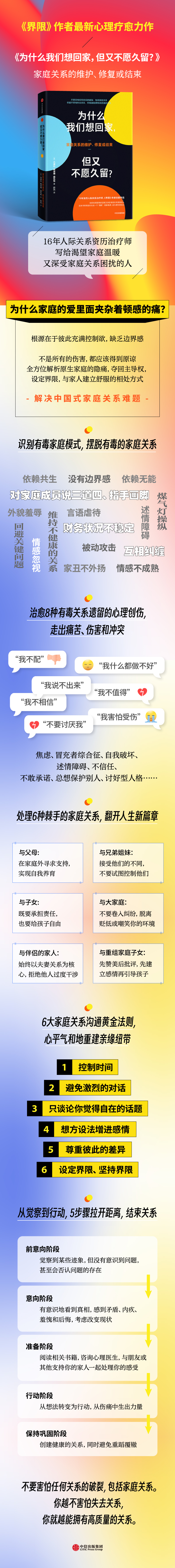 4.家人之间重要的相处原则就是:边界感。对大多数人来说,家庭的爱里往往夹杂着顿感的痛。家庭关系令人痛苦根源就在于充满控制欲,缺乏边界感。16年人际关系治疗师将本书献给渴望家庭温暖又受家庭关系困扰的每个人。帮助读者克服内疚、设定界限,摆脱以爱为名的情感暴力,夺回生活的主导权,与家人重建令自己舒服的相处方式。