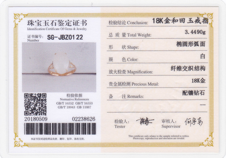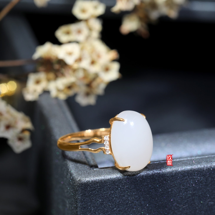 18K玫瑰金和田玉(白玉)镶钻戒指