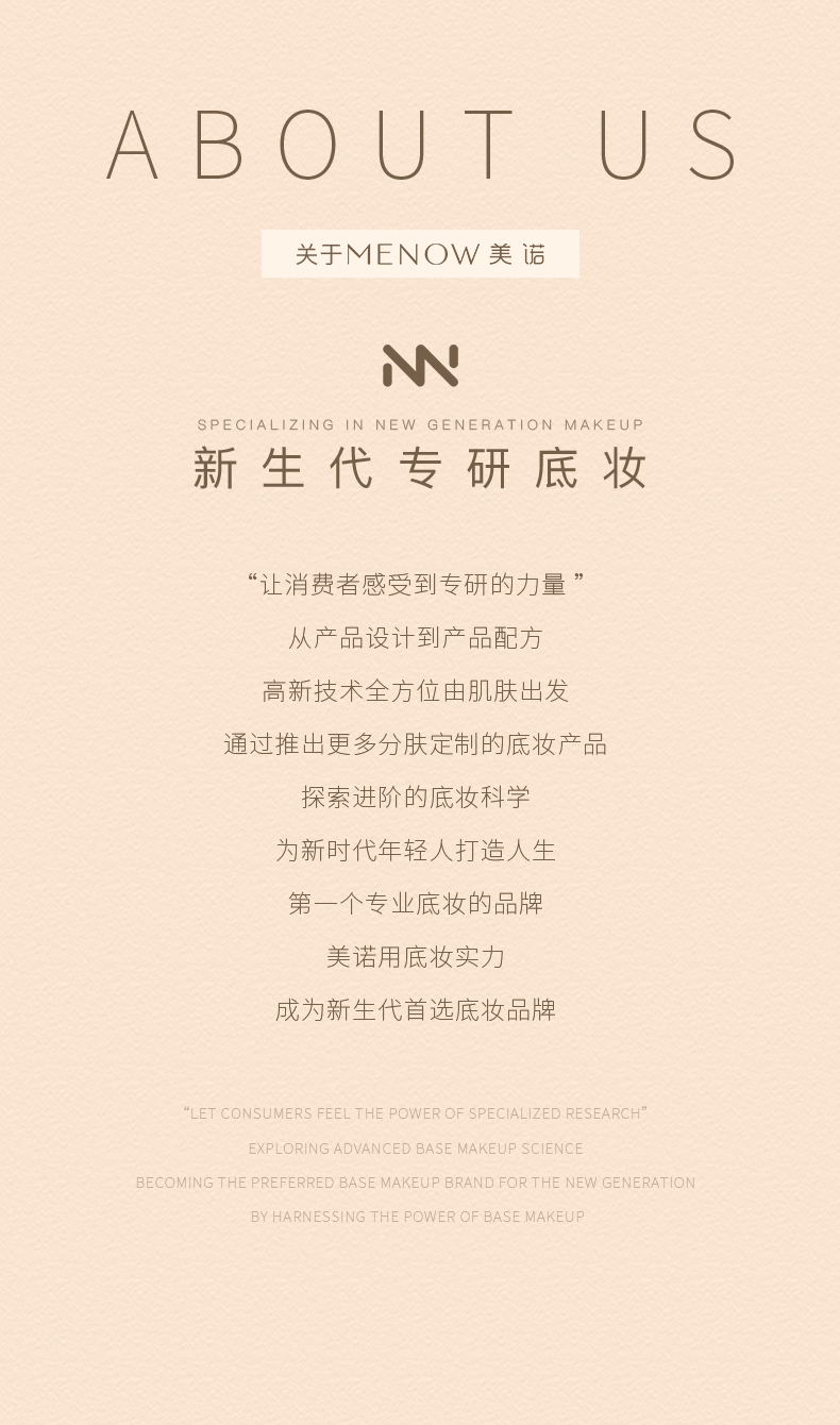 全球性彩妆品牌,专注开发高品质的适用性美妆产品。拥有20多年美妆经验,产品远销欧美等80多个国家。美诺彩妆致力于给用户带来“爱与美,年轻,不一样的品质彩妆体验”。