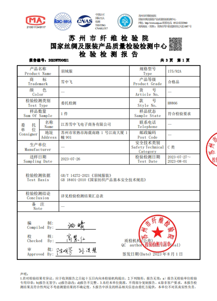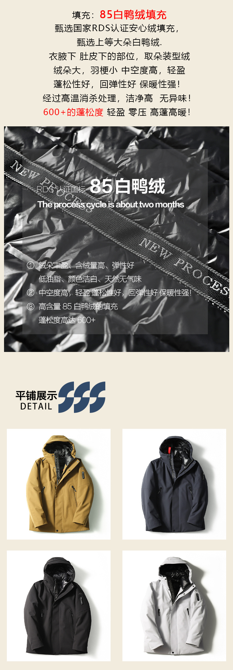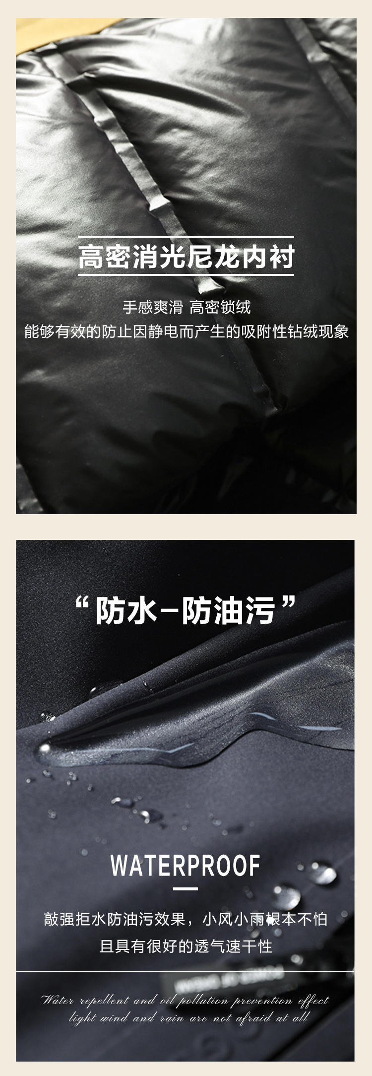 【材质】:面料:100%聚酯纤维(膜除外)里料一:100%锦纶 里料二:100%聚酯纤维填充物:白鸭绒(绒子含量85%)