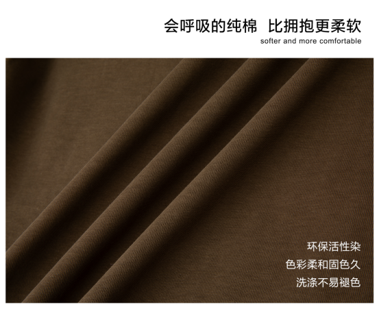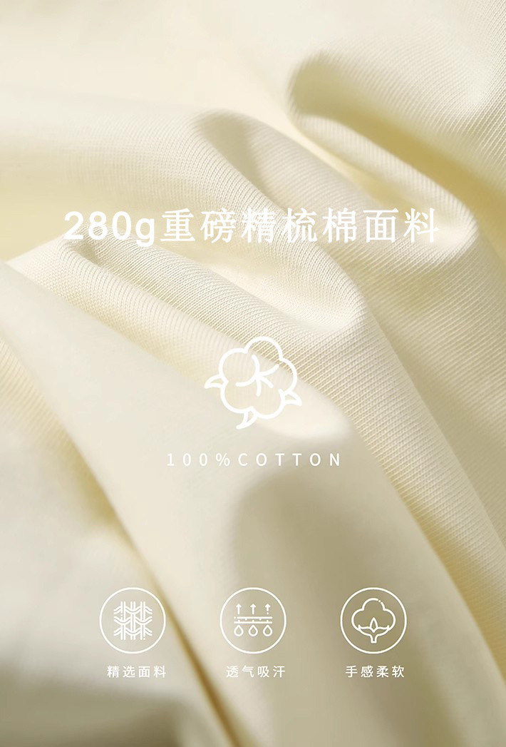 280g重磅精梳棉面料 像被云朵轻轻包裹 每一寸肌肤都在呼吸 触感糯滑,如婴儿服般细腻 穿上就不想脱下的温柔 高支纯棉编织,轻盈透气, 汗水瞬间蒸发 还你一身干爽。