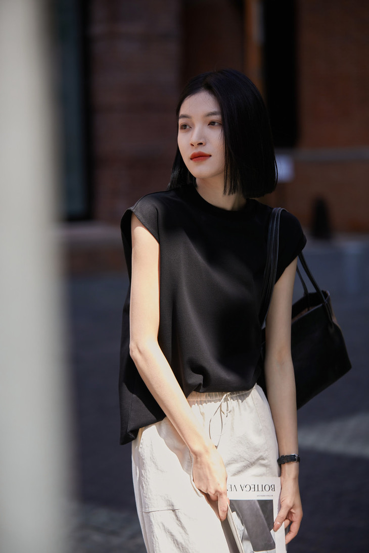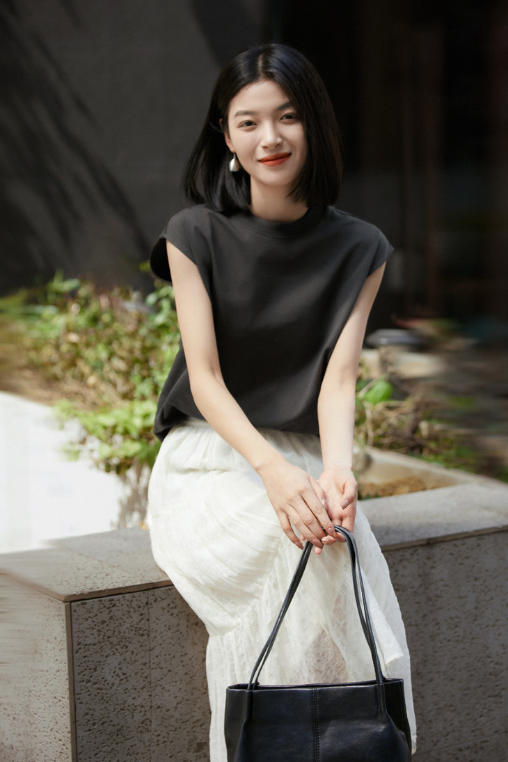 颜色展示 黑色 —— 永恒经典 🔹 特点 :显瘦神器|自带高级气场|不挑肤色|四季通用 🔹 穿搭公式 ▫️ 职场精英 :黑色盖肩短袖+米白西装裤+银色链条包(干练不沉闷) ▫️ 酷感街头 :黑色短袖+破洞牛仔裤+马丁靴+金属耳圈(美式复古风) ▫️ 约会小心机 :黑色短袖+酒红A字裙+珍珠项链(神秘优雅) ⚠️ 注意 :避免全身黑,用亮色配饰/露肤度 打破压抑感