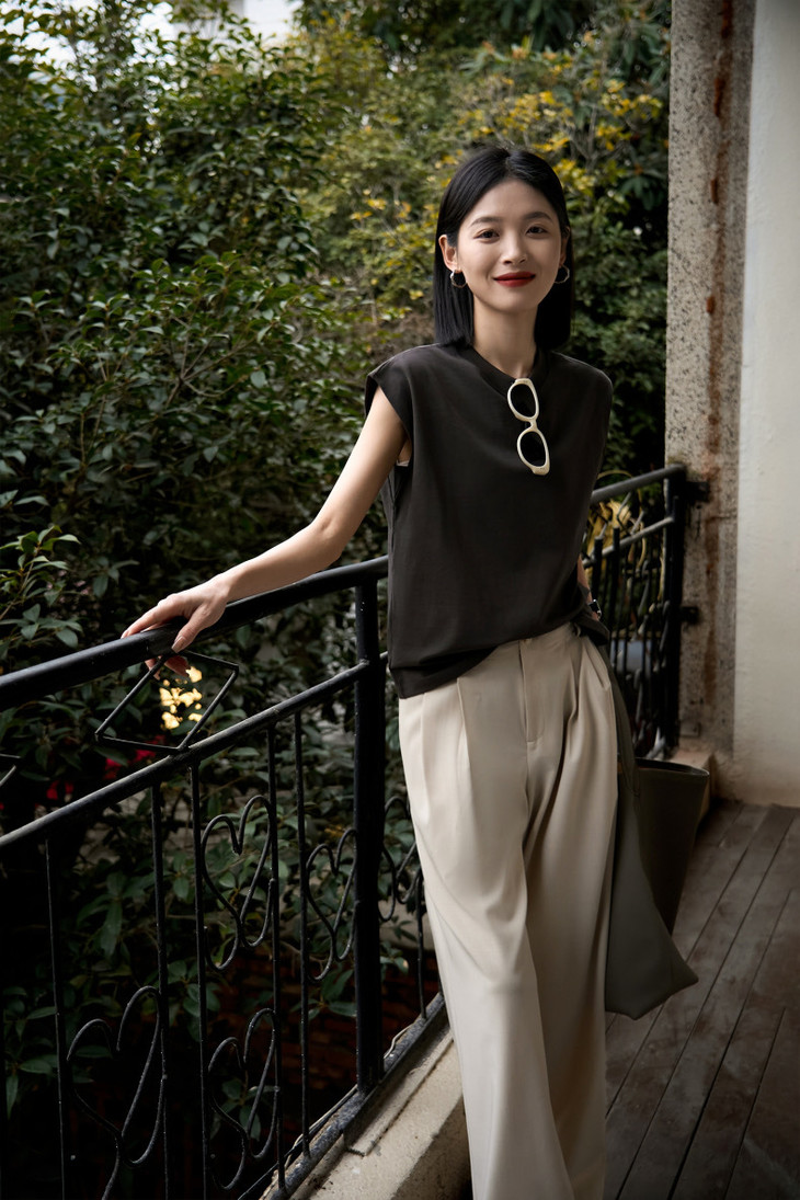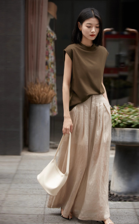 职场通勤——知性优雅风 ✅ 搭配公式 :咖色/深灰盖肩短袖 + 米色高腰裙裤 ✅ 风格亮点 :利落肩线修饰身形,垂坠裙裤增添高级感,金属配饰提升精致度,轻松驾驭职场气场! 适用场景 :通勤、会议、商务约会