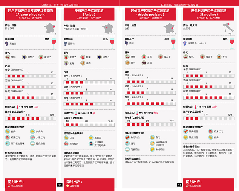 3.细节化!《7秒选对葡萄酒》从口感和酿造类型分类,让读者能快速找到适合自己口味的葡萄酒,同时,在具体讲解每种葡萄酒酒款时,又将香气、口感(丹宁、酒精、酸度)、陈年年数进行分级,让读者对每款葡萄酒有了全方位的了解。