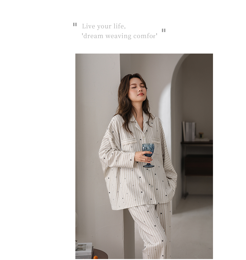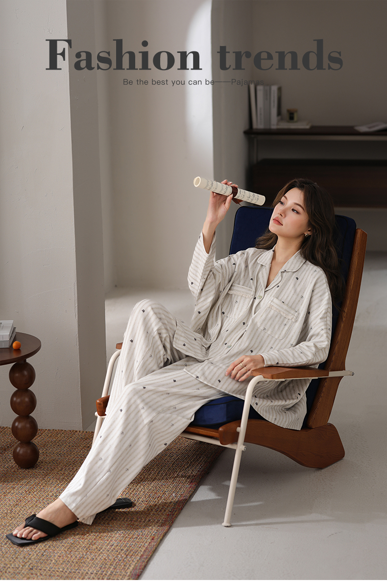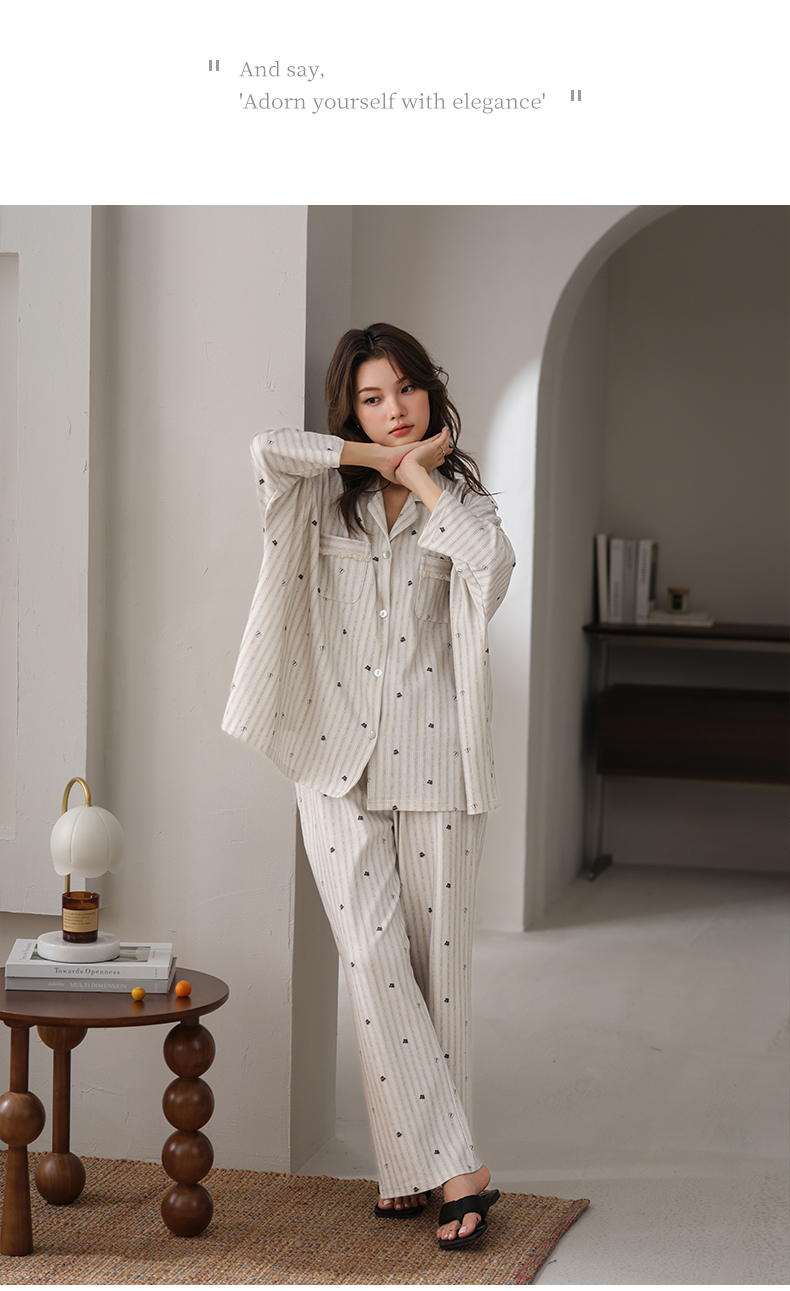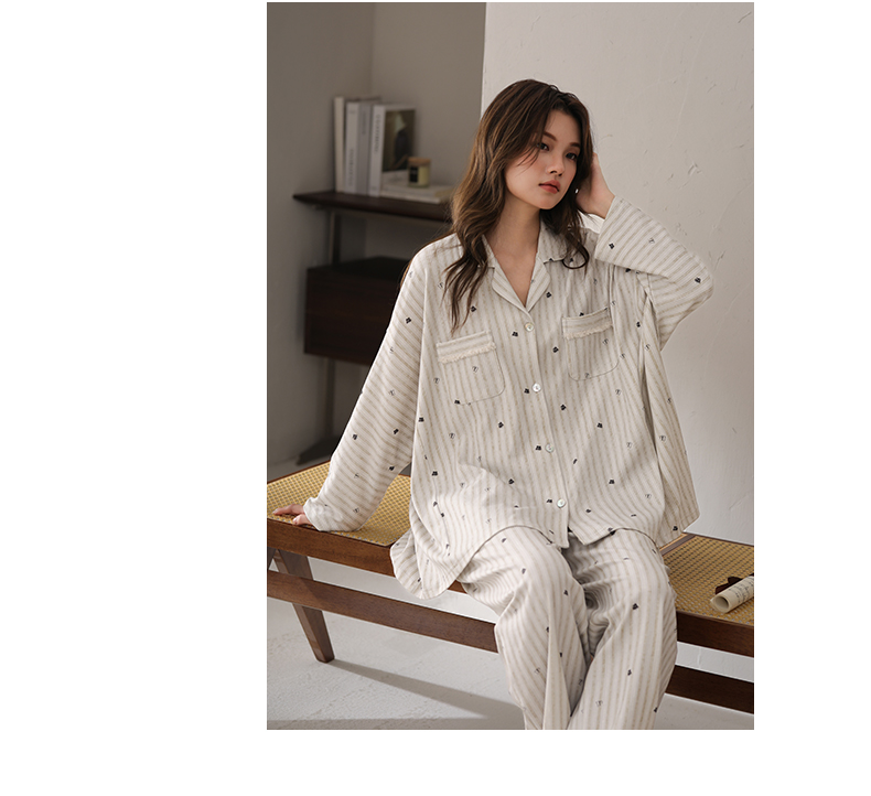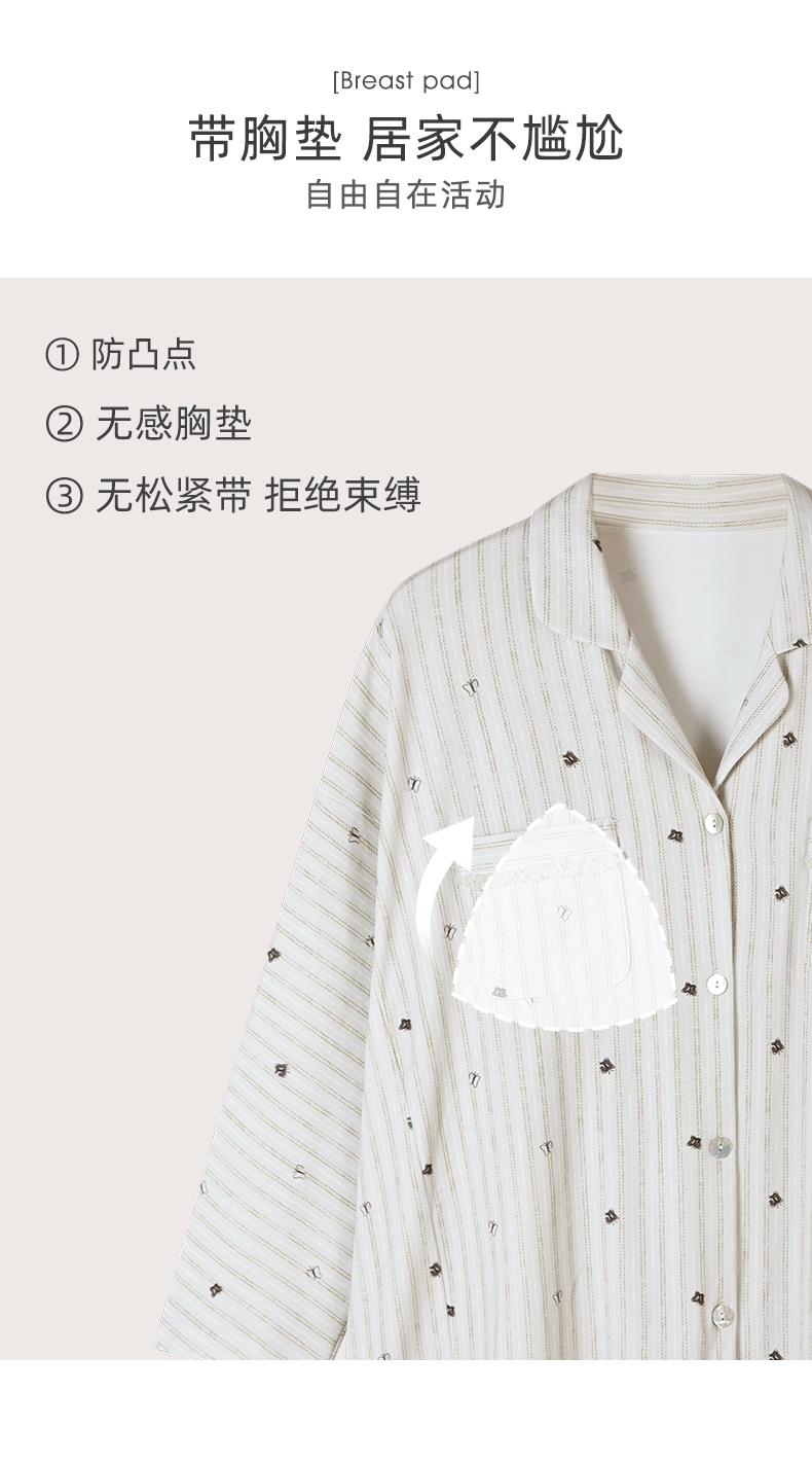 可人儿春秋季带胸垫泡泡绵女士长袖长裤睡衣可外出小众家居服套装