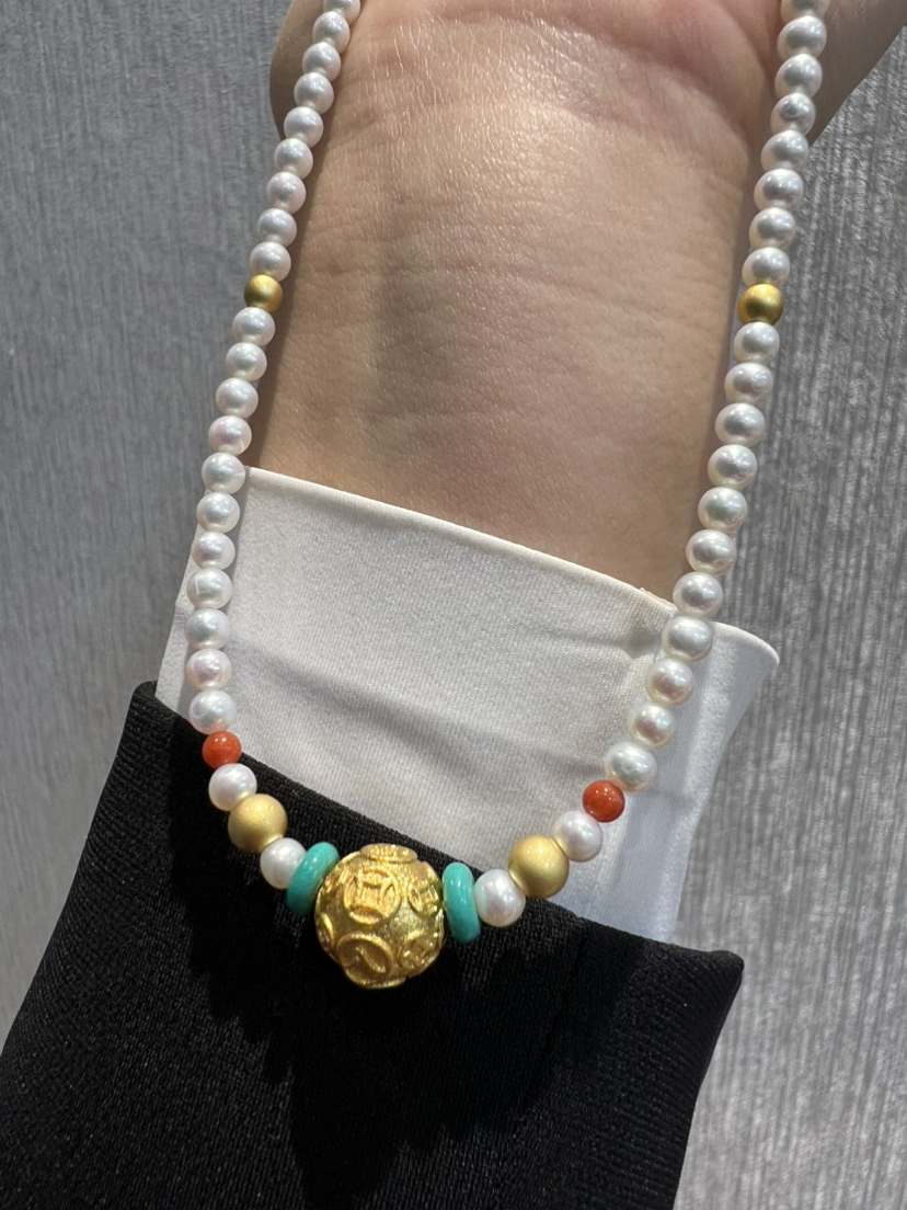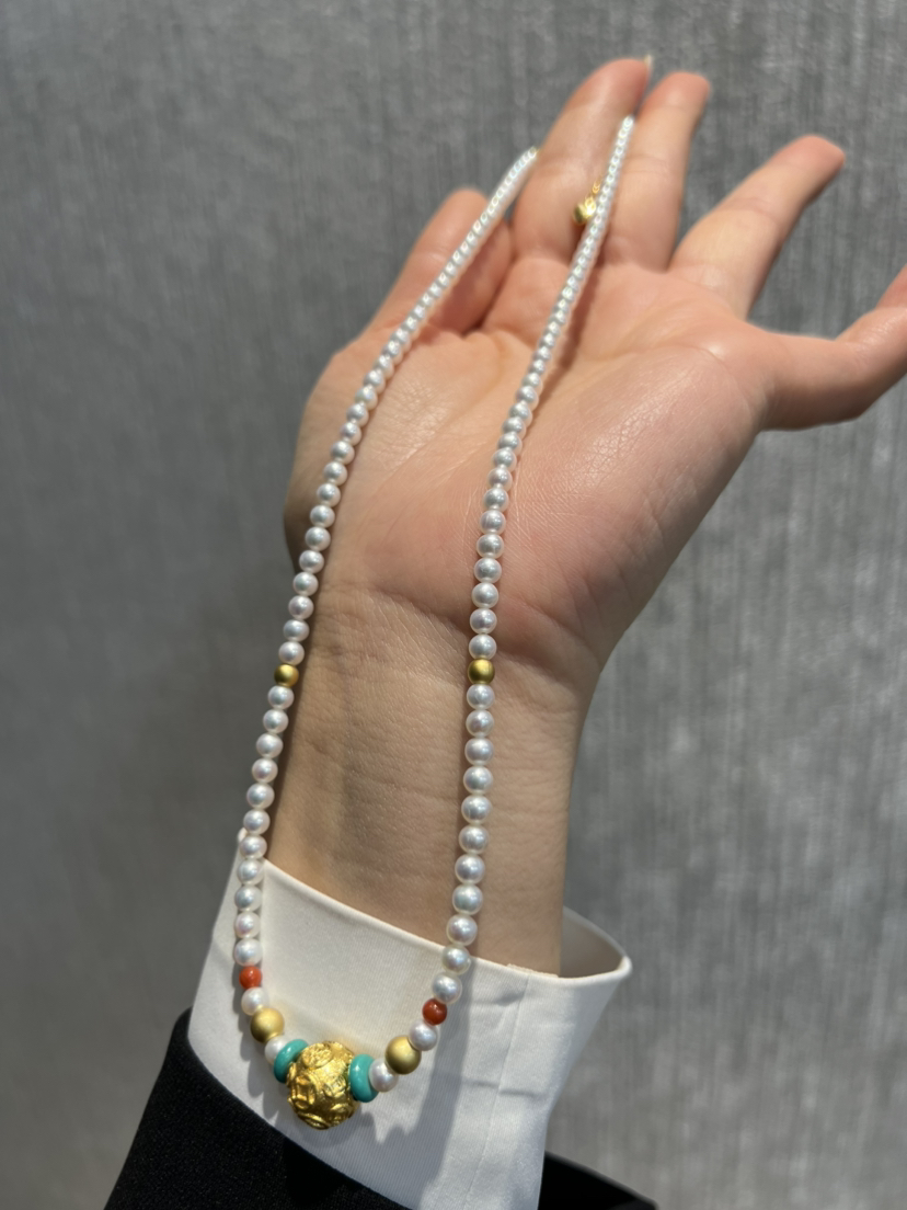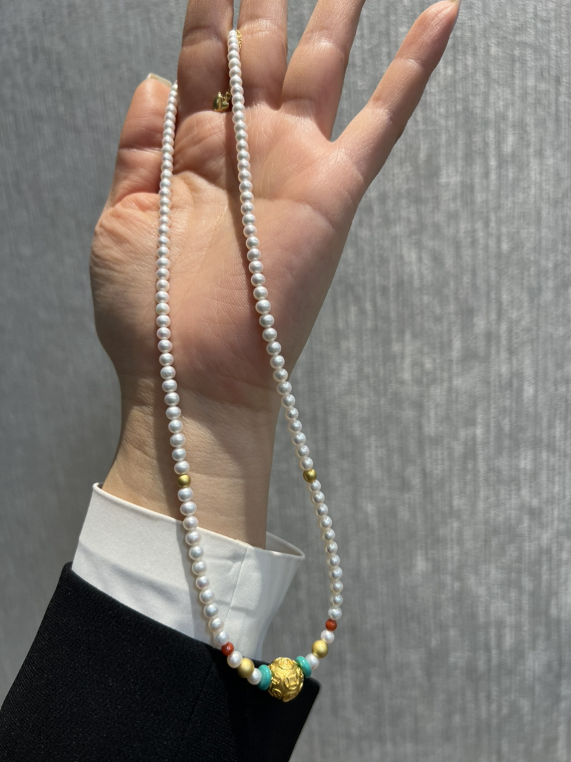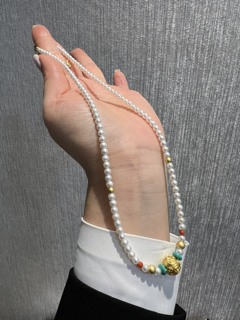 326-1 新中式4-4.5mm AK baby珍珠项链 古法高保色沙金"八方来财"路路通!