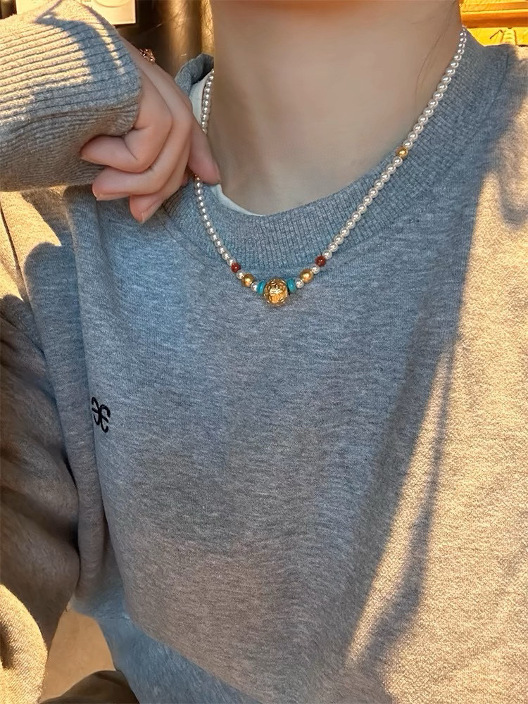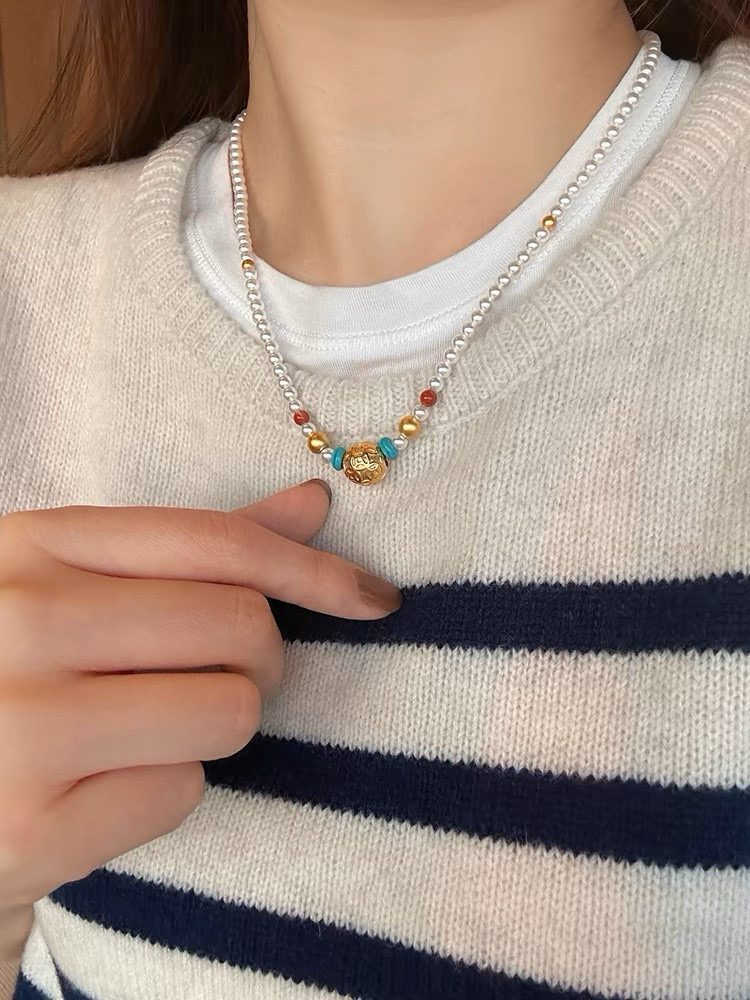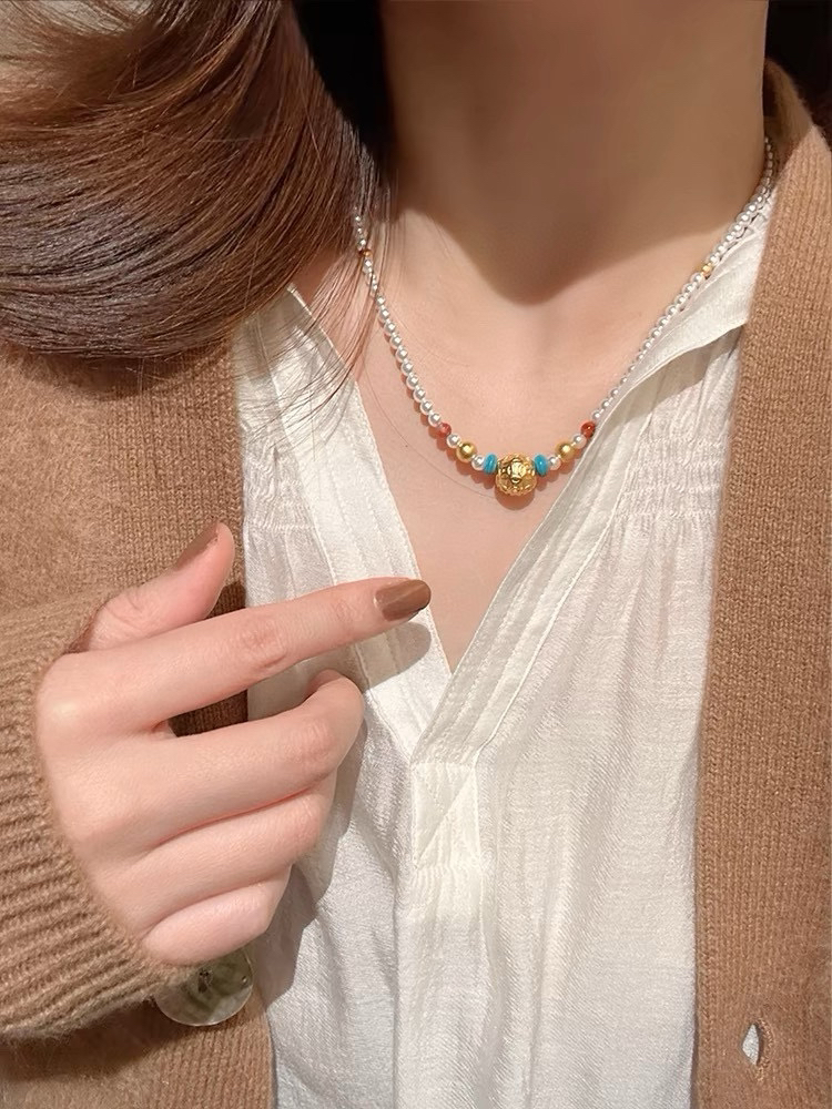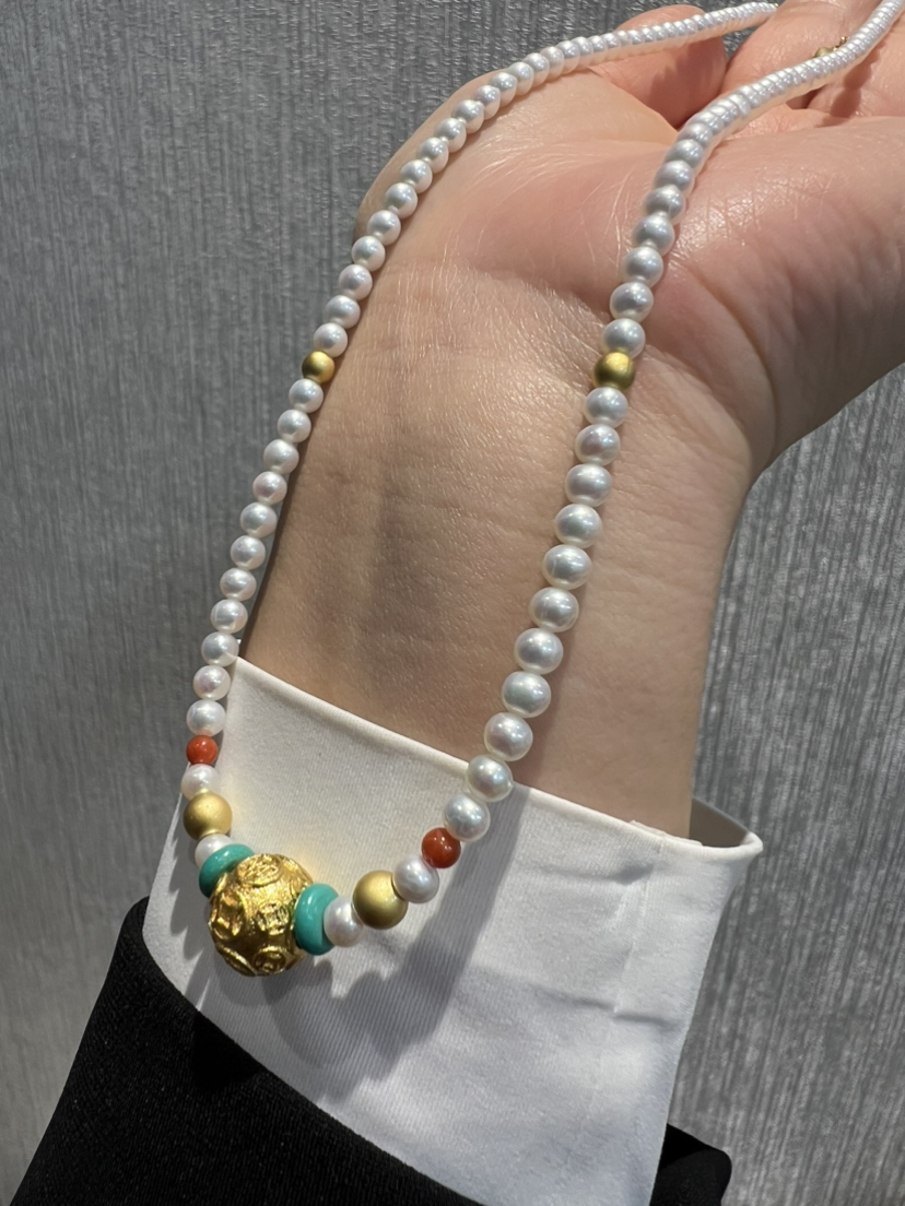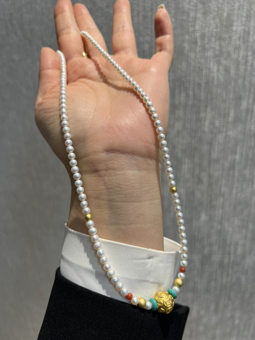 326-1 新中式4-4.5mm AK baby珍珠项链 古法高保色沙金"八方来财"路路通!