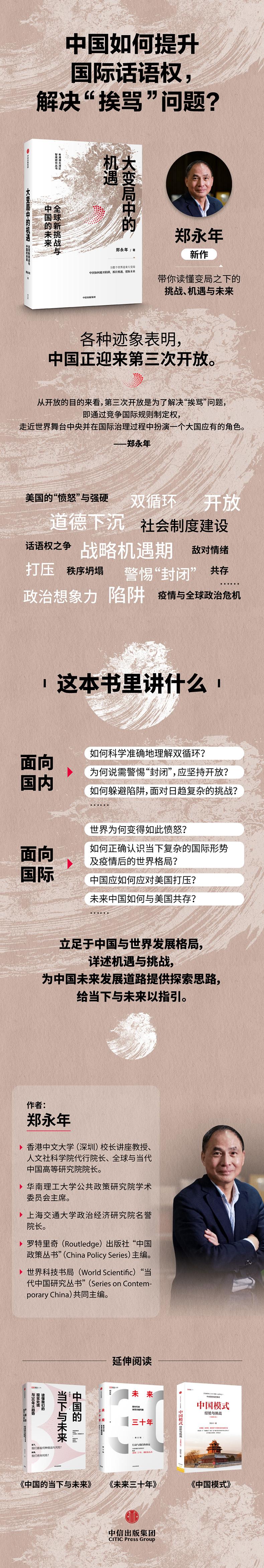 当世界迎来大变局,中国未来经济、政治当如何在风浪之中捕捉机会与空间?面向国内:如何科学准确地理解双循环?为何说需警惕“封闭”,应坚持开放?如何躲避陷阱,面对日趋复杂的挑战?面向国际:世界为何变得如此愤怒?如何正确认识当下复杂的国际形势及疫情后的世界格局?中国应如何应对美国打压?未来中国如何与美国共存?作者立足于后疫情时代的中国与世界发展格局,对中国面临的挑战与机遇进行详细阐述,为中国未来发展道路提供探索思路,为中国如何通过竞争国际规则制定权,走近世界舞台中央并且在国际治理过程中扮演一个大国应有的角色提供专业分析,给当下与未来以指引。