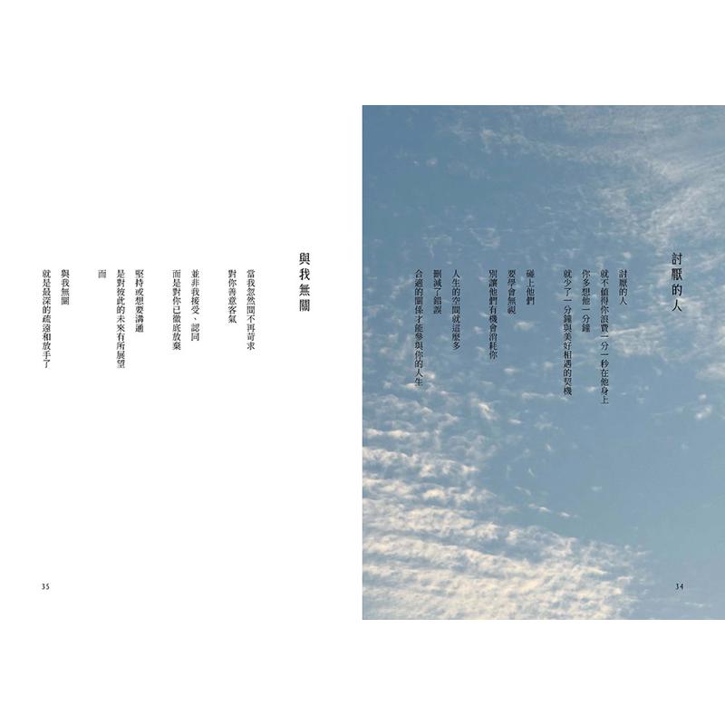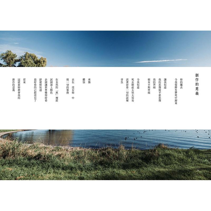 原子邦妮毫无压力的文字与大地天空的自然摄影,完美组合,呈现了这个世代的想望。照亮前景的,是光,是和你一起往前走的同心协力。我们虽然披着伤,但也饱满富足,因为风景不断。