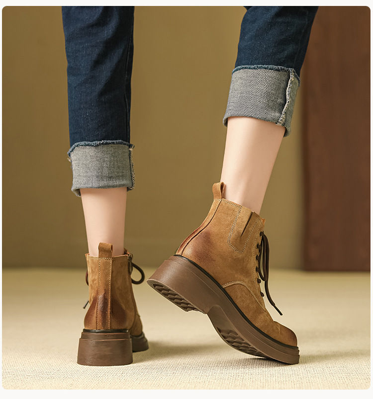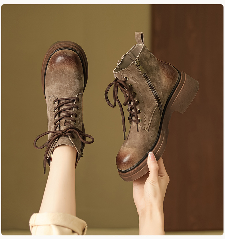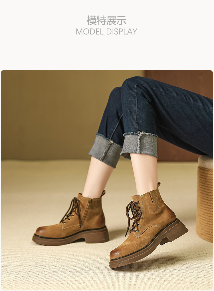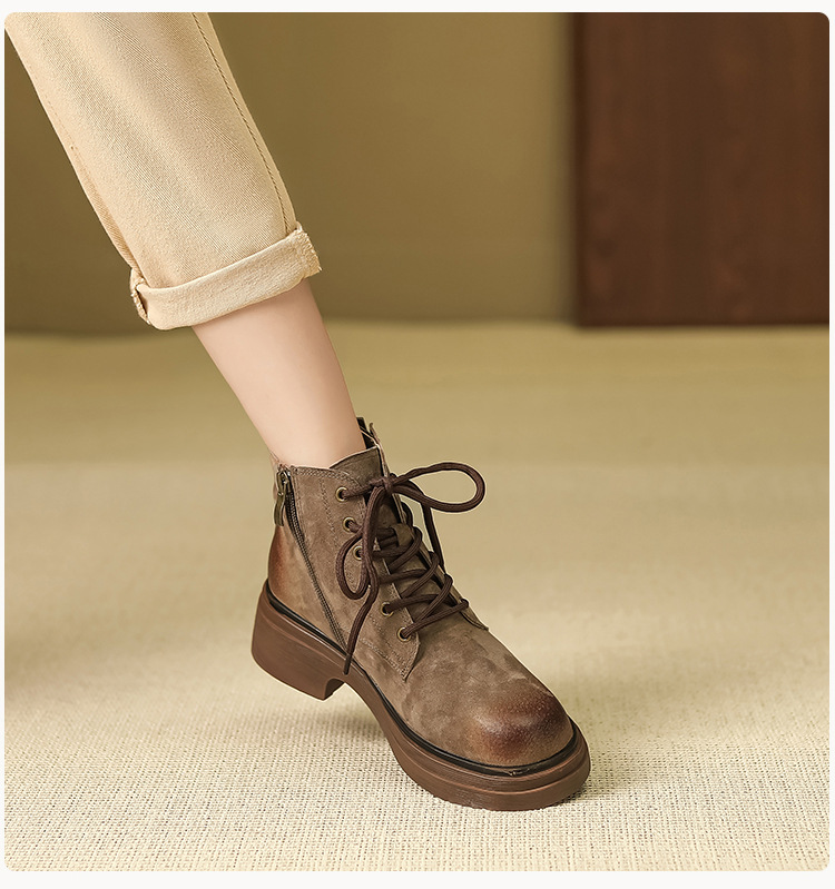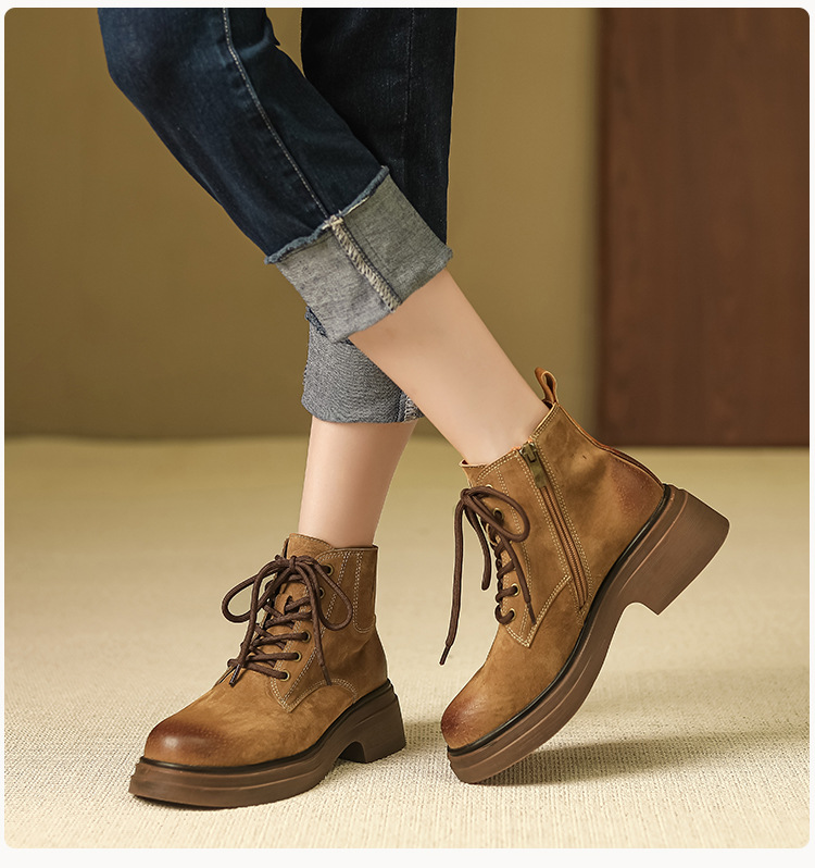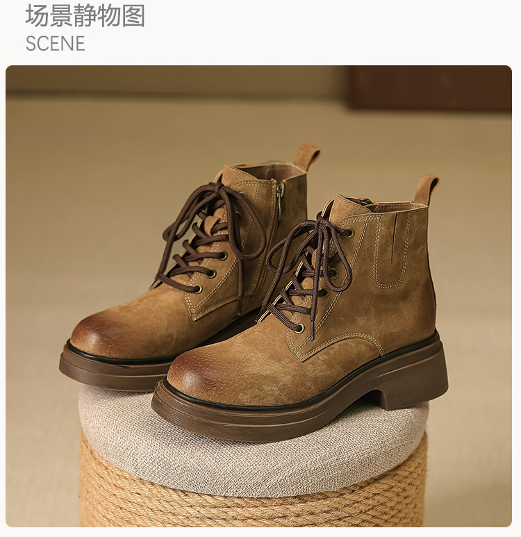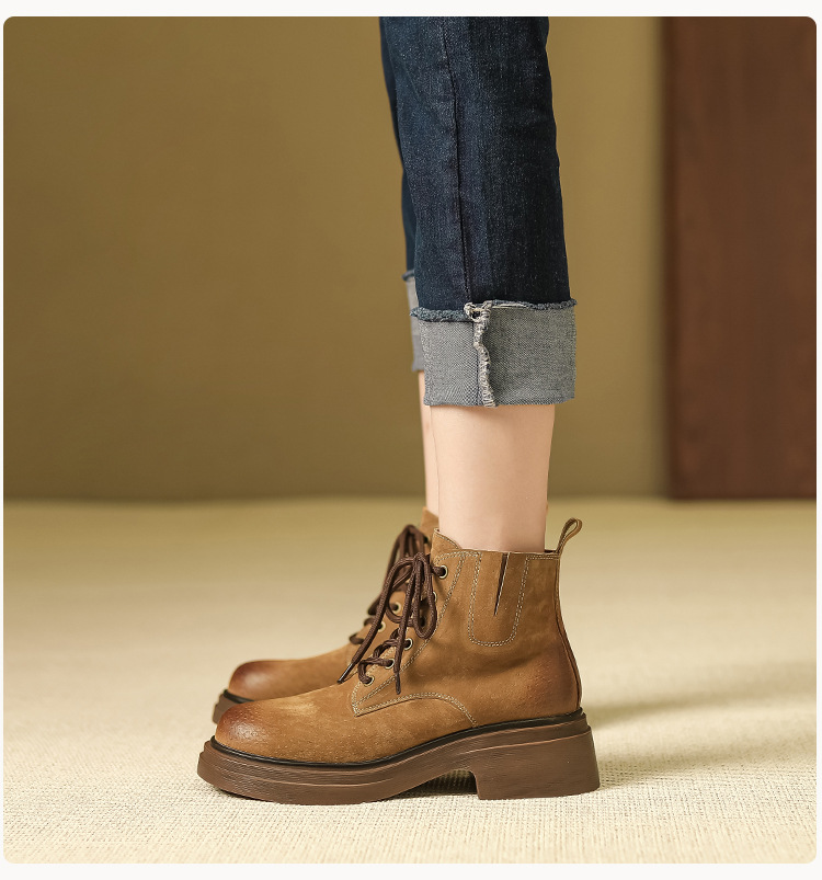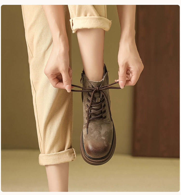 【女鞋专场】全真皮复古时尚系带马丁靴女2023年秋冬新款圆头厚底擦色短靴女款