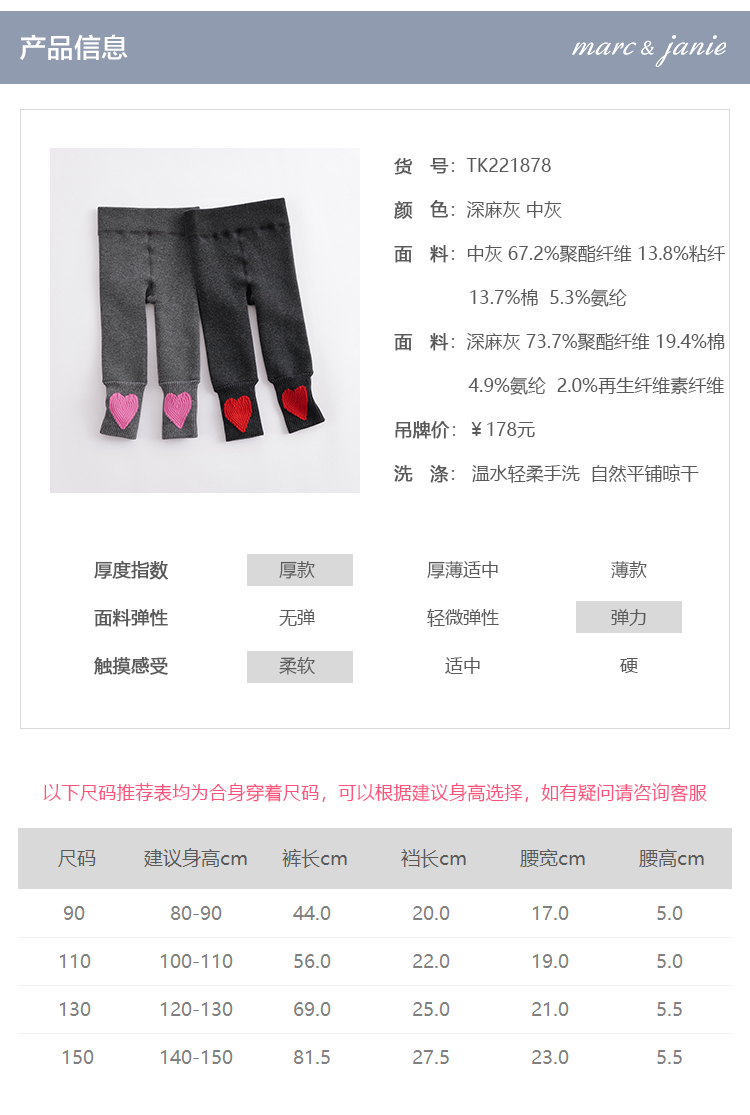 马克珍妮秋冬新款 女童弹力加厚打底裤 儿童裤子221878