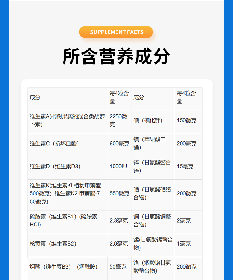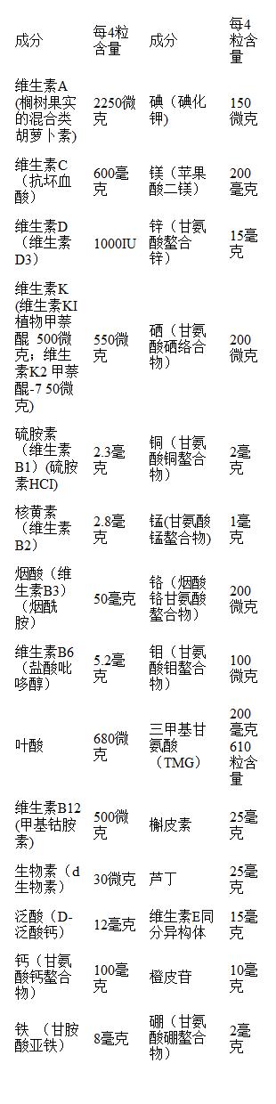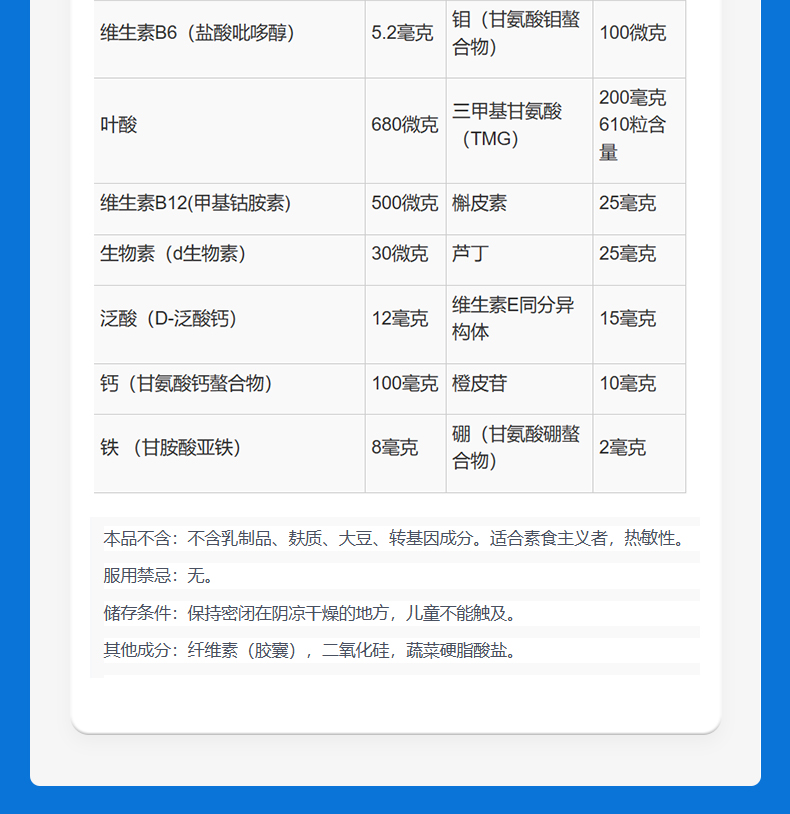成分:复合维生素矿物质、三甲基甘氨酸(TMG)、槲皮素、芦丁、橙皮苷。