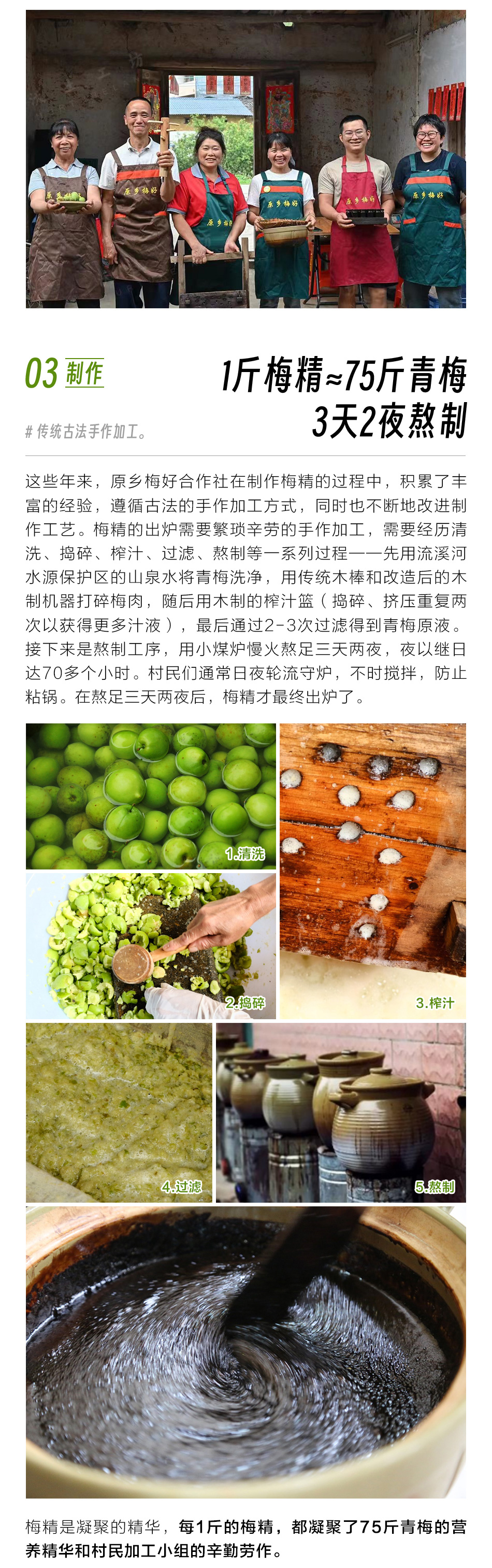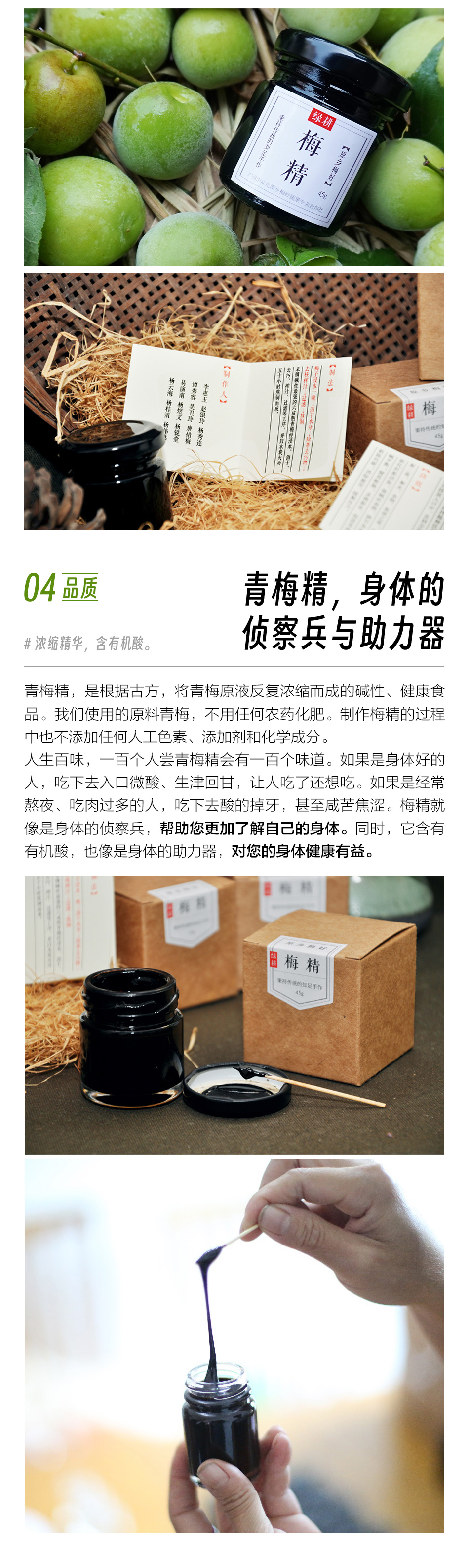 【品牌】:原乡梅好 【品名】:青梅精 【产品类别】:果糕类 【配料】:青梅 【净含量】:45克 【保质期】:三年 【贮存方法】:置于阴凉干燥处,室温保存即可。 【建议食用方法及食用量】:用干净的竹筷子或牙签蘸取梅精约黄豆粒大小,直接放入口中含化,或放入温开水中搅拌稀释饮用。 【温馨提示】: 1.本品不能替代药品。 2.开封后请尽快食用完毕。 3.本产品开封后若暴露在空气中,可能会吸潮变稀。 4.勿用金属制品。 5.女性经期请勿食用。肠胃不适者建议饭后食用。 |