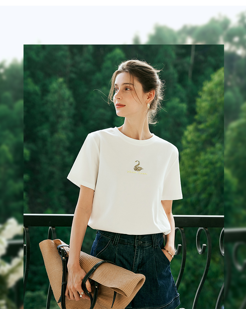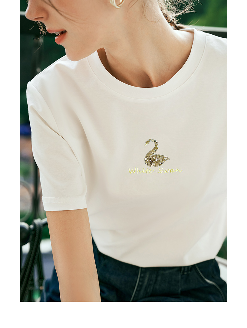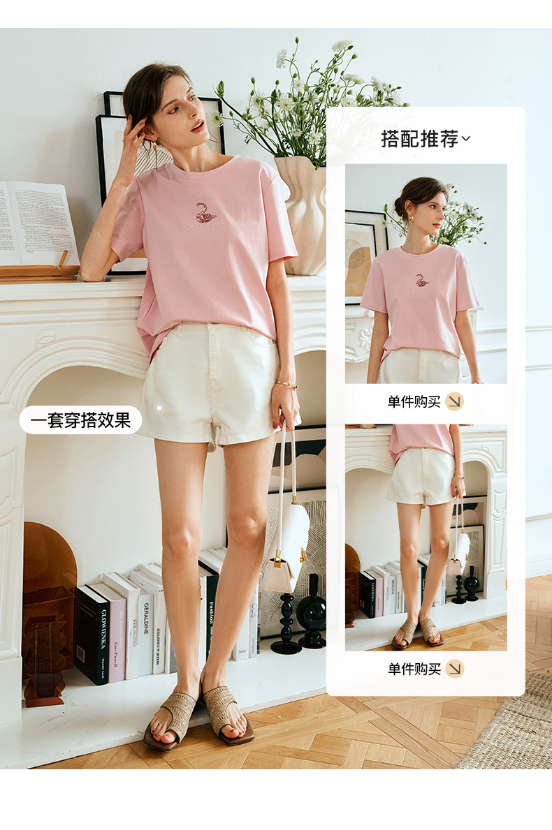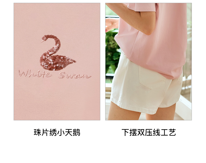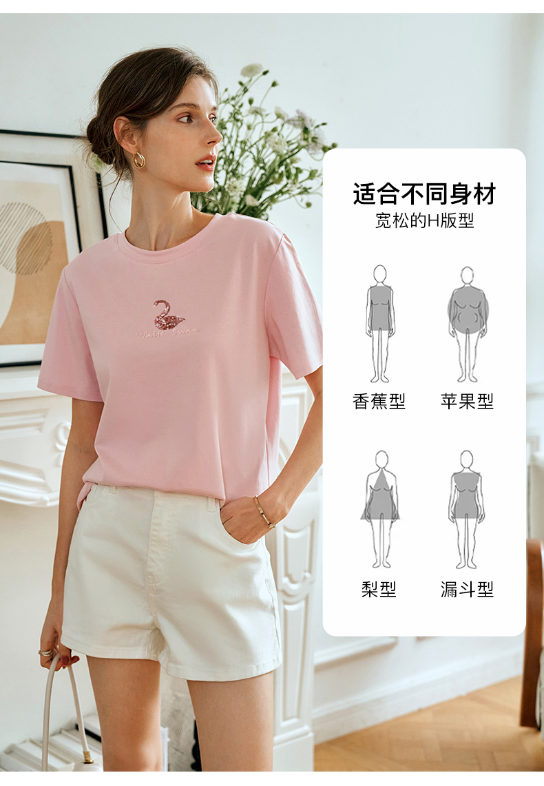 OLrain欧芮儿粉色短袖T恤女夏季通勤立体精致珠片绣上衣圆领体恤