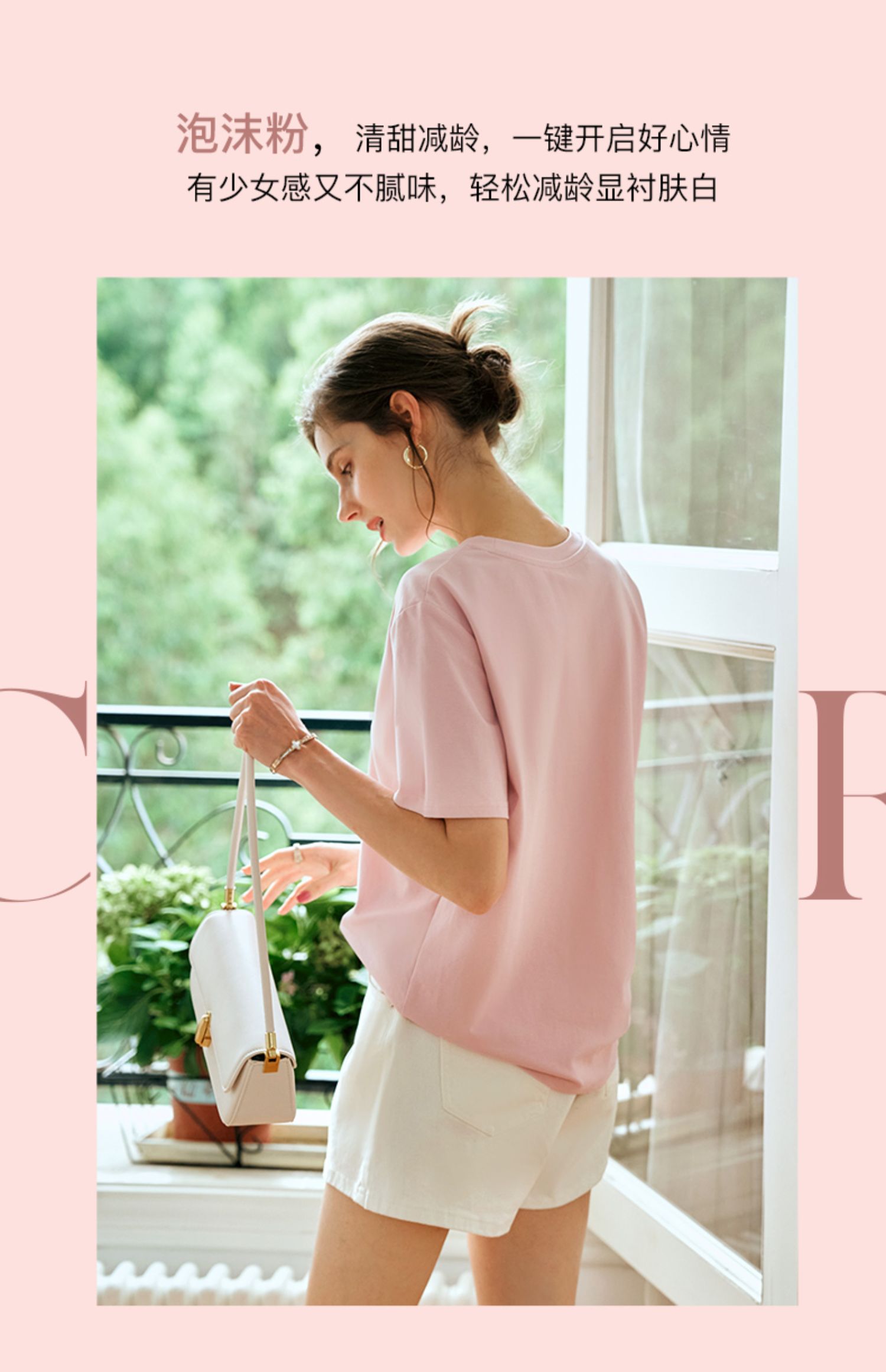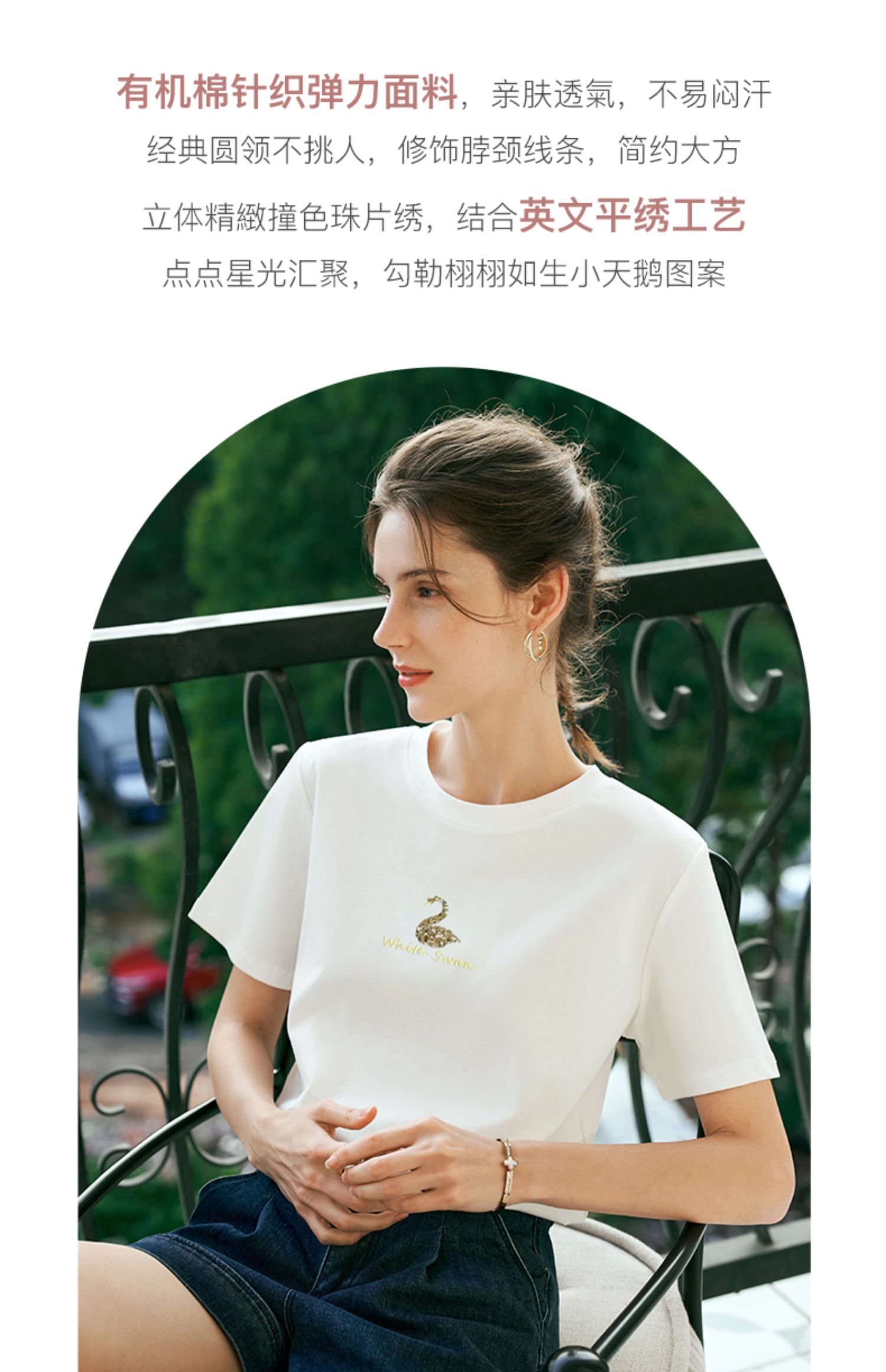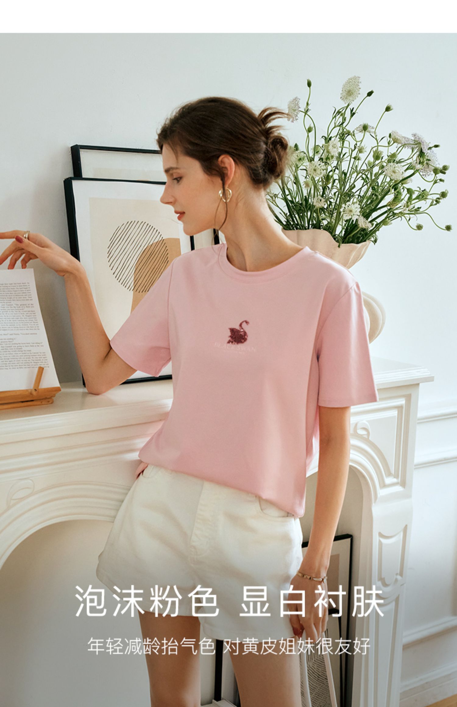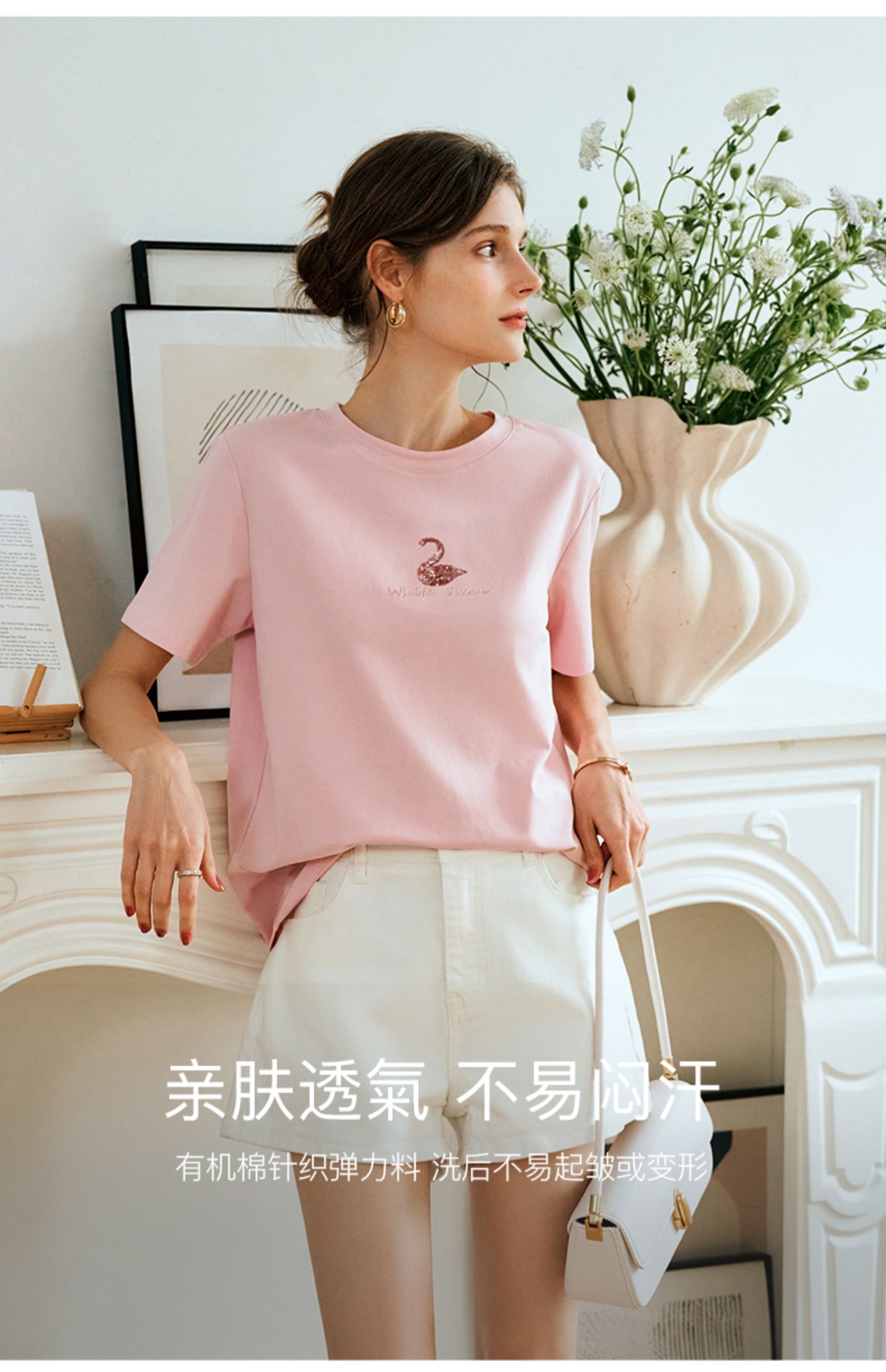 OLrain欧芮儿粉色短袖T恤女夏季通勤立体精致珠片绣上衣圆领体恤