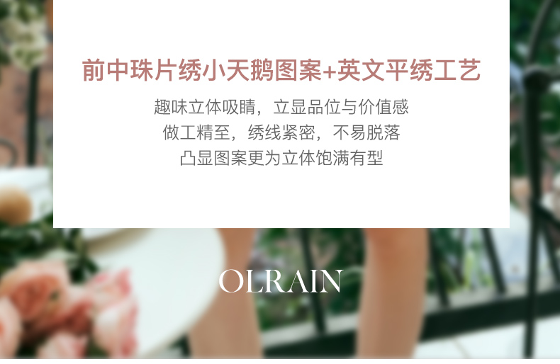 - “精致”是欧芮儿olrain品牌文化的核心,欧芮儿认为,精致的女人,不但要外在动人,更要内在迷人,内外兼修,有魅力、有气质、有内涵,自信而不自傲,优雅而不矫揉,自有万种风情而不轻浮,更不故作矜持。