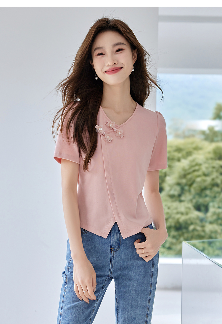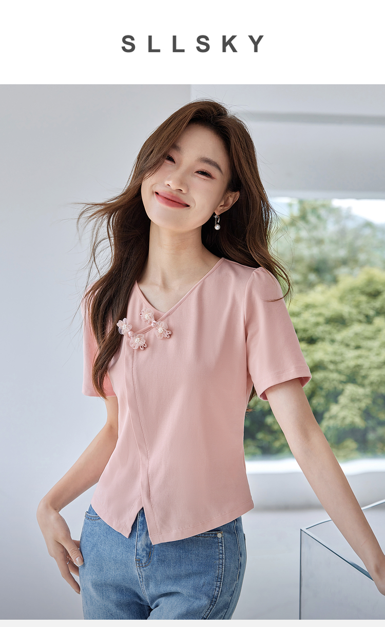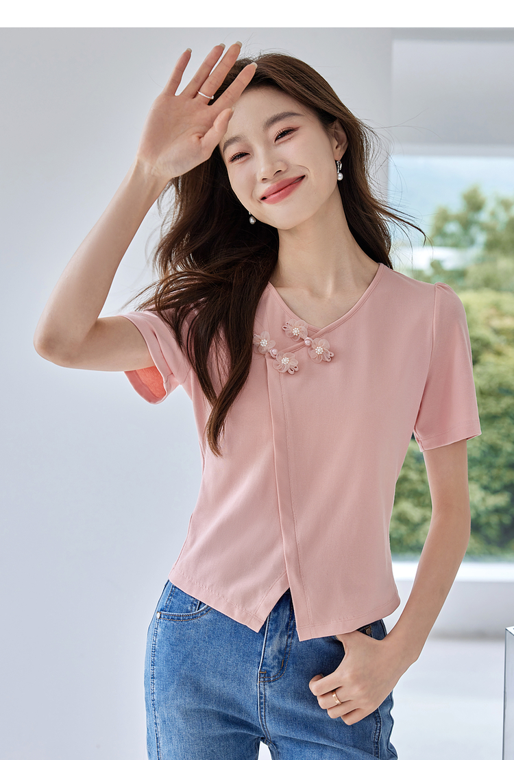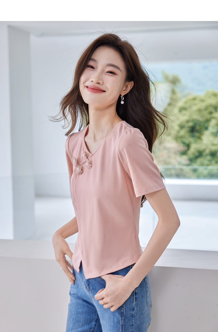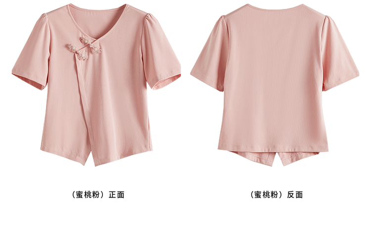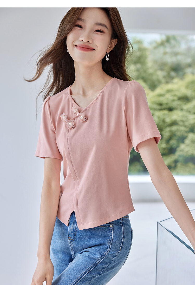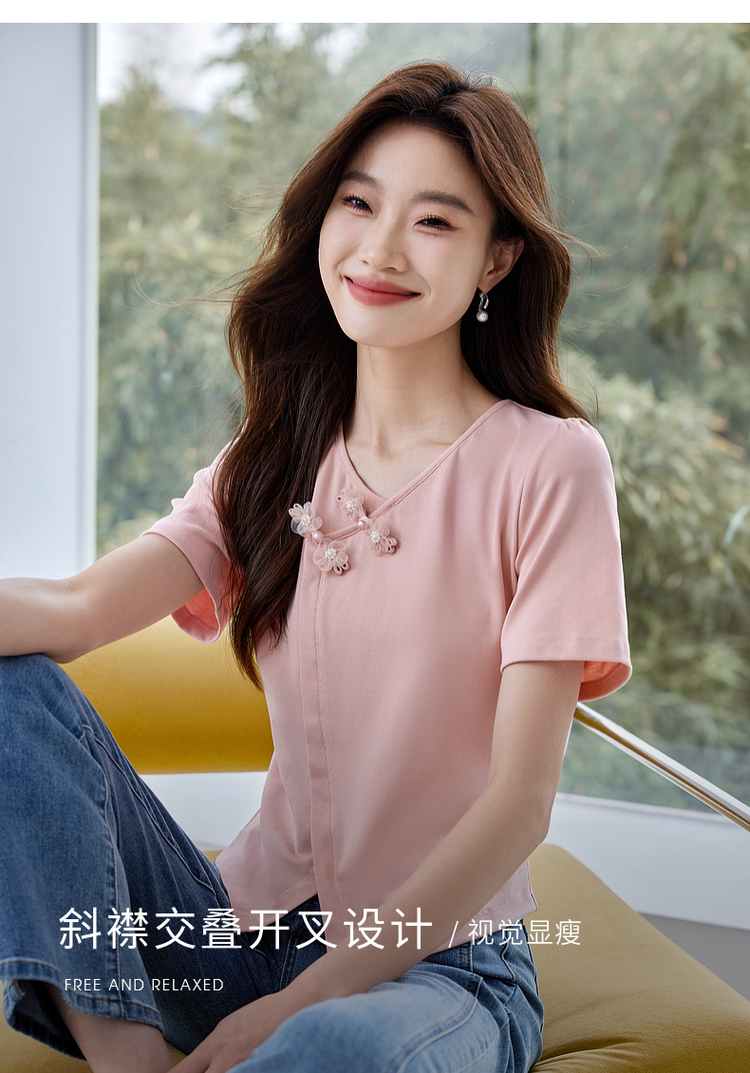 【五折购】熙世界粉色国风盘扣开叉V领正肩T恤短袖夏季独特别致新中式上衣