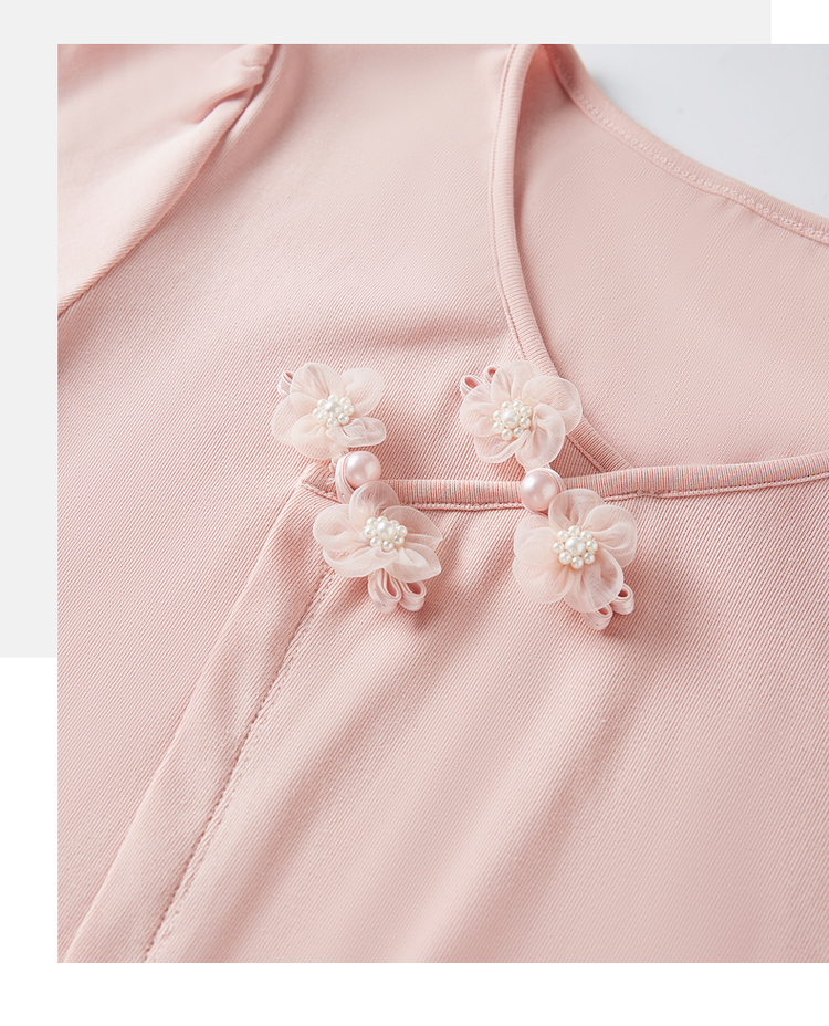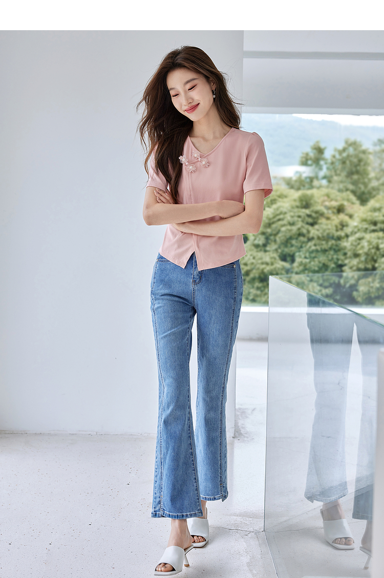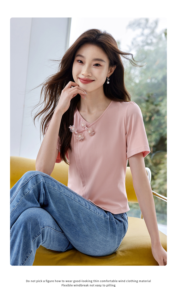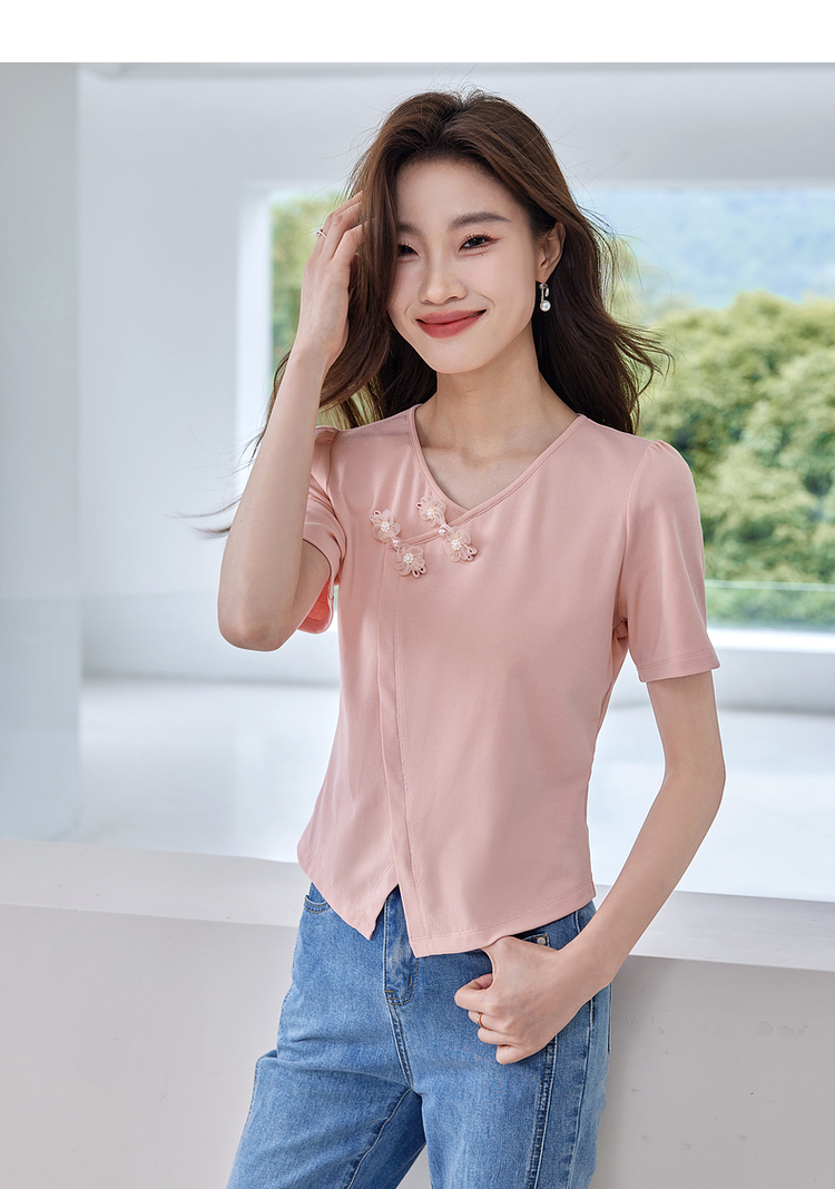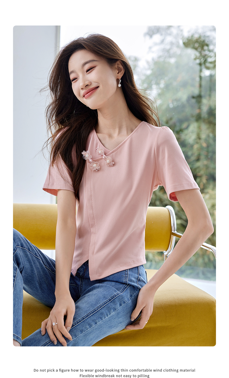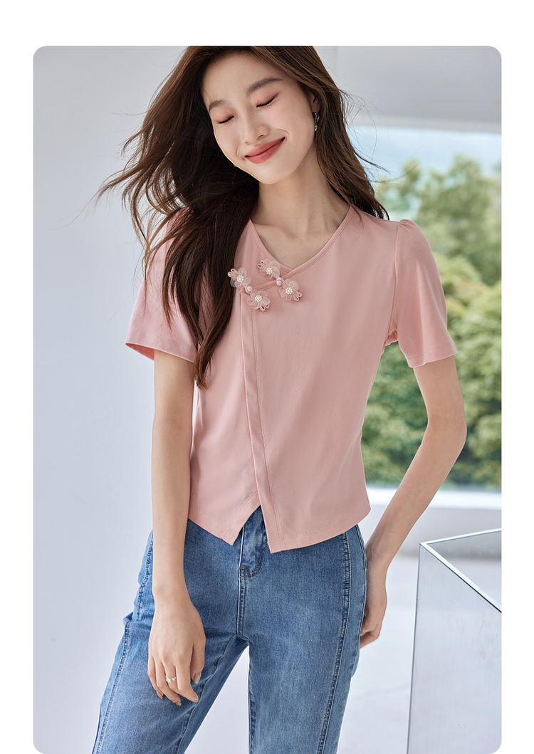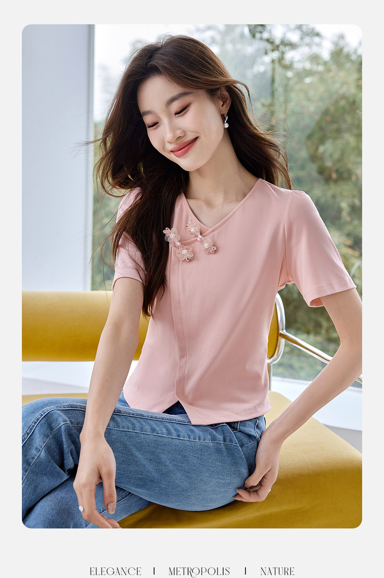 【五折购】熙世界粉色国风盘扣开叉V领正肩T恤短袖夏季独特别致新中式上衣