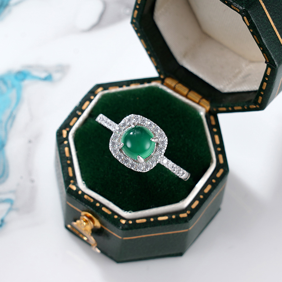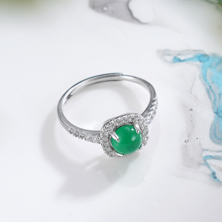 【寓意】:方形纯银戒托,镶嵌饱满绿玉髓,青白主色调,似夏夜清辉漫溢指畔,为佩戴者指引前路,带来希望。
