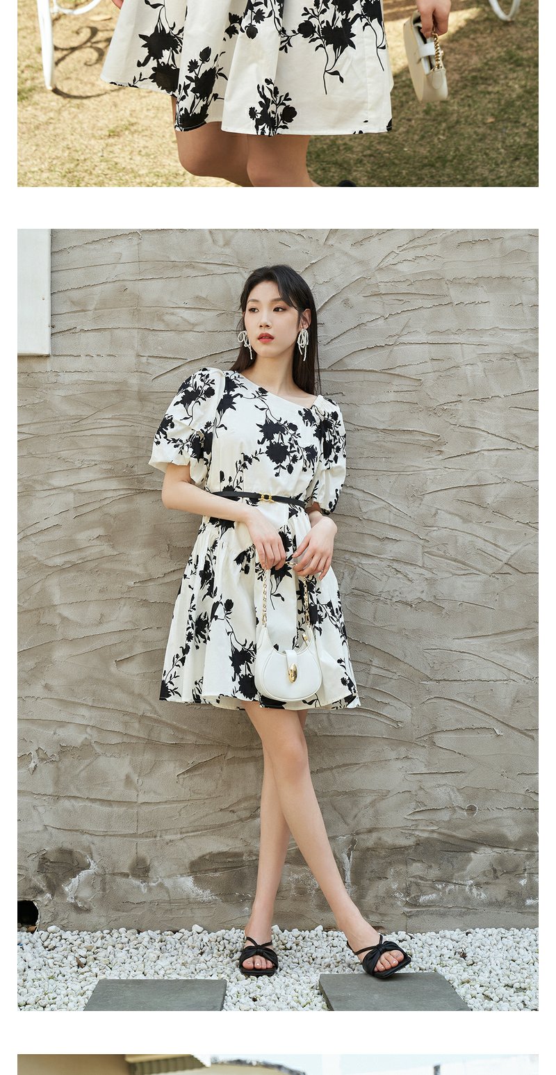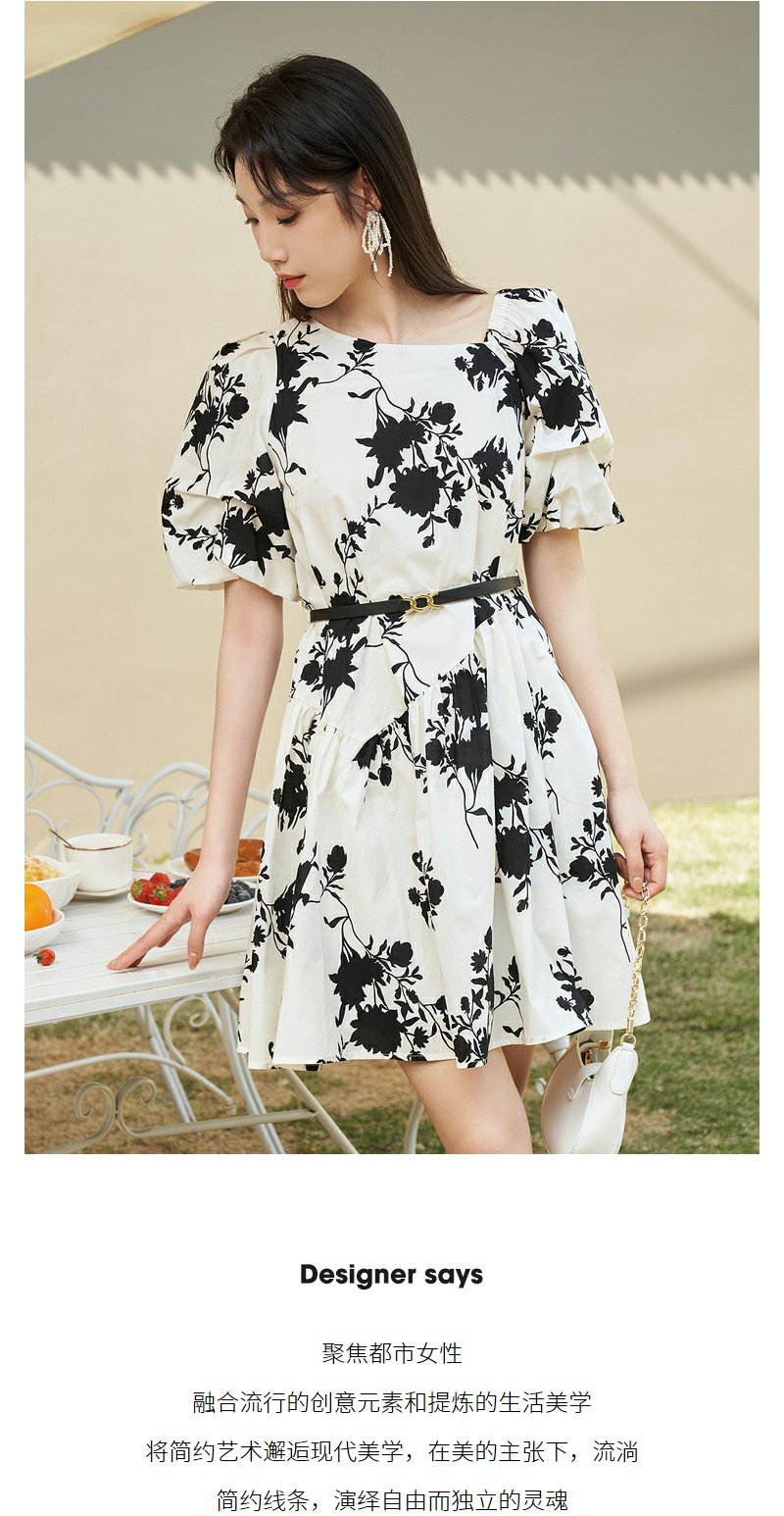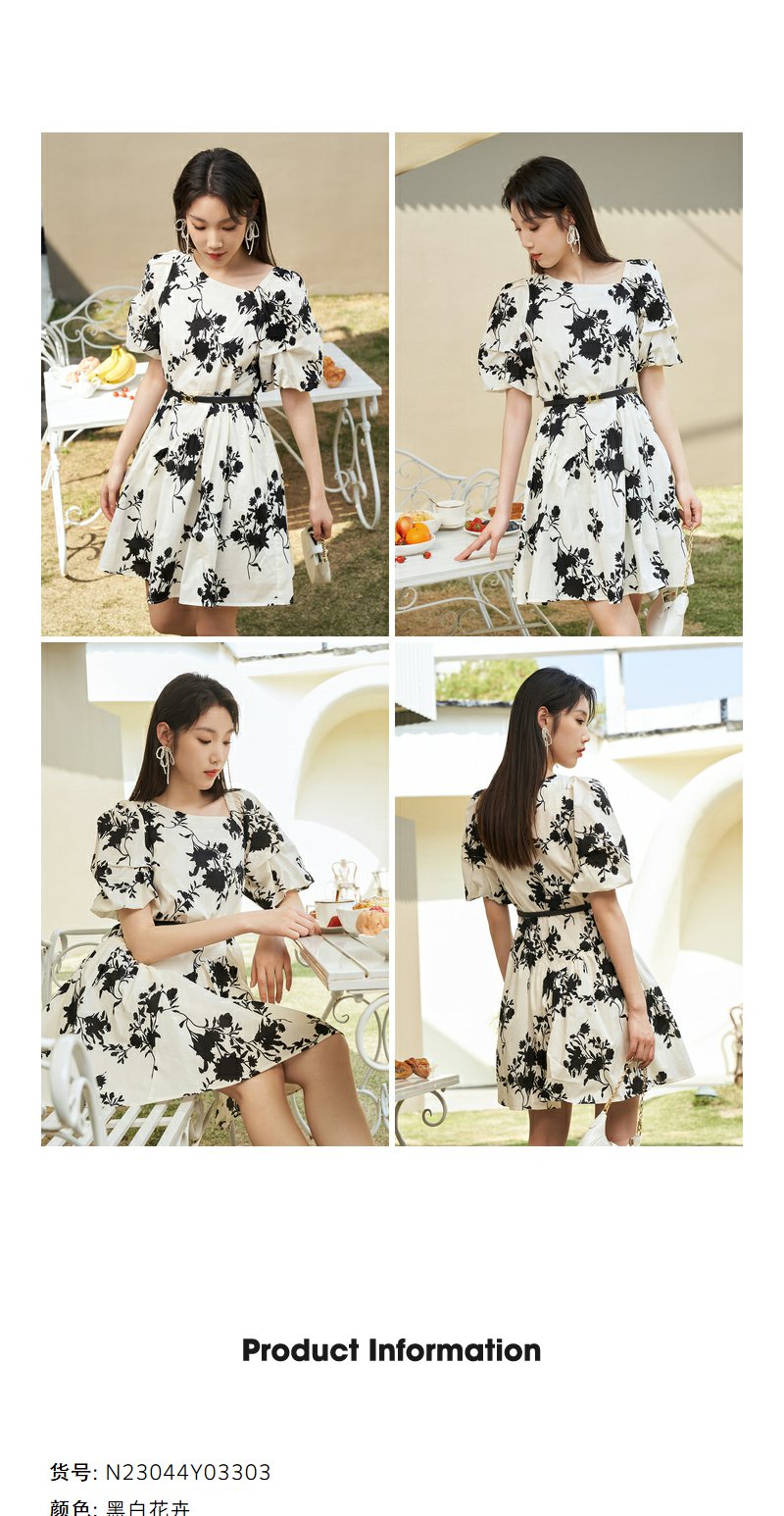 NEELLY纳俪商场同款气质印花连衣裙女不对称领口灯笼袖A字裙中长N23044Y03303