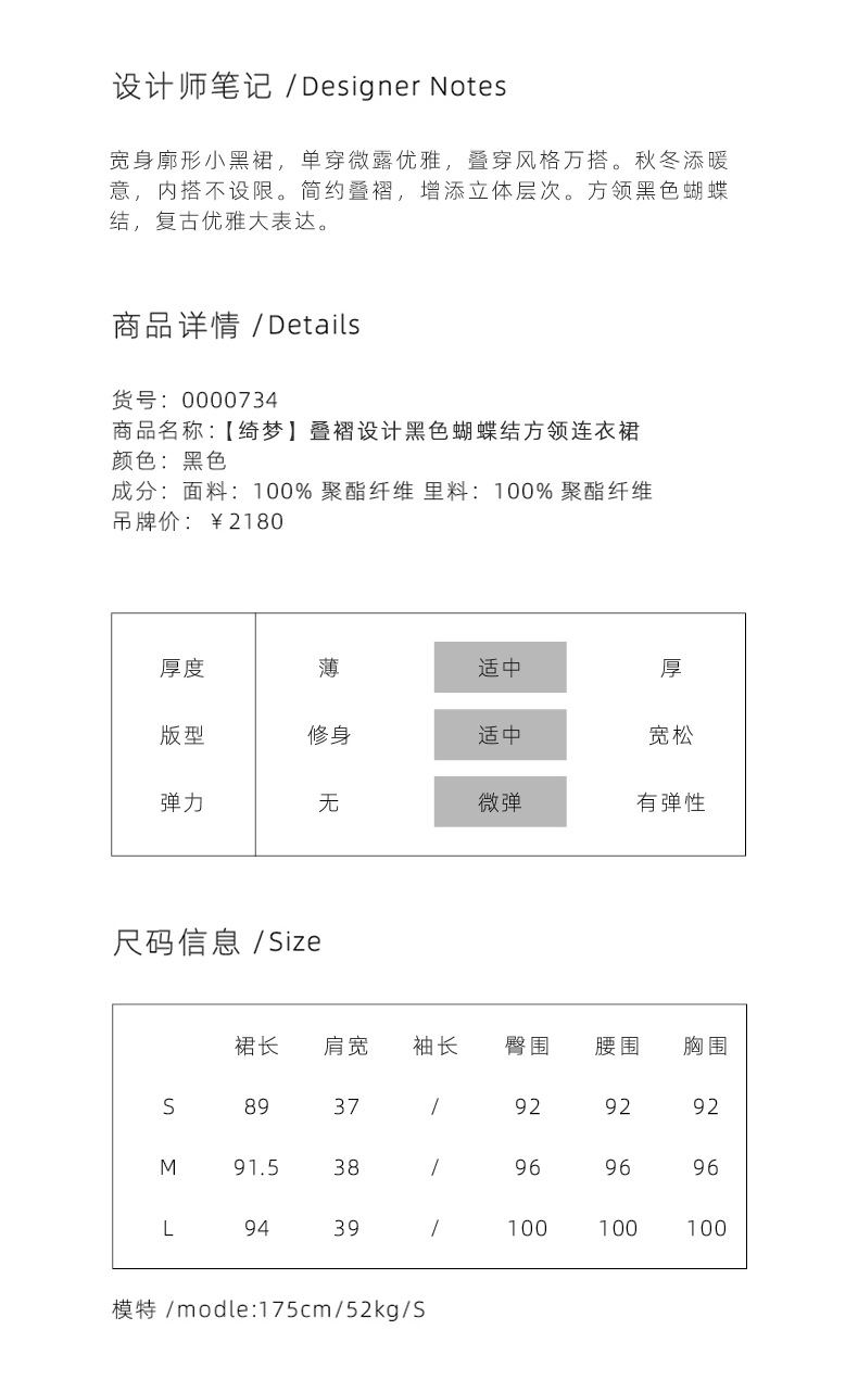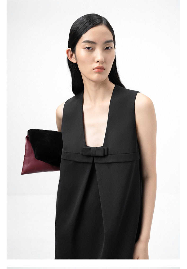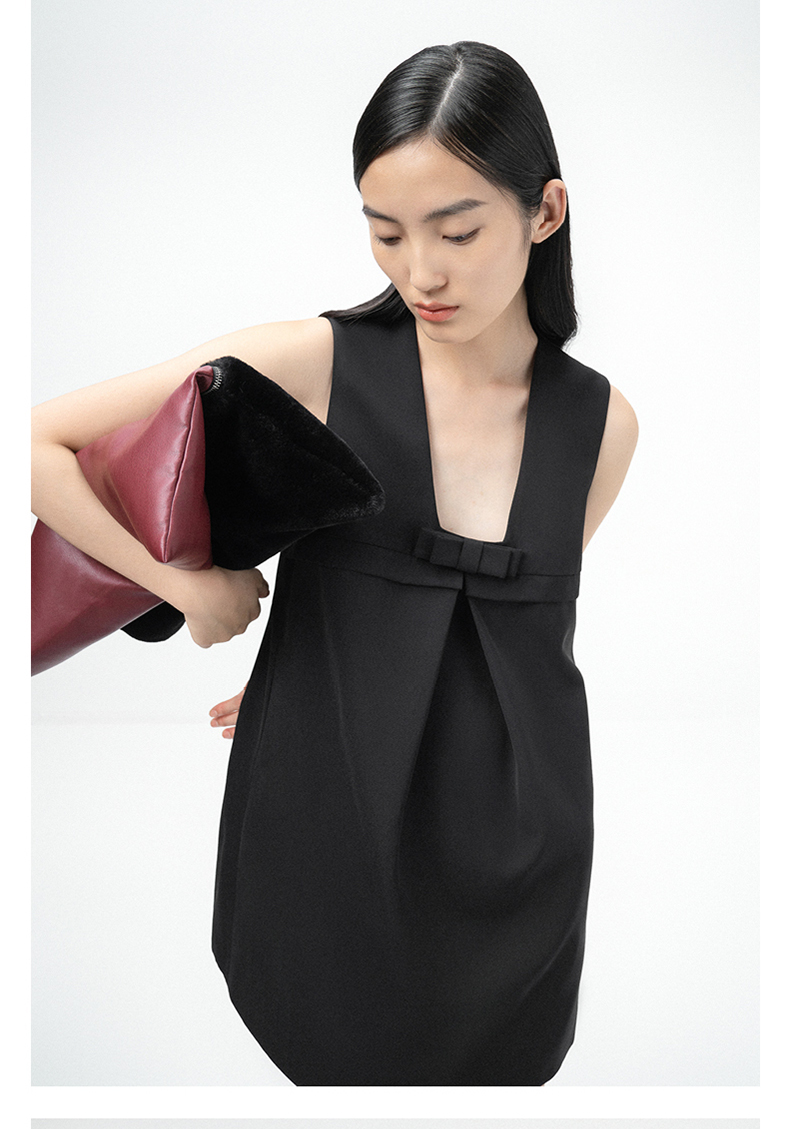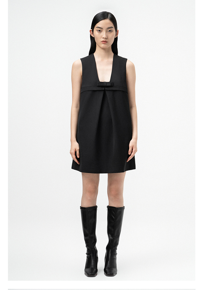 【一夜绮梦】叠褶设计黑色蝴蝶结长方领连衣裙/0000734