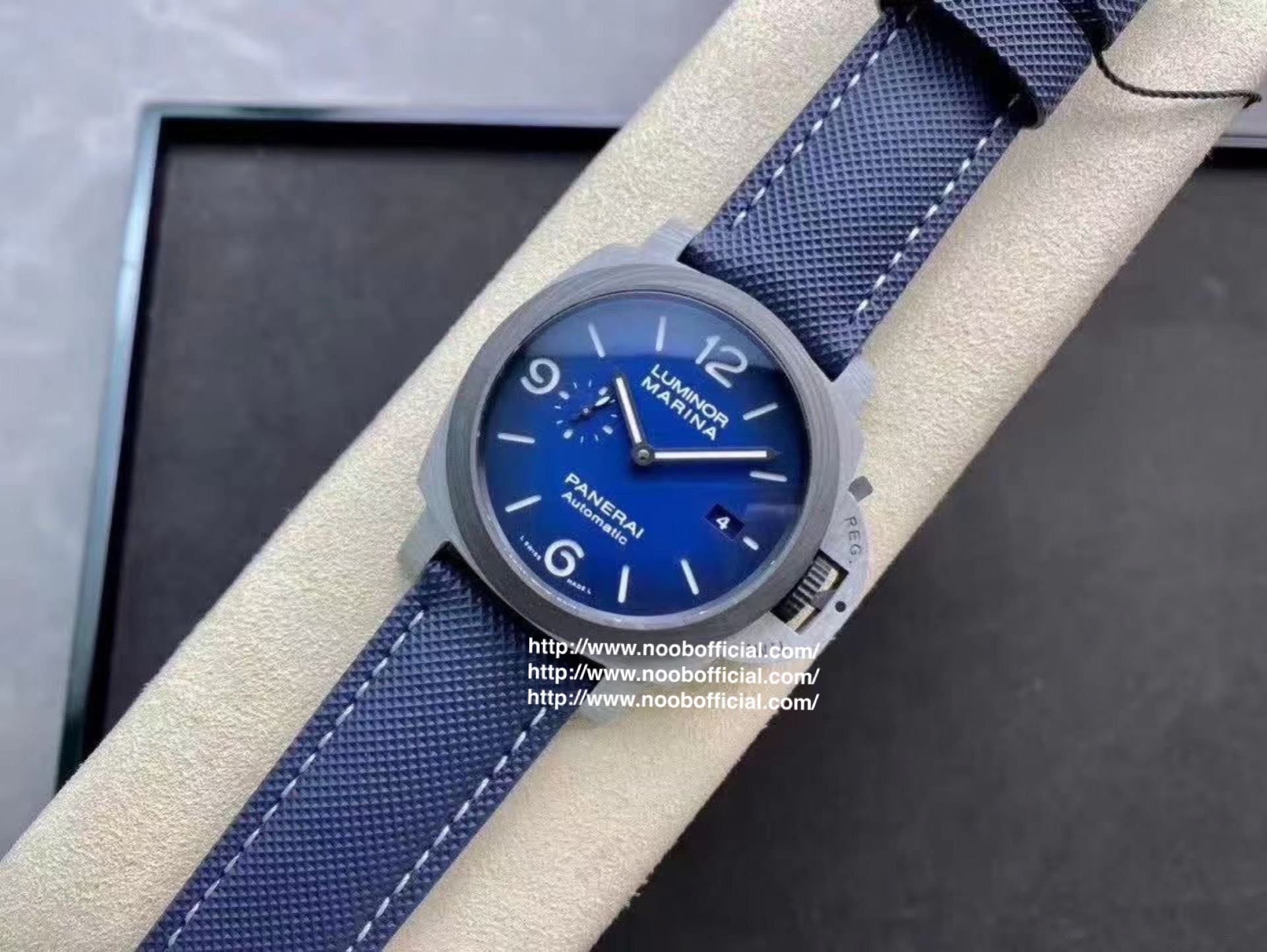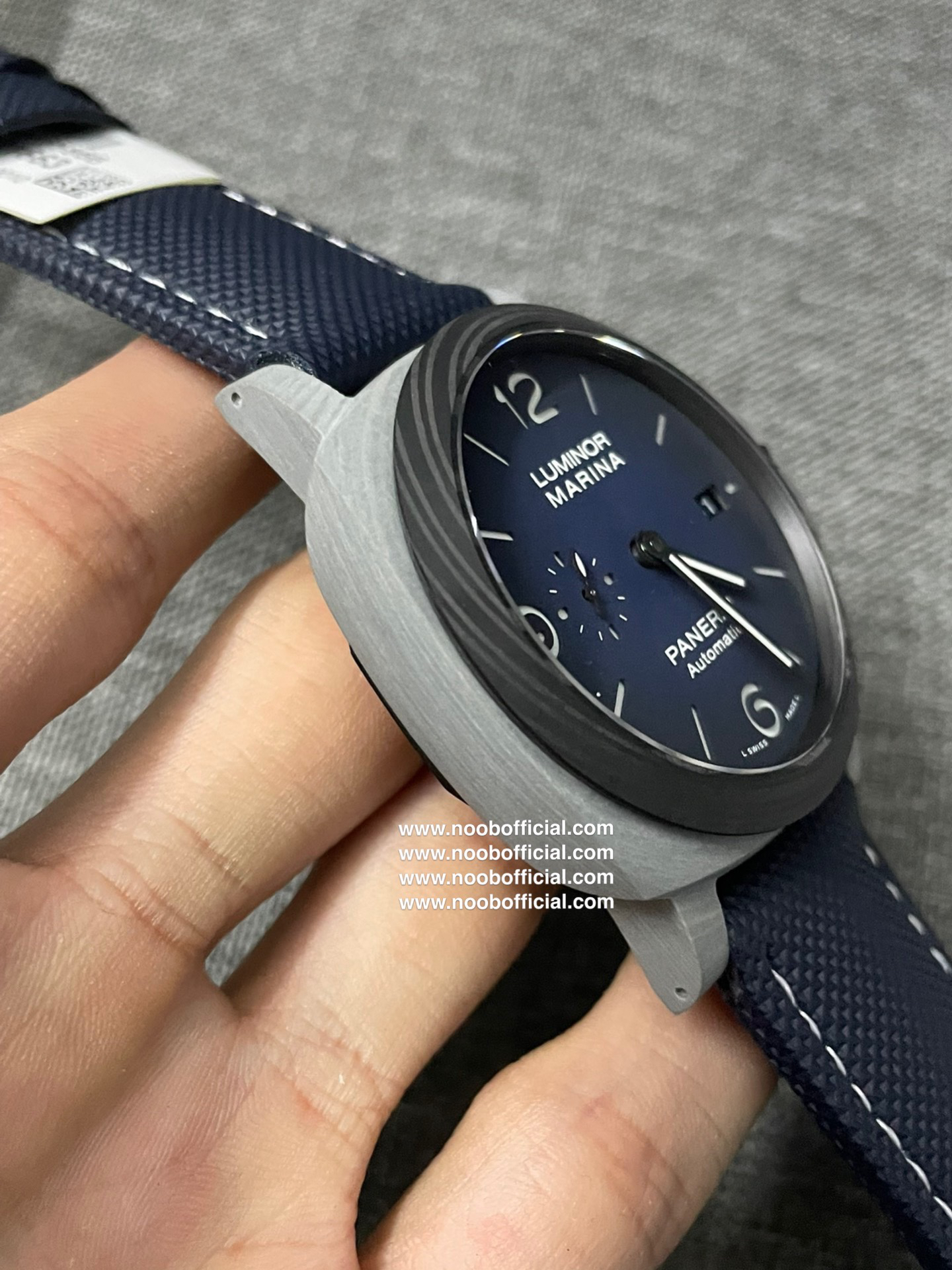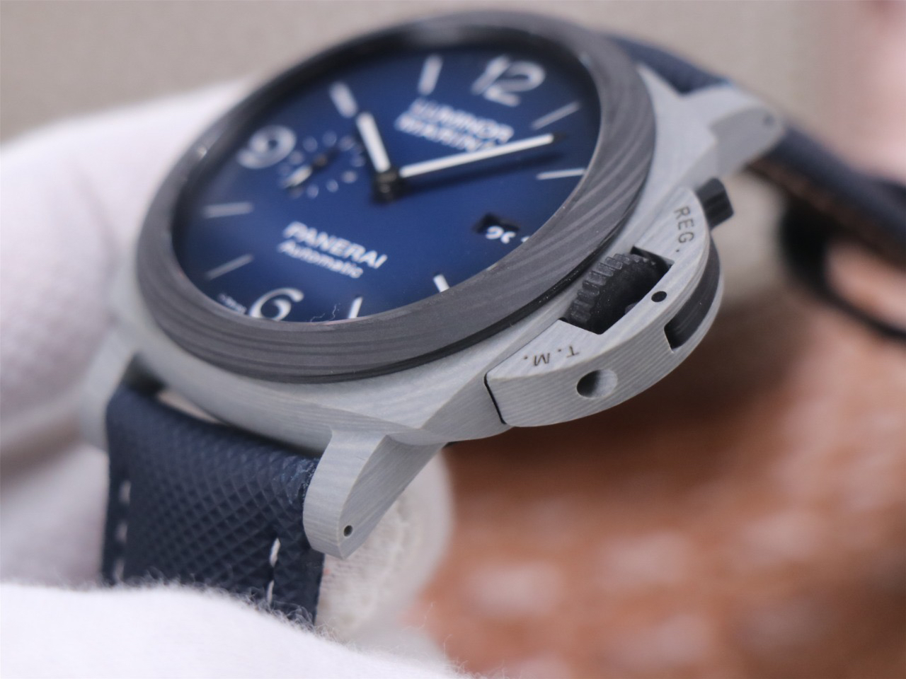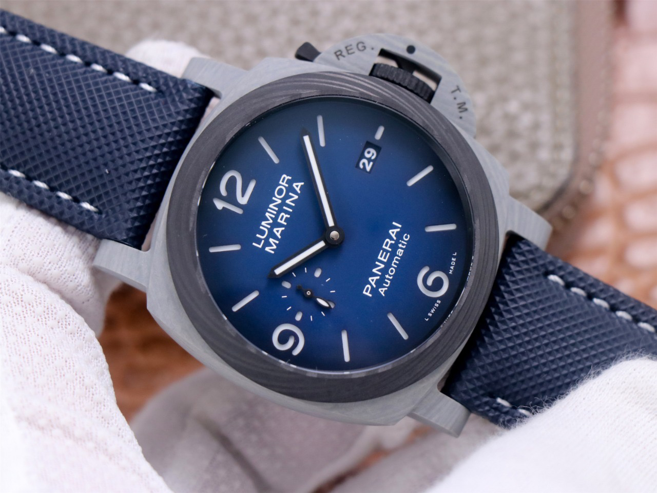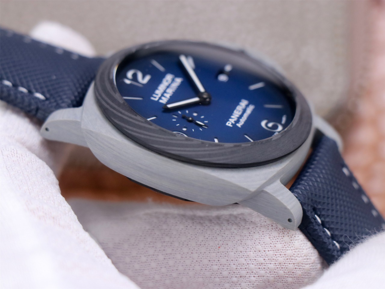 VS沛na海pam1663,44mm碳纤维横纹质地表壳,渐变“烟熏蓝”面盘,男士腕表,尼龙表带,自动机械机芯密底,整个手表基于正品original原版开模的super copy版本,做工精细打磨精良❕