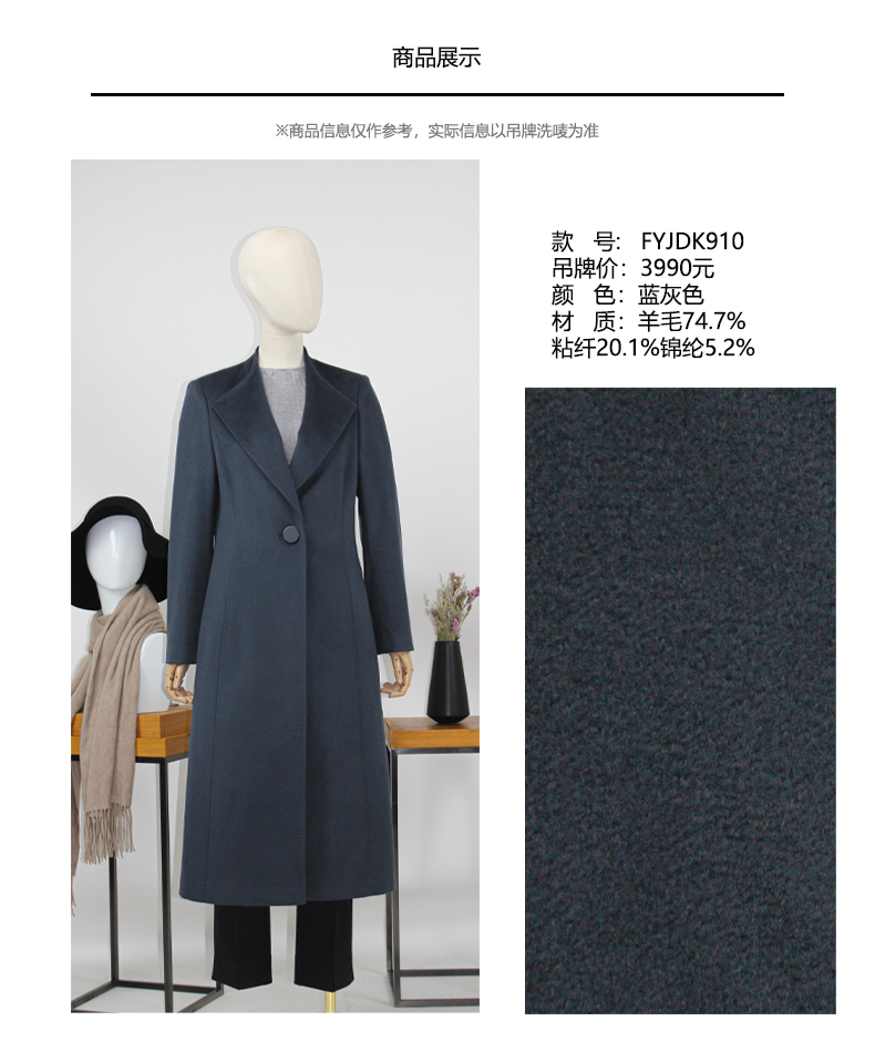 FOCALS福柯斯冬季新款修身长款纯色羊毛大衣外套FYJDK910BA