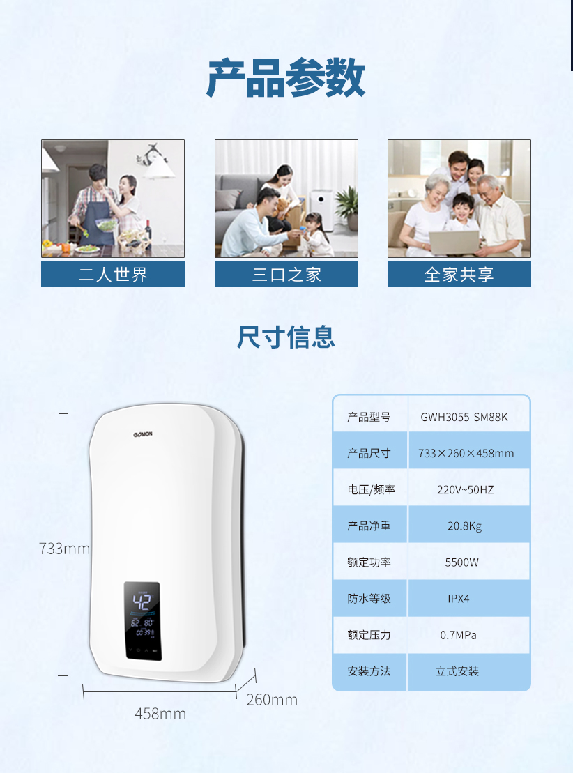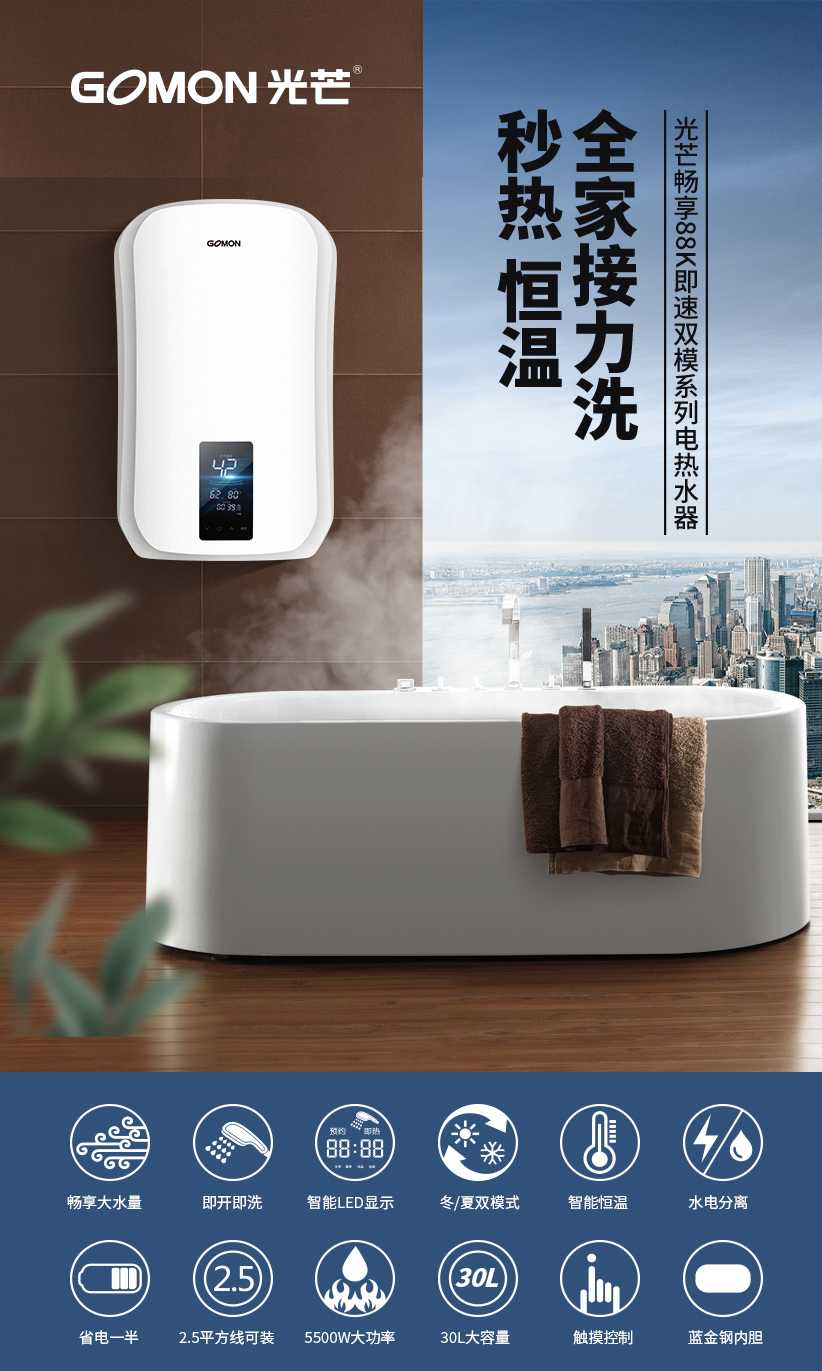 光芒 GOMON畅享88K即速双模系列电热水器 5500W即开即洗 智能恒温 30升大容量 水电分离 30升