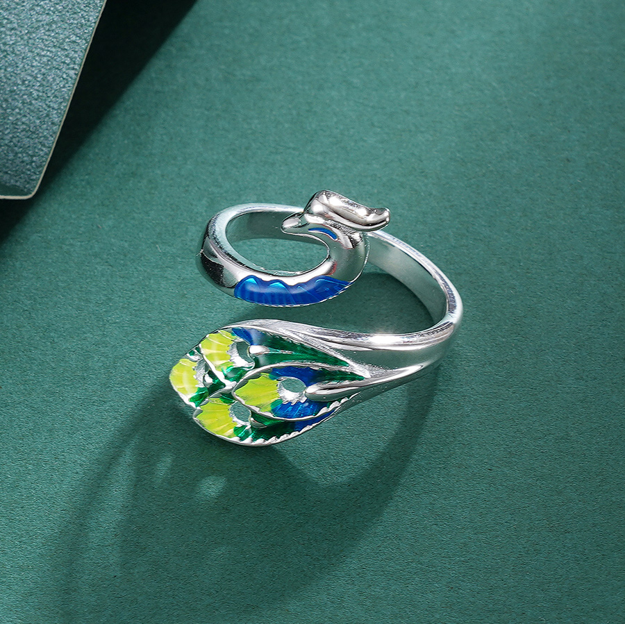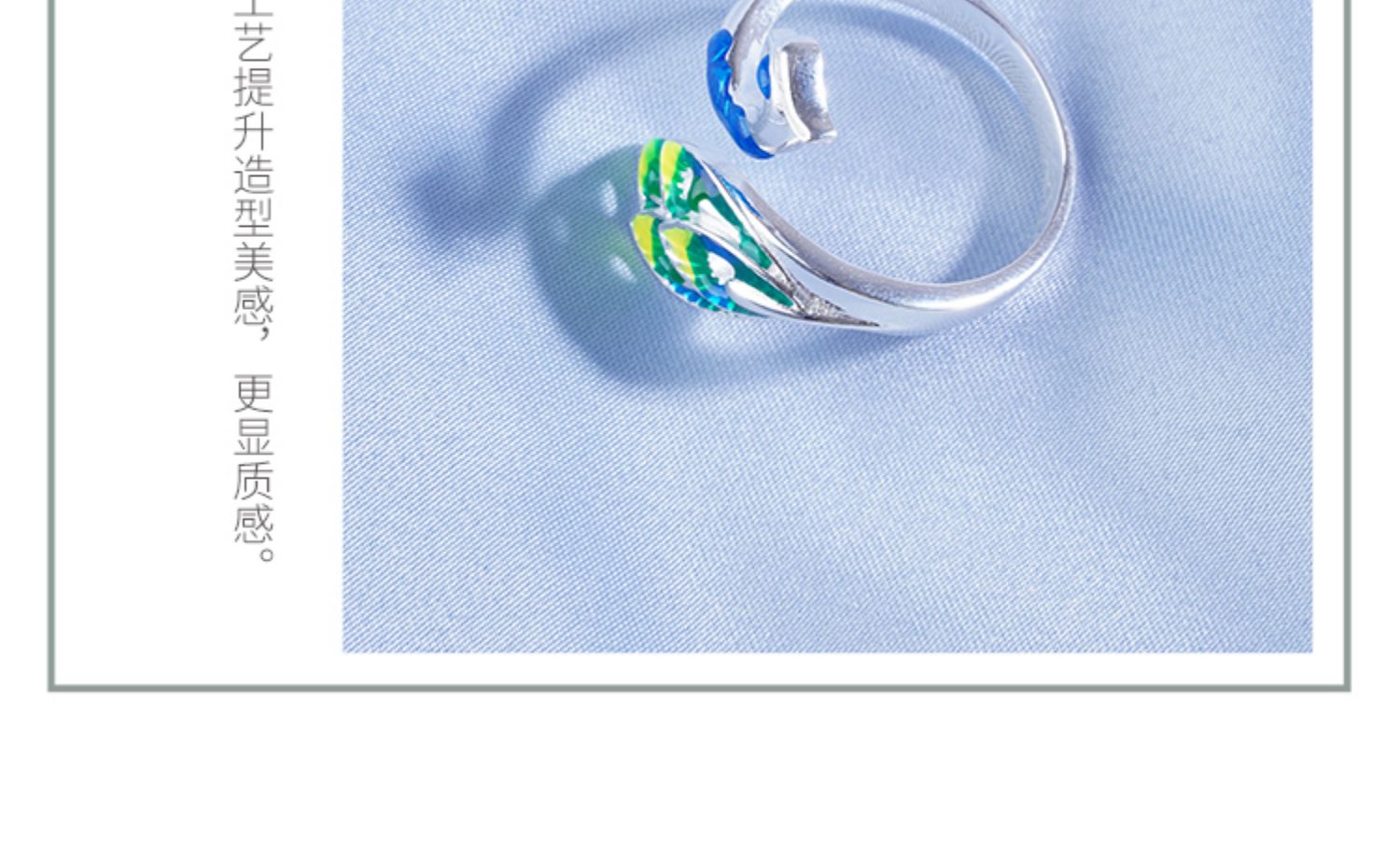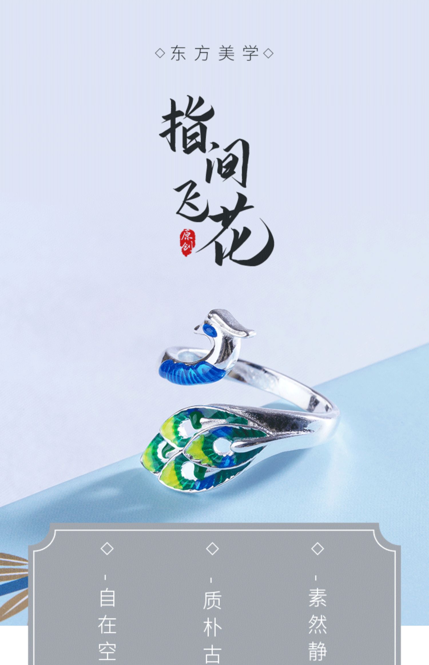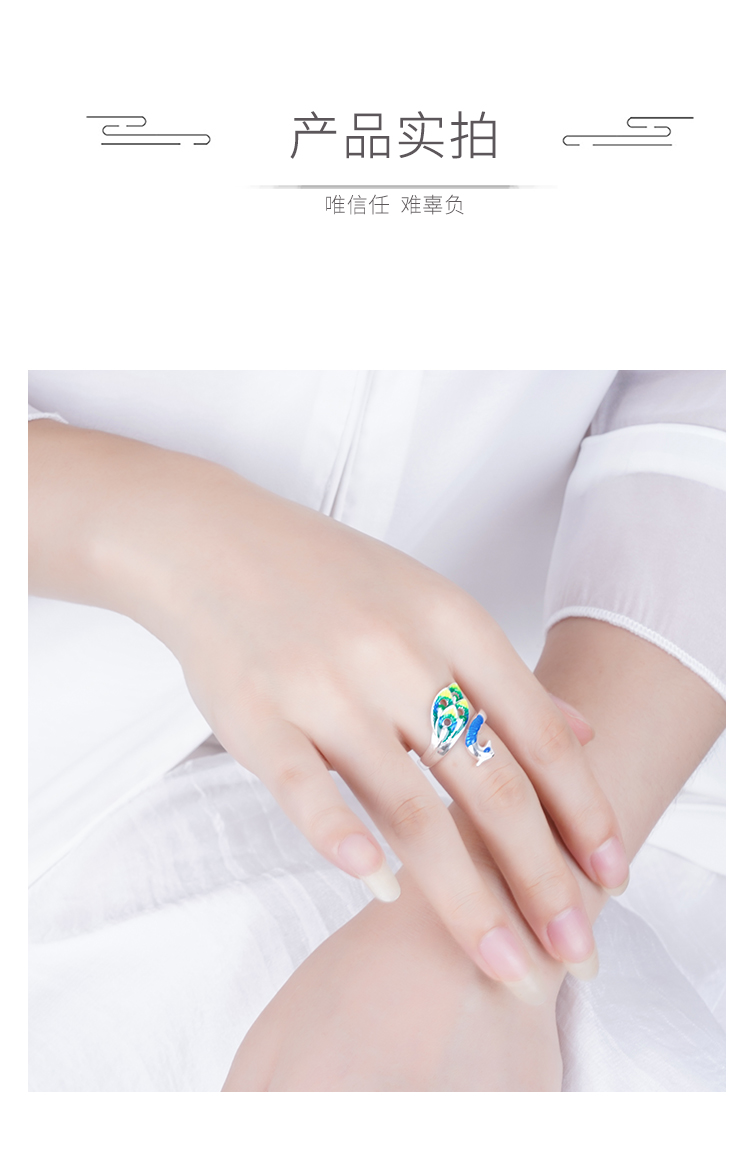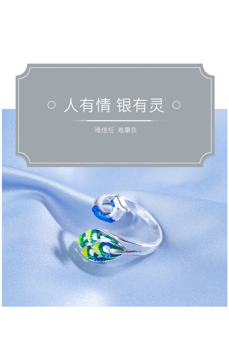 【寓意】:灵韵随风起,翠屏展翅归。戒指以孔雀为灵感设计,珐琅渲染出渐变色彩,层次分明,神韵毕现。寓意孔雀开屏,吉祥降临。