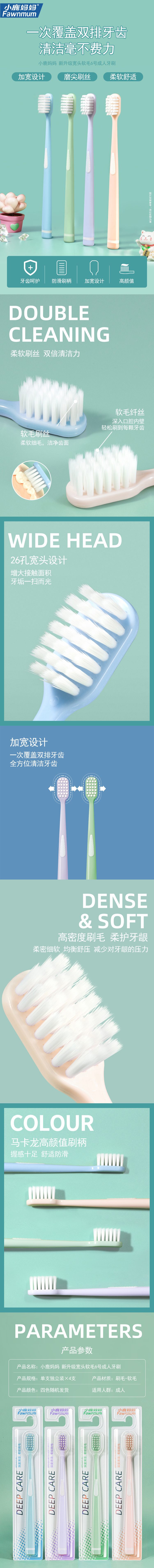 小鹿妈妈 新升级宽头软毛6号成人牙刷*4支 颜色随机