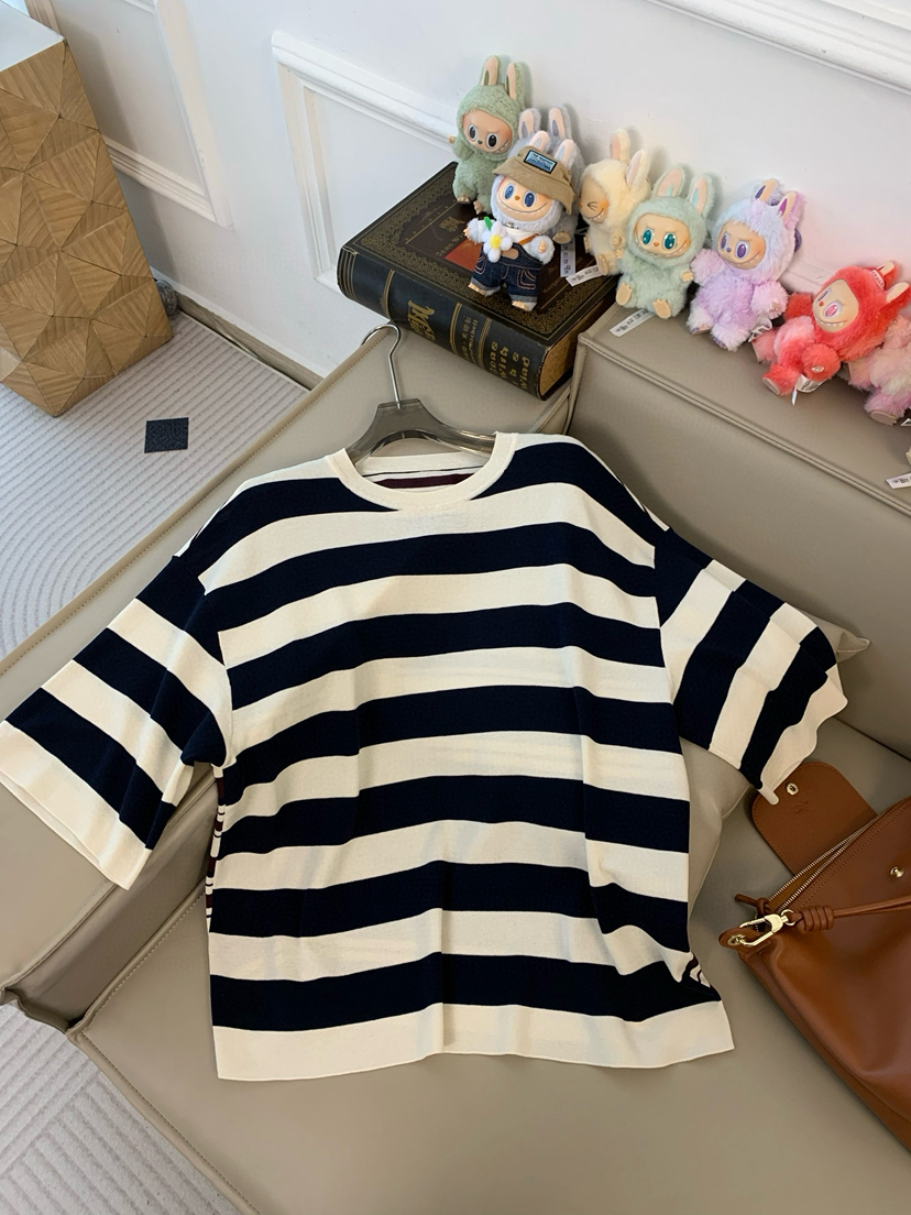 715-3 慵懒不懒散 松弛高级 25早秋 ed拼接条纹 宽松圆领中袖上衣