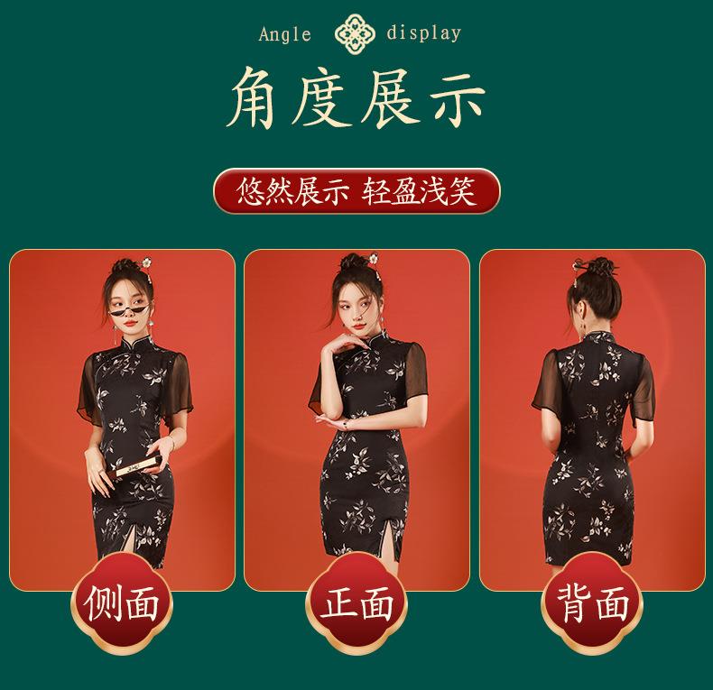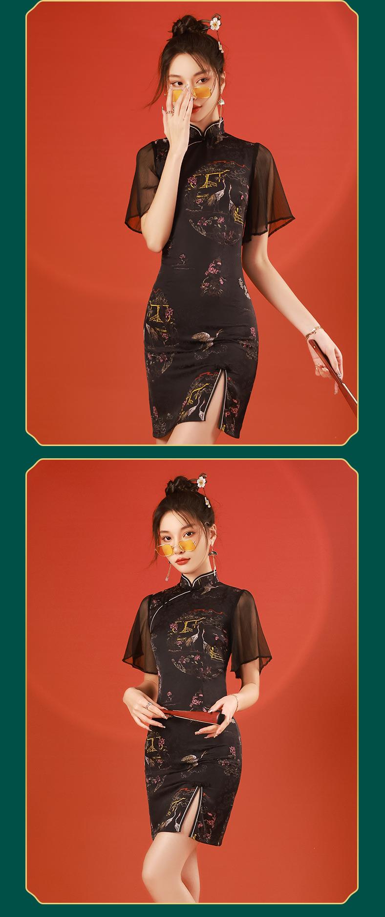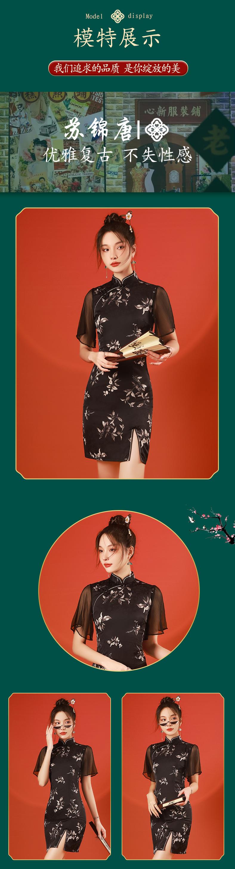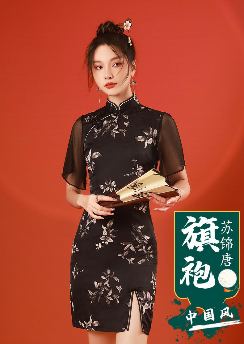 2023春夏新款飞飞袖前开叉短款旗袍连衣裙现代版改良旗袍中国风