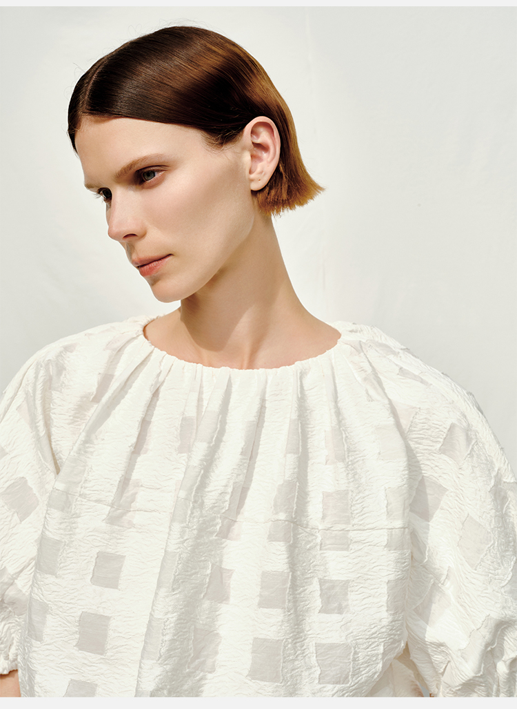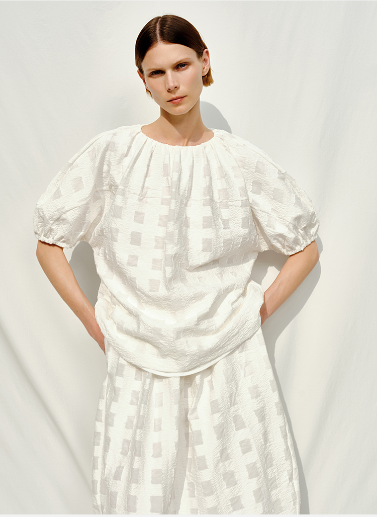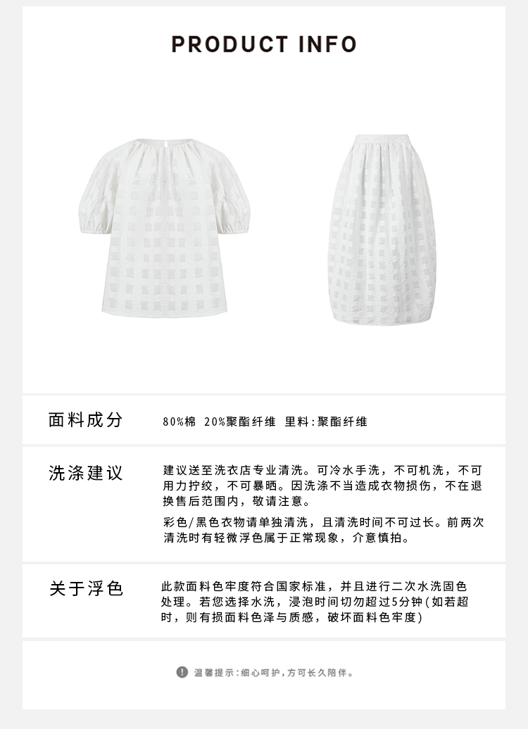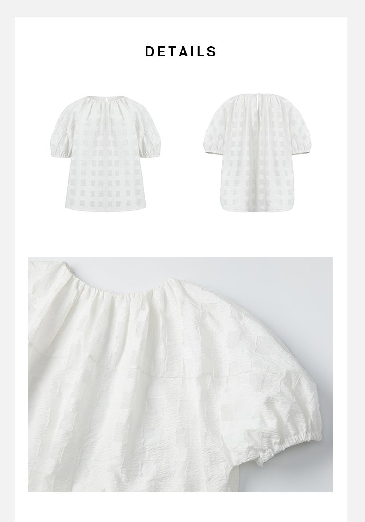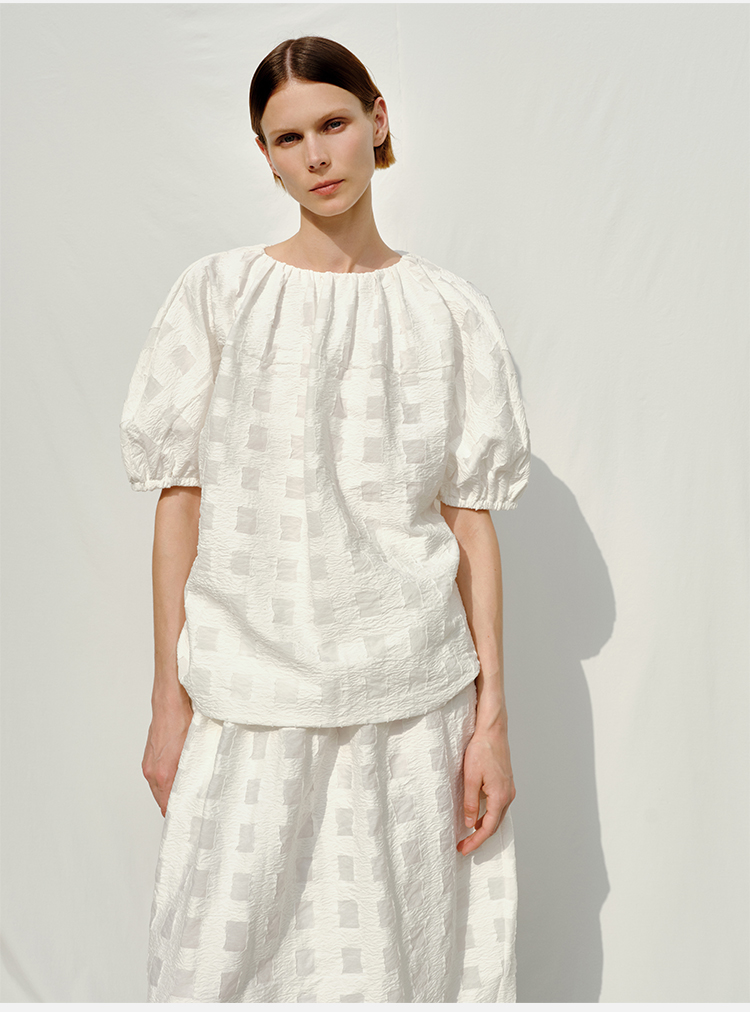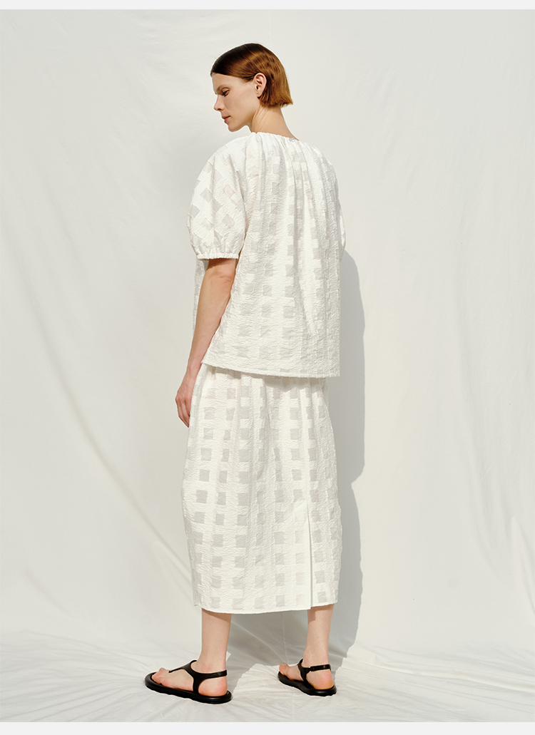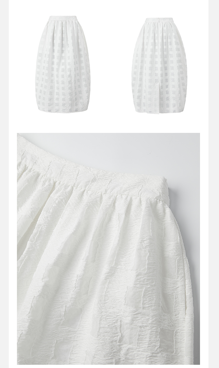HIDEMI度假系列浮雕感艺术提花白色格纹茧型泡泡套装 上衣/茧型半身裙