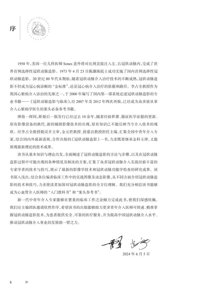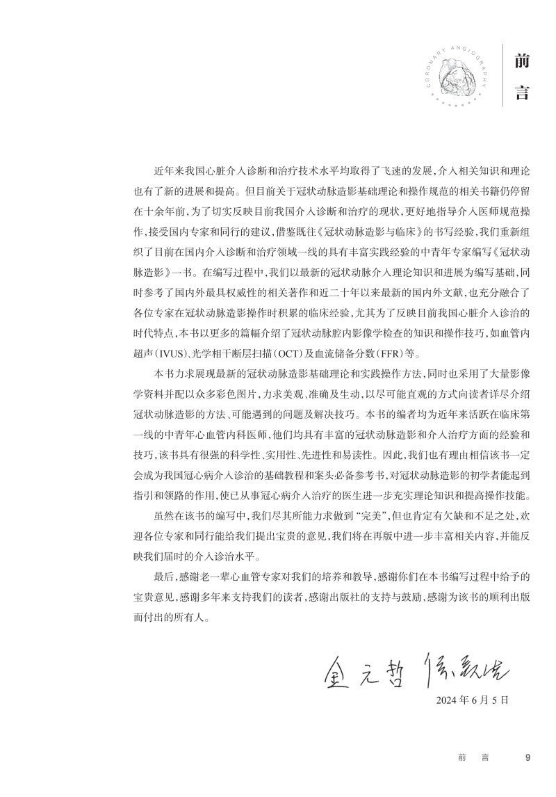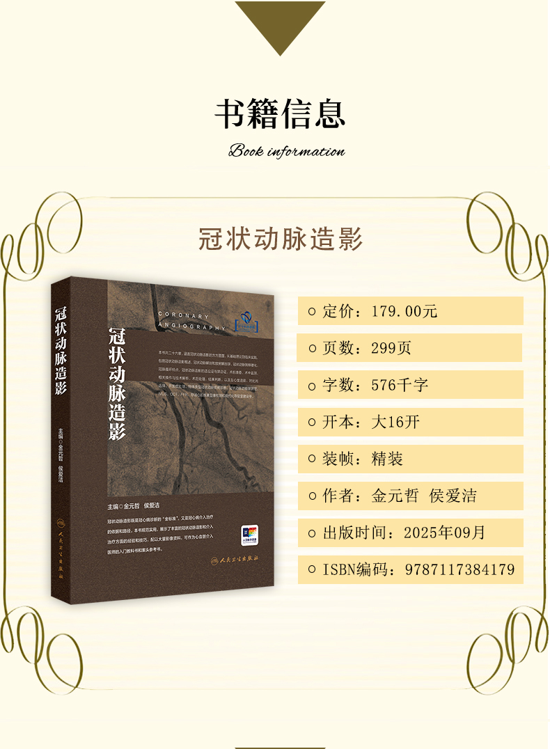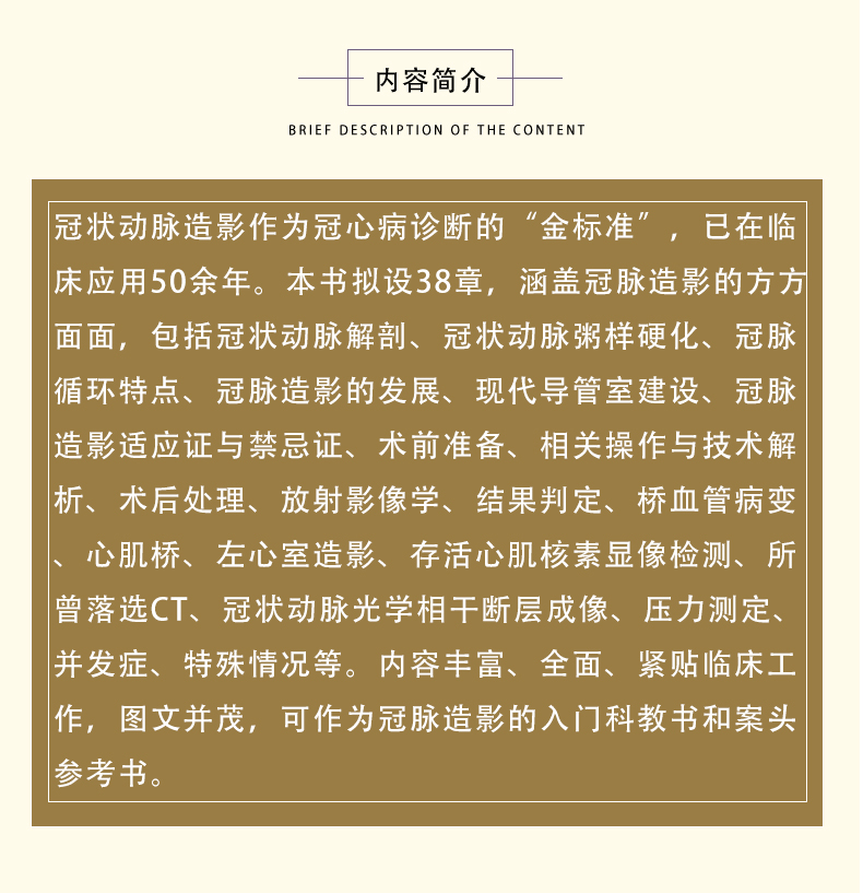 冠状动脉造影作为冠心病诊断的“金标准”,已在临床应用50余年。本书拟设38章,涵盖冠脉造影的方方面面,包括冠状动脉解剖、冠状动脉粥样硬化、冠脉循环特点、冠脉造影的发展、现代导管室建设、冠脉造影适应证与禁忌证、术前准备、相关操作与技术解析、术后处理、放射影像学、结果判定、桥血管病变、心肌桥、左心室造影、存活心肌核素显像检测、所曾落选CT、冠状动脉光学相干断层成像、压力测定、并发症、特殊情况等。内容丰富、全面、紧贴临床工作,图文并茂,可作为冠脉造影的入门科教书和案头参考书。