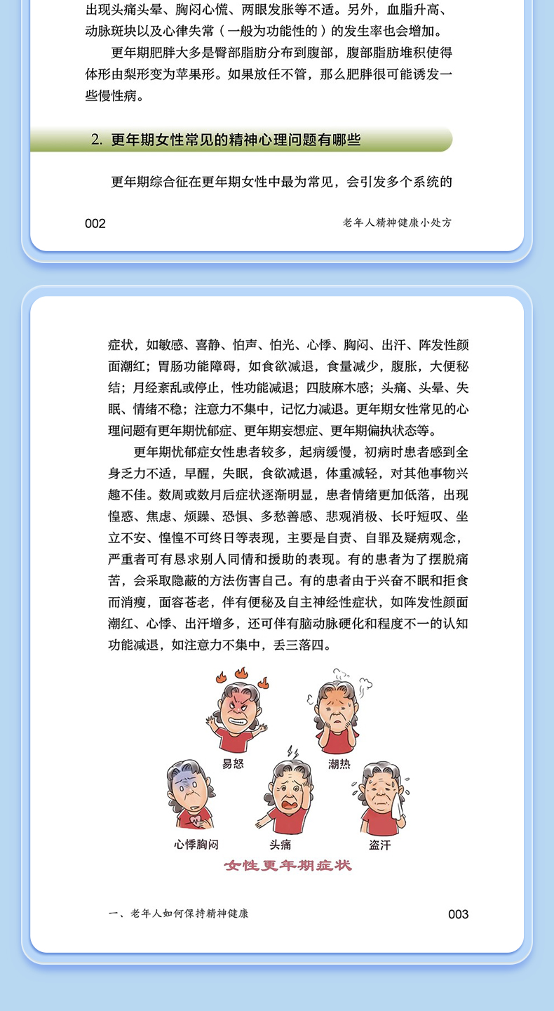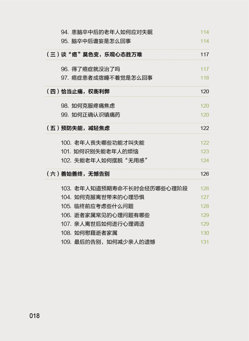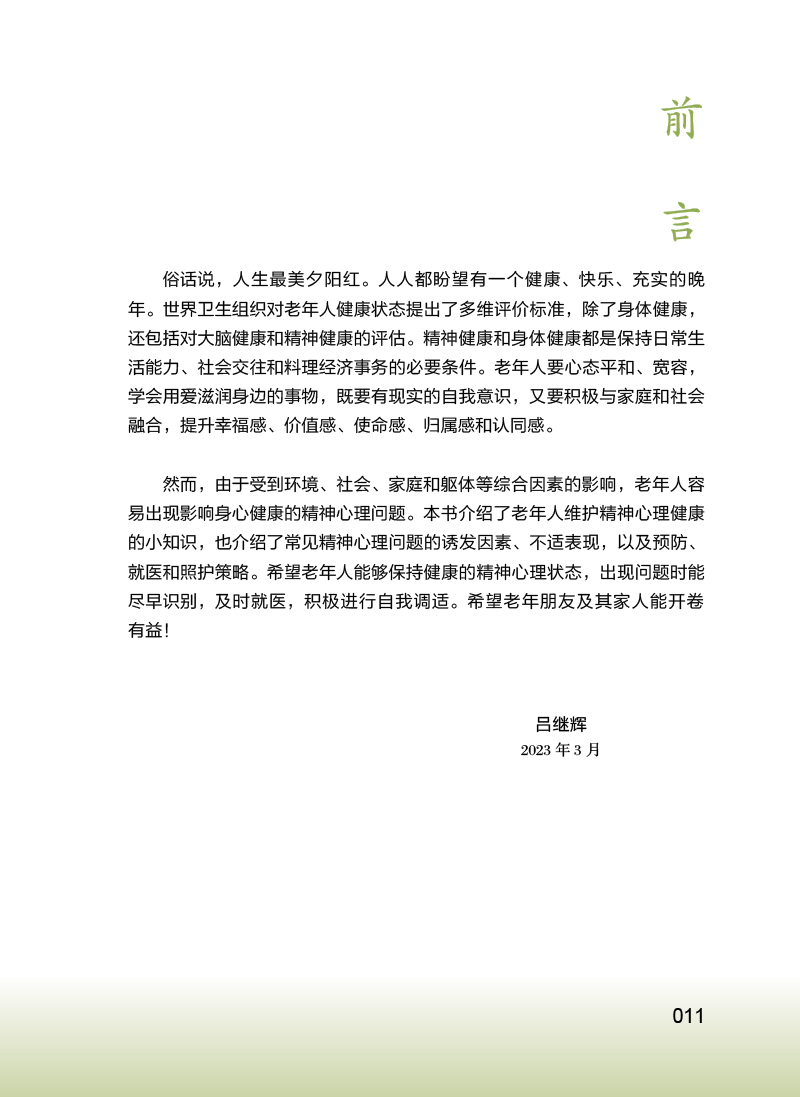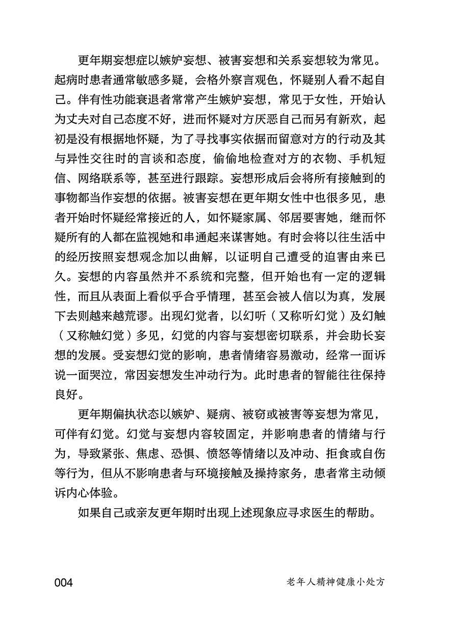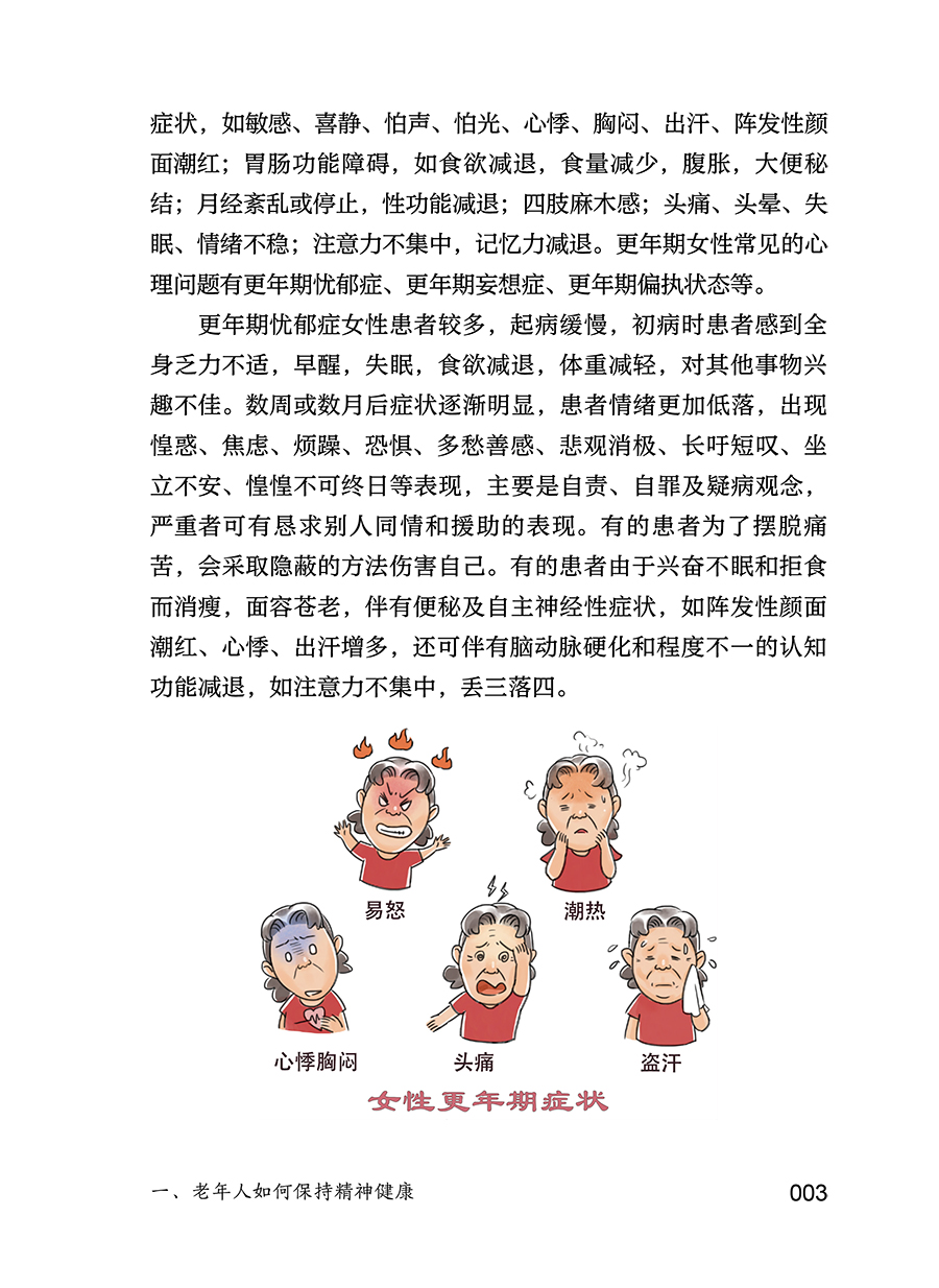 本书主要内容包括老年生理相关的心理问题(更年期相关心理问题、衰退相关心理问题、身体衰弱相关心理问题等),社会环境相关的心理问题(退休老年人心理问题、空巢和独居老年人的心理问题、养老机构老年人的心理问题、住院老年人的心理问题等),躯体疾病相关的精神心理问题(心脑血管疾病伴发的心理问题、肿瘤伴发的心理问题、失能伴发的心理问题等),为广大中老年朋友及其家人解答关于老年人精神心理健康方问题,帮助老年人了解自我调适、预防和识别精神心理疾病的知识,增强其及时就医和正确对待疾病乃至死亡的科学意识。