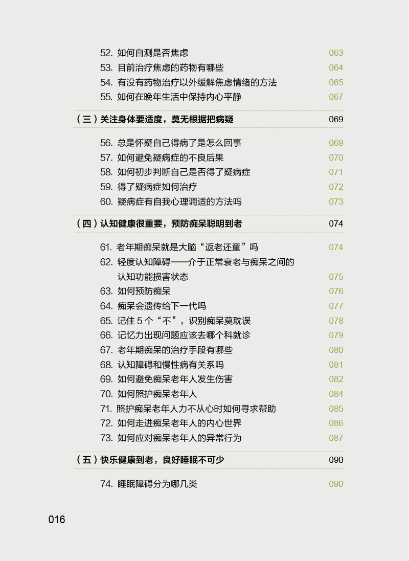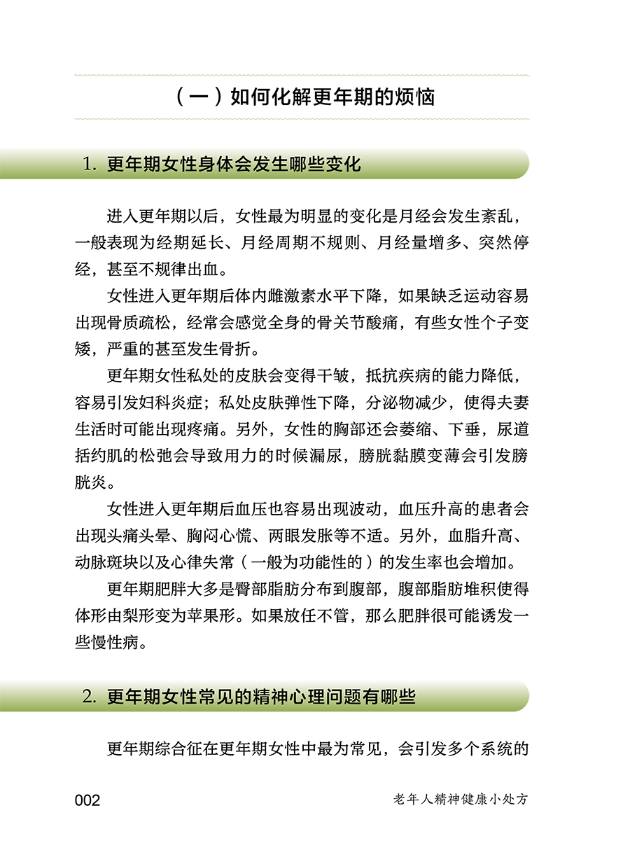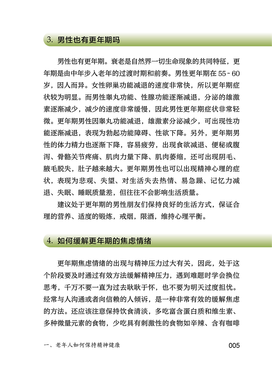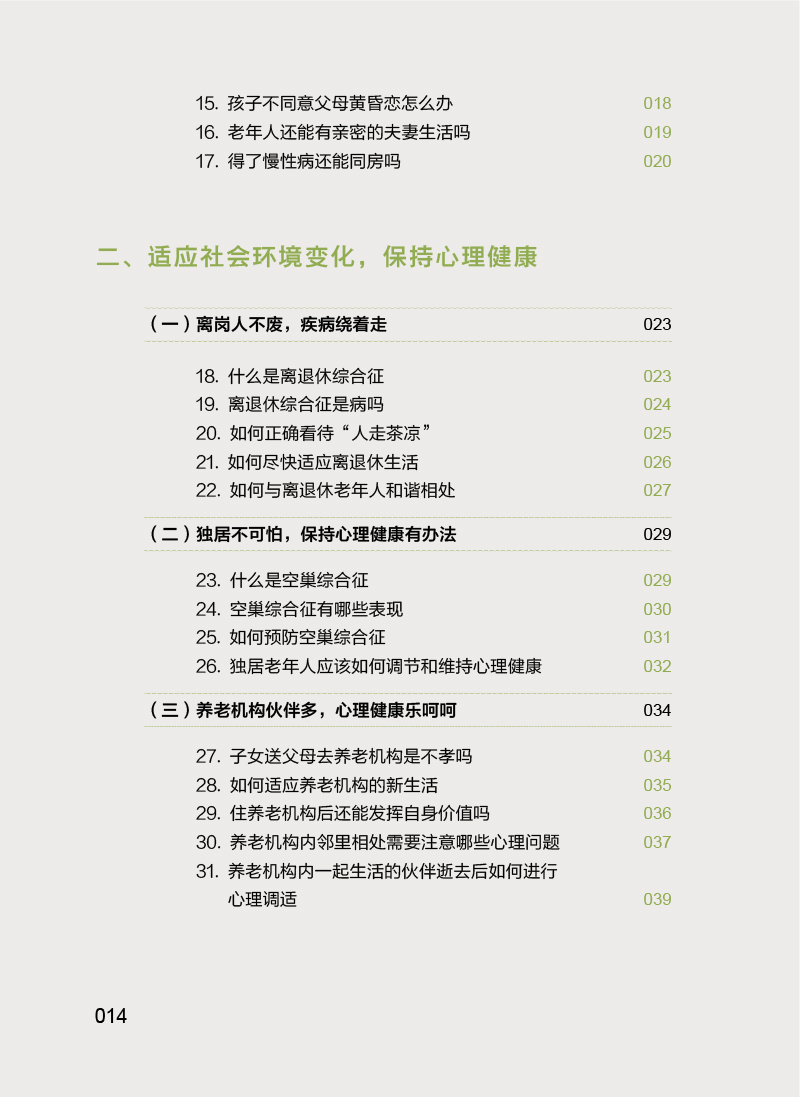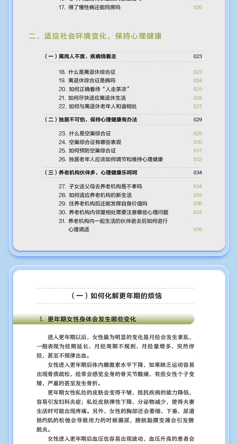 本书主要内容包括老年生理相关的心理问题(更年期相关心理问题、衰退相关心理问题、身体衰弱相关心理问题等),社会环境相关的心理问题(退休老年人心理问题、空巢和独居老年人的心理问题、养老机构老年人的心理问题、住院老年人的心理问题等),躯体疾病相关的精神心理问题(心脑血管疾病伴发的心理问题、肿瘤伴发的心理问题、失能伴发的心理问题等),为广大中老年朋友及其家人解答关于老年人精神心理健康方问题,帮助老年人了解自我调适、预防和识别精神心理疾病的知识,增强其及时就医和正确对待疾病乃至死亡的科学意识。