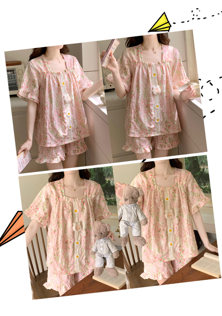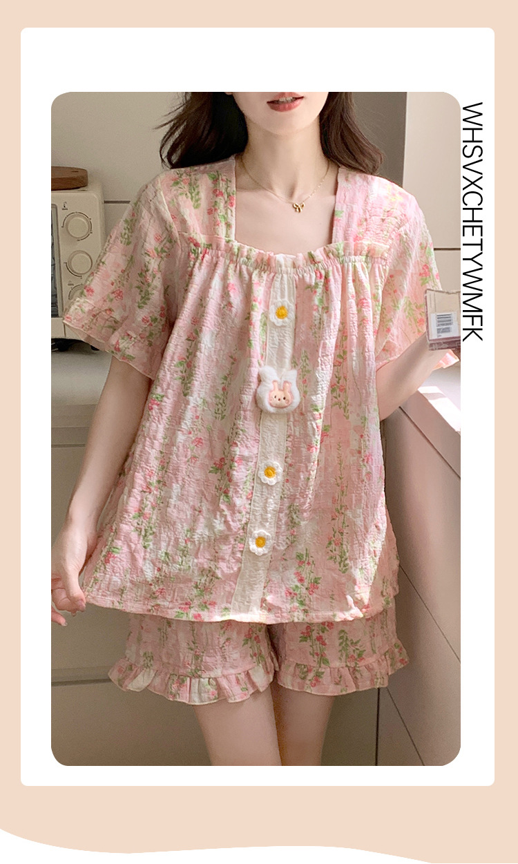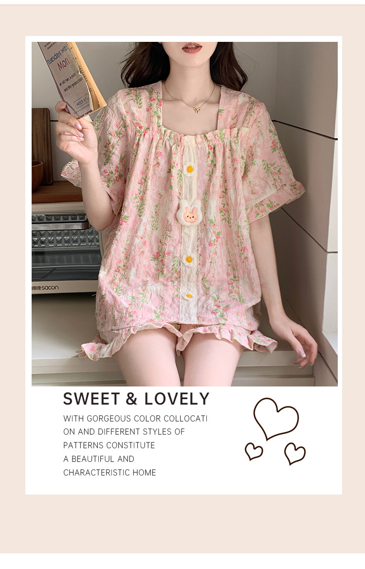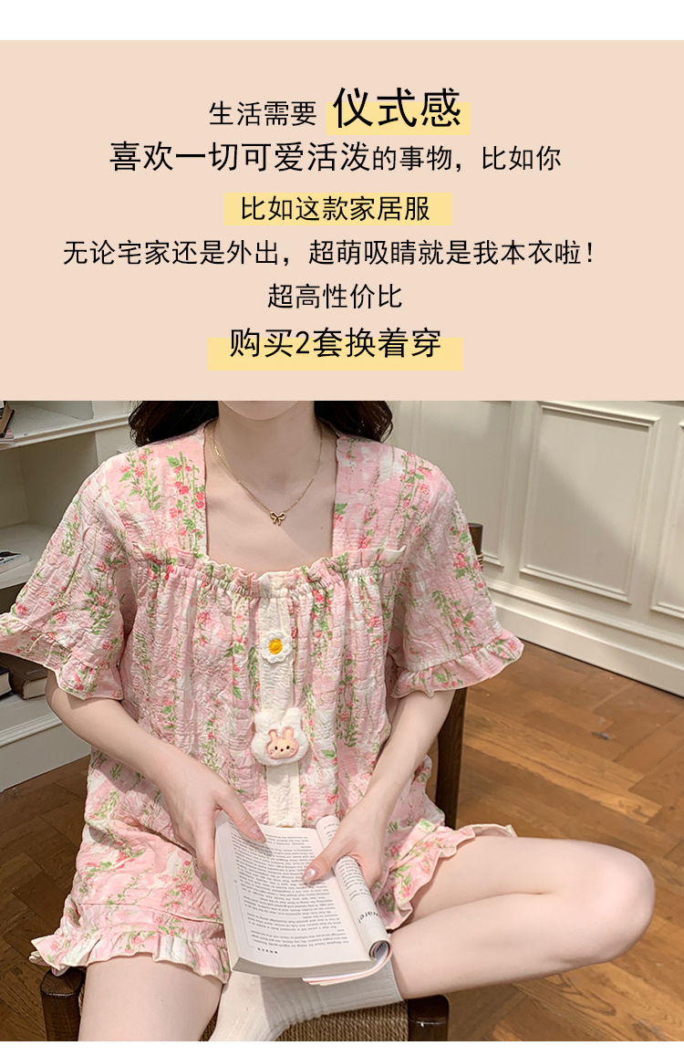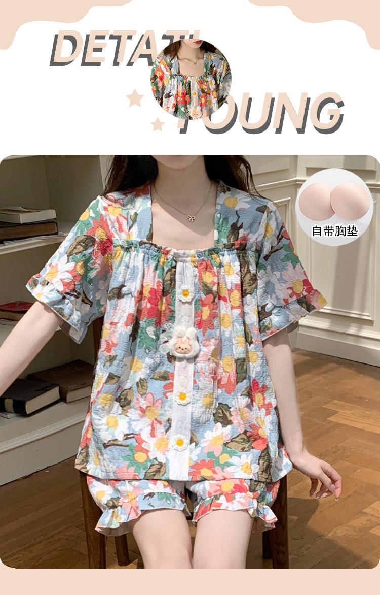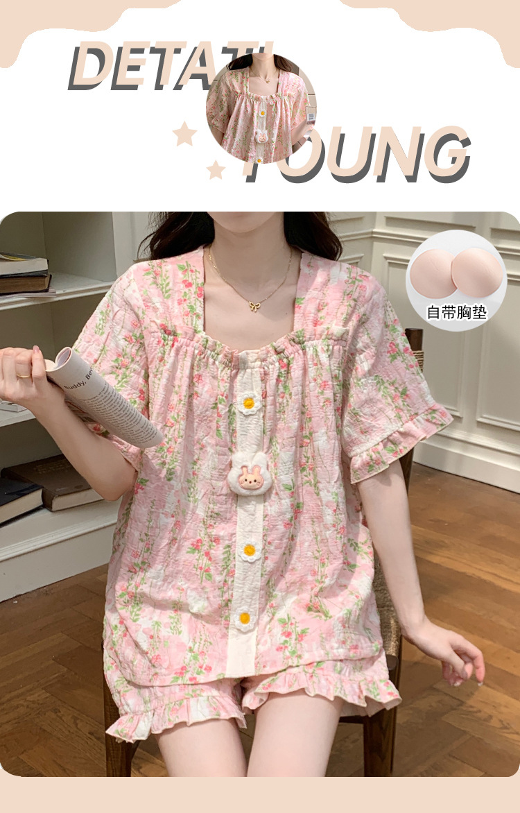【自带胸垫】公主风睡衣女夏季薄款带胸甜美碎花短袖短裤宽松可外穿家居服套装。rh