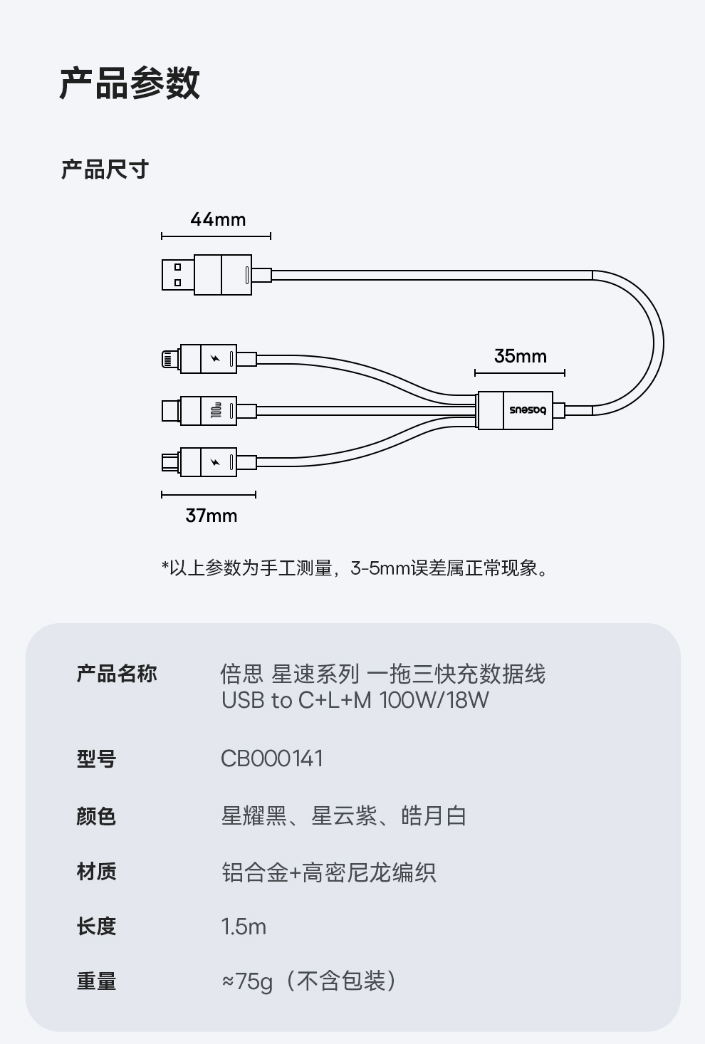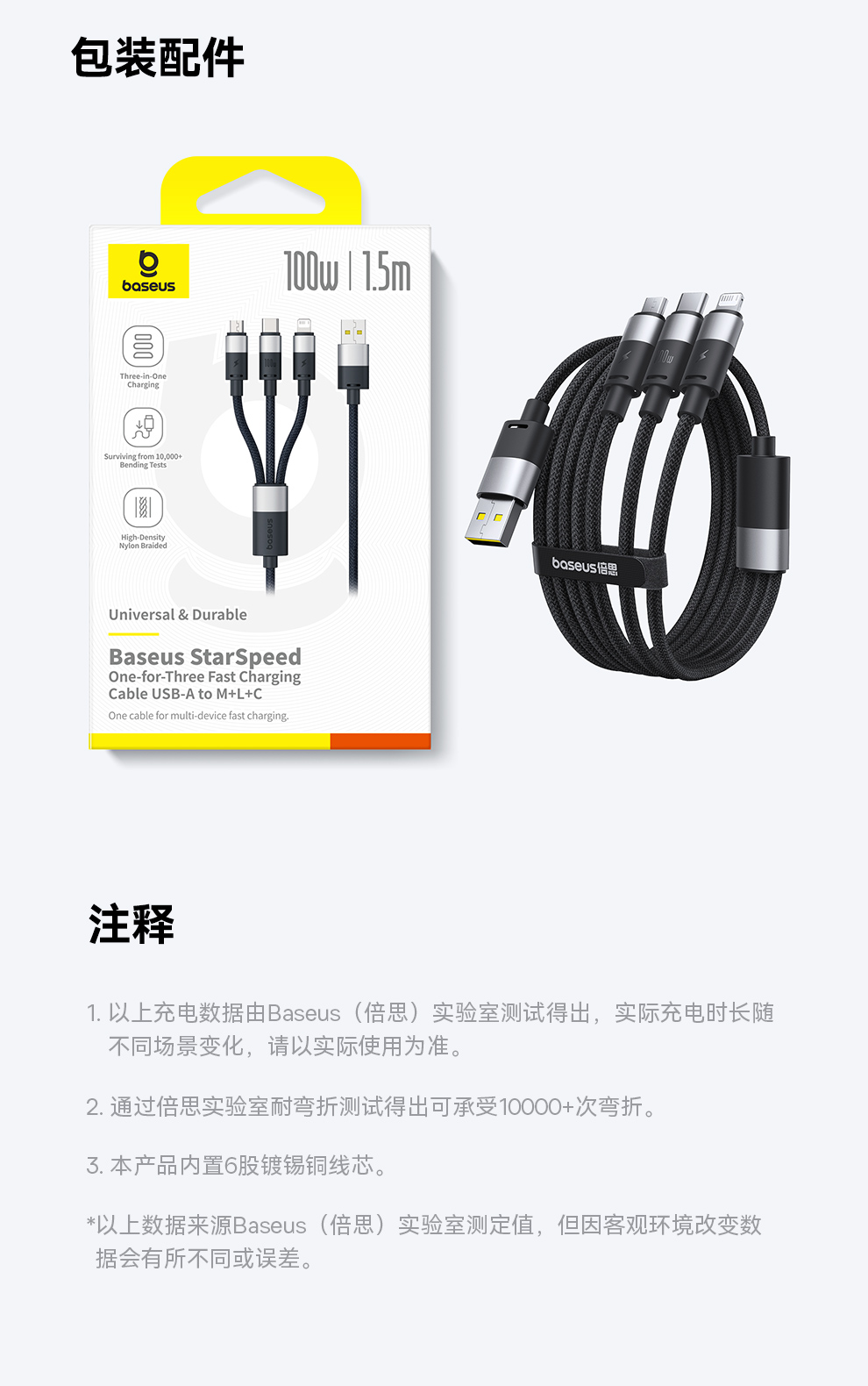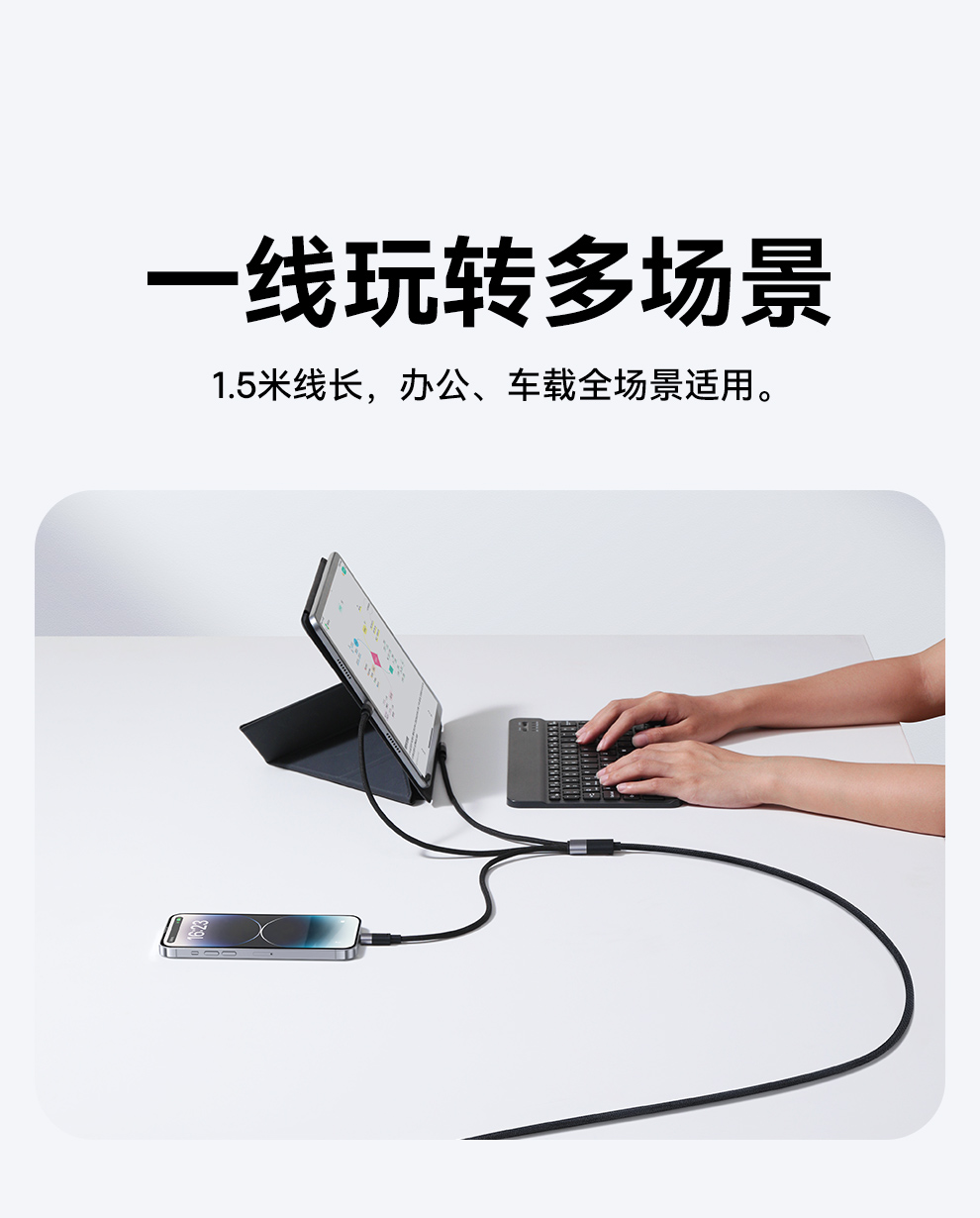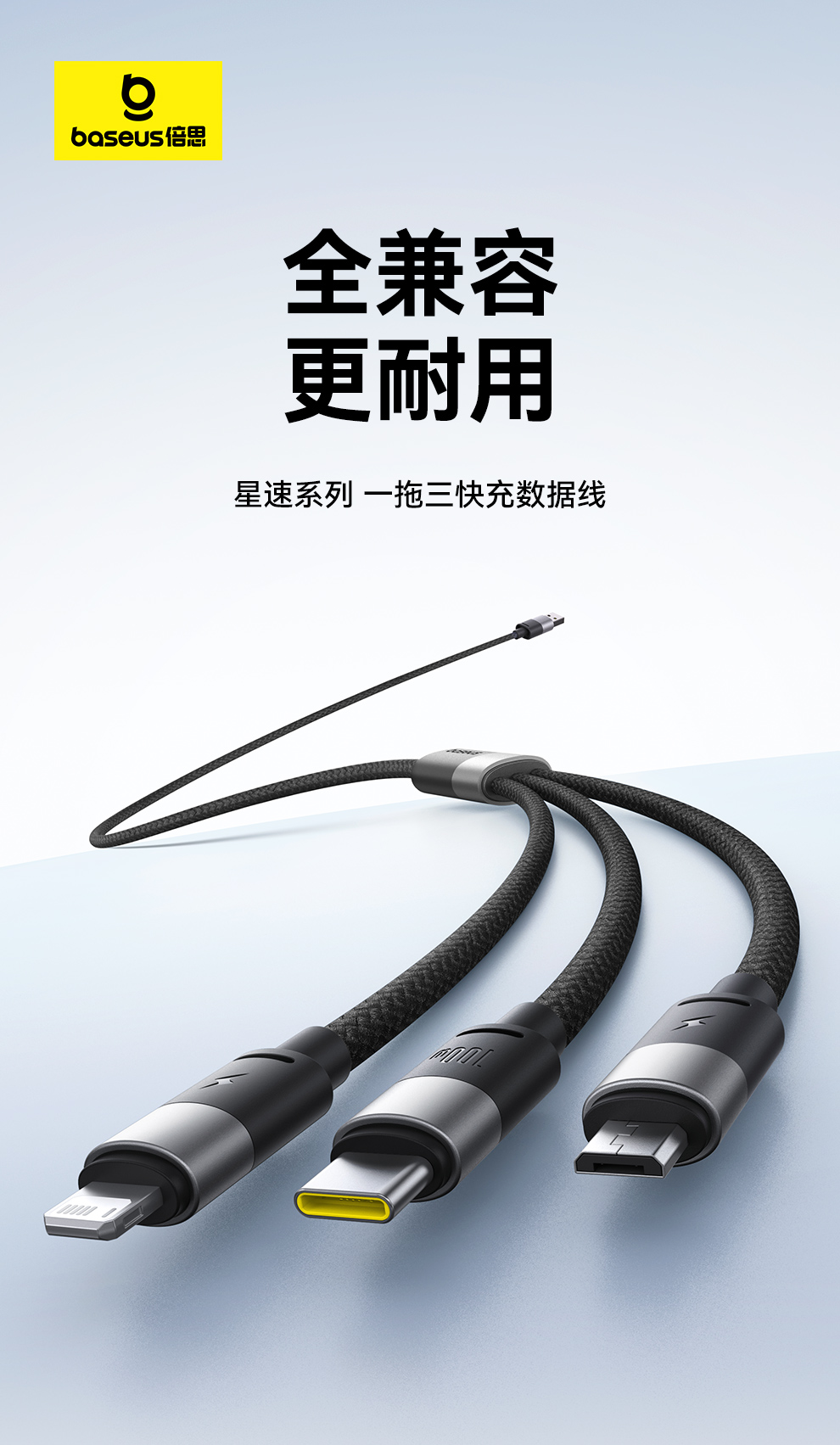 倍思 星速系列 一拖三数据线 USB to M+L+C 100W