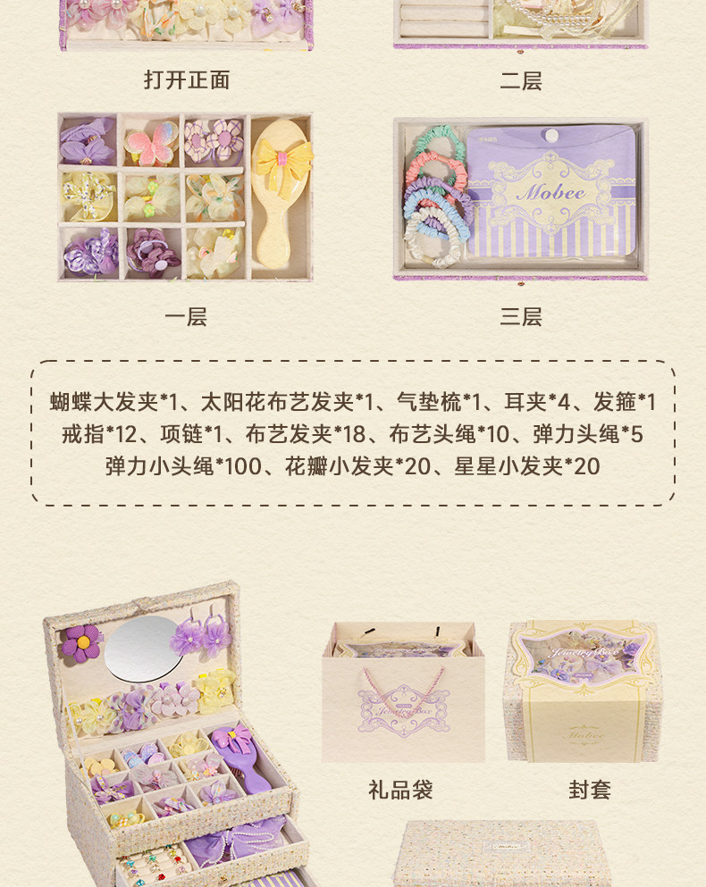 Mobee 礼物系列 发饰礼盒 拾光花町 儿童发饰礼盒套装女孩侧边发夹箍头绳皮筋首饰收纳2025新款