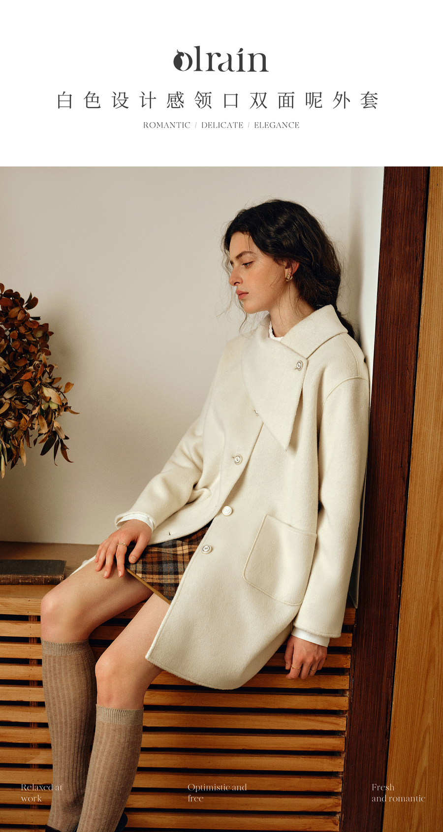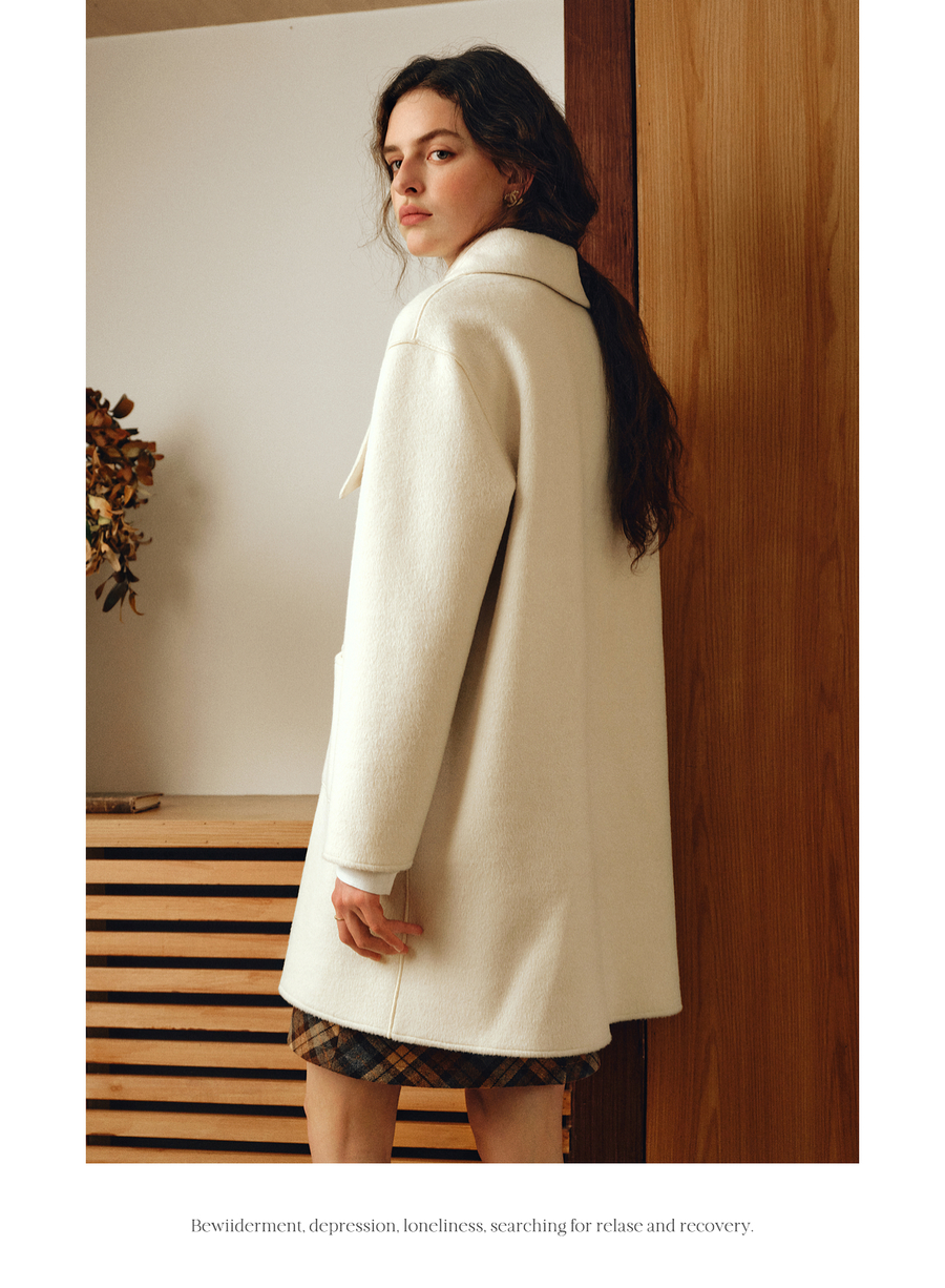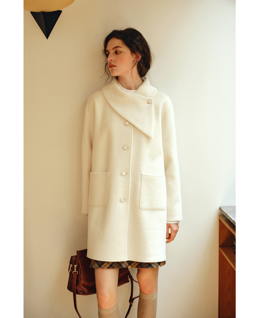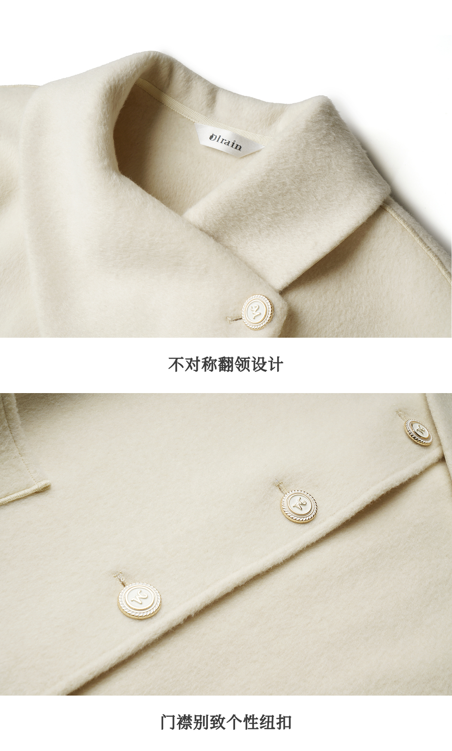 OLrain欧芮儿2025新款女冬季白色设计感领口单排扣大衣双面呢外套