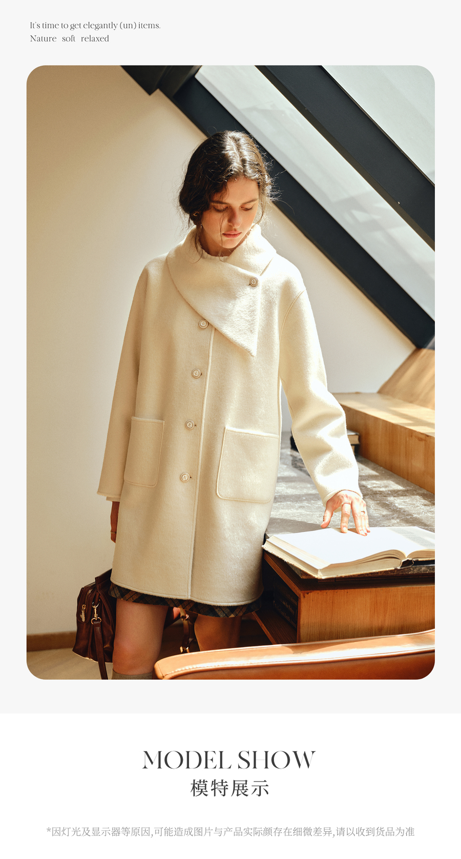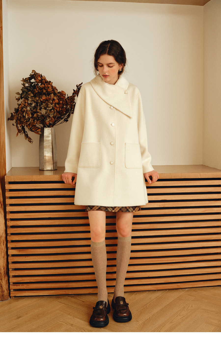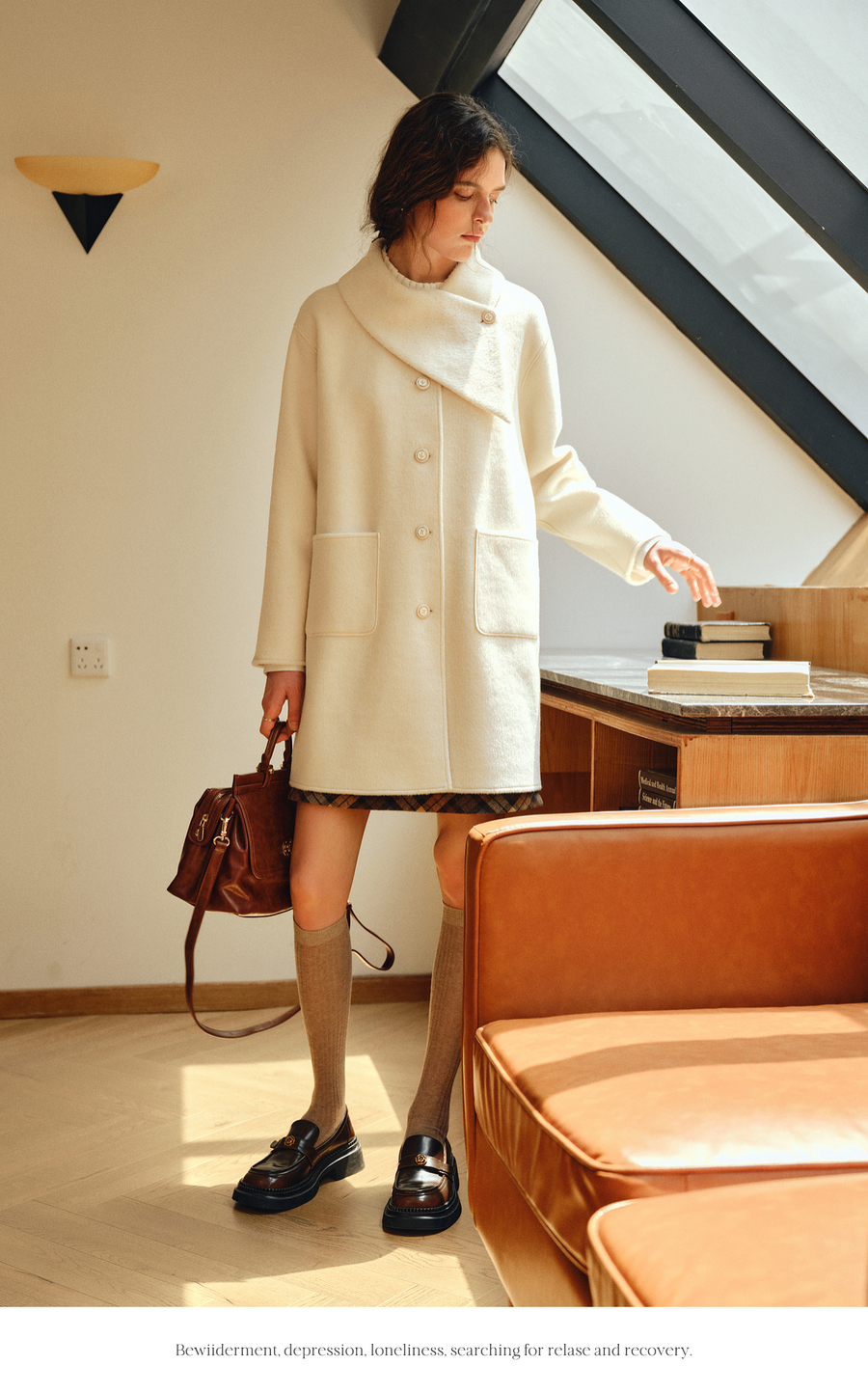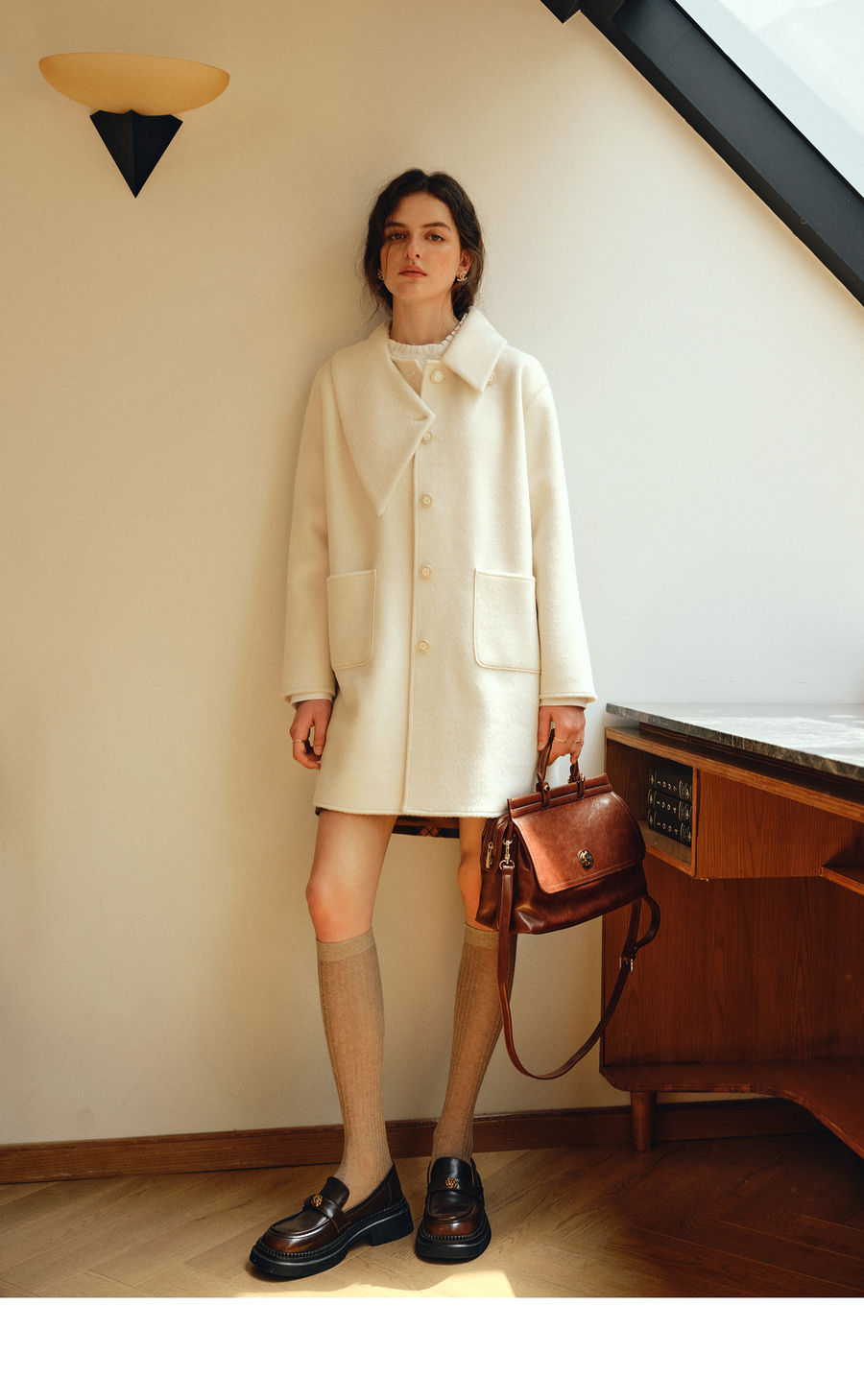OLrain欧芮儿2025新款女冬季白色设计感领口单排扣大衣双面呢外套