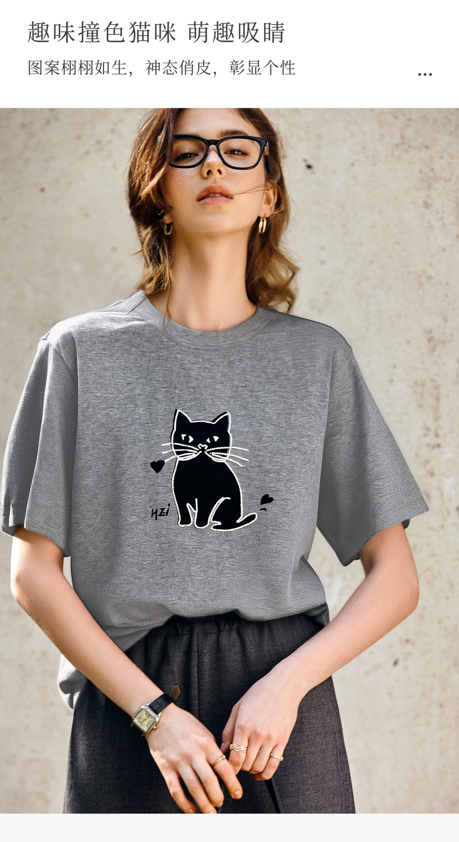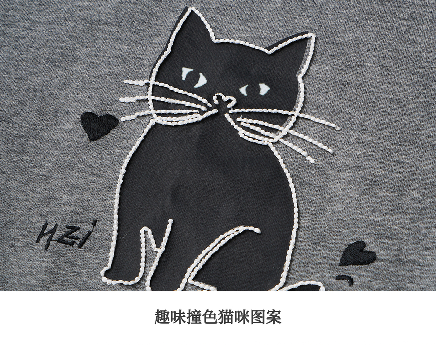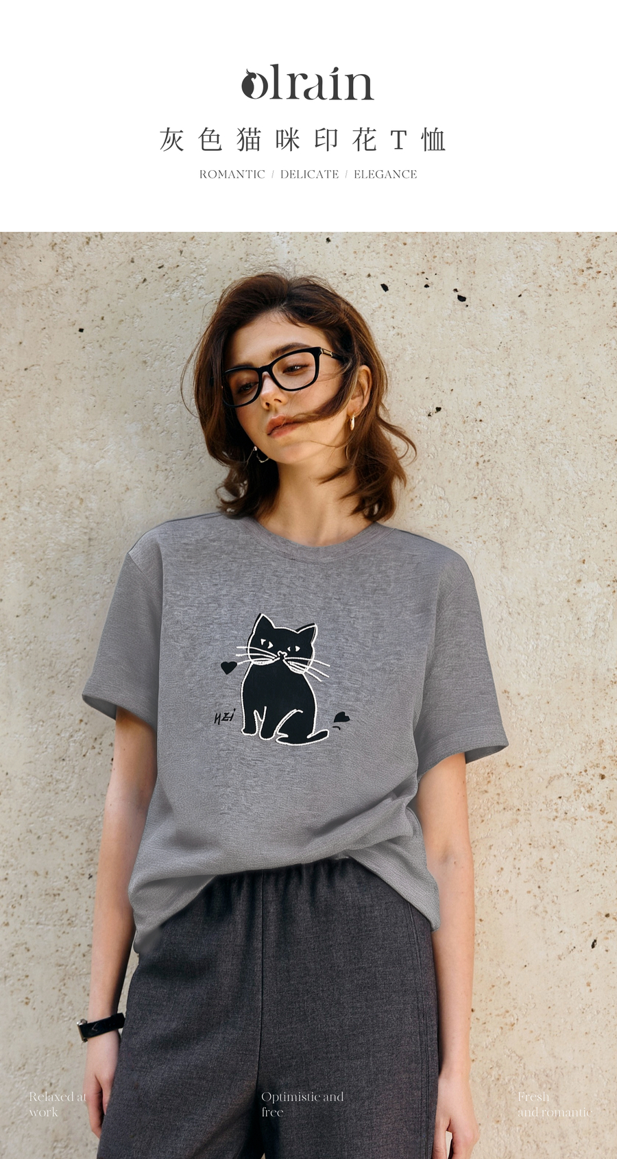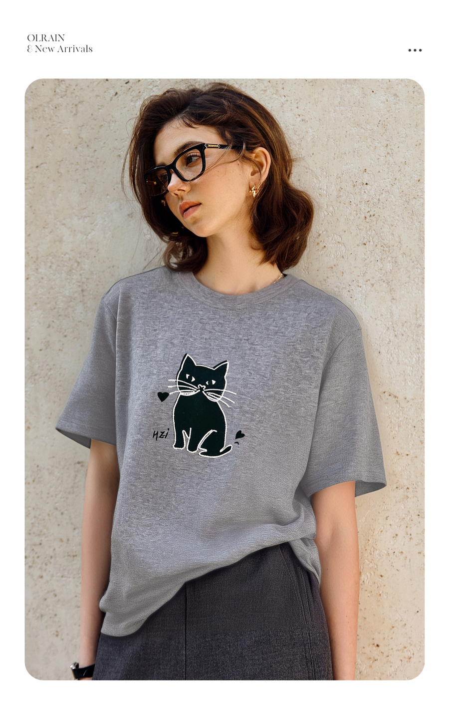 OLrain欧芮儿灰色猫咪印花百搭T恤女夏季2025新款休闲短袖上衣