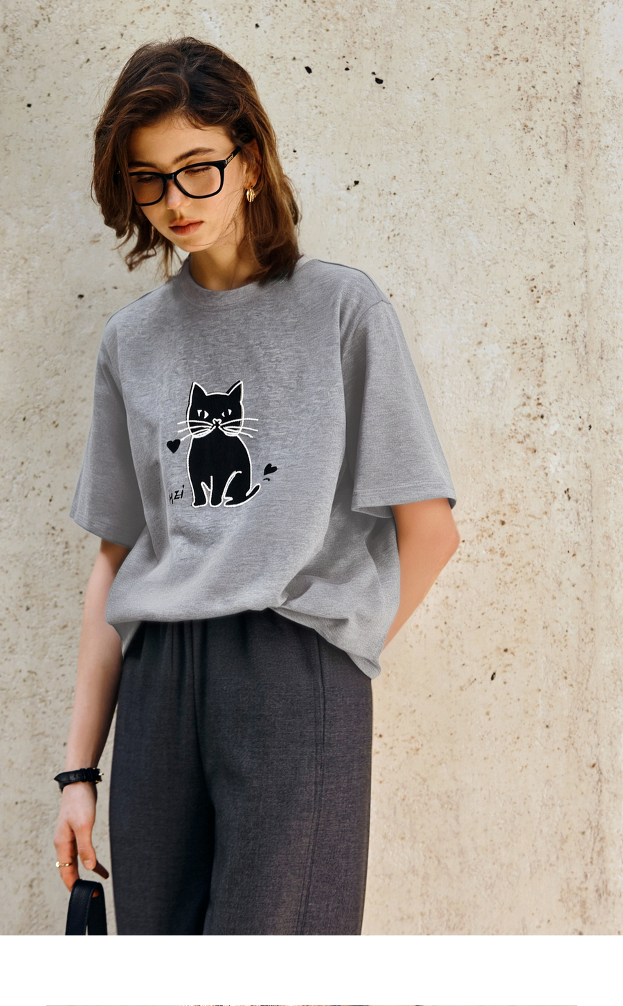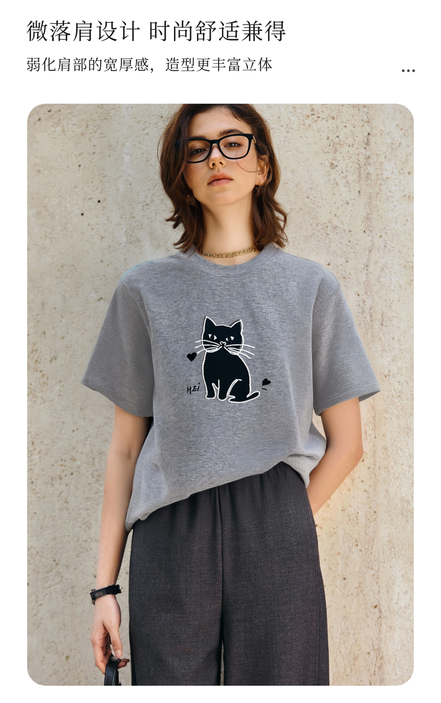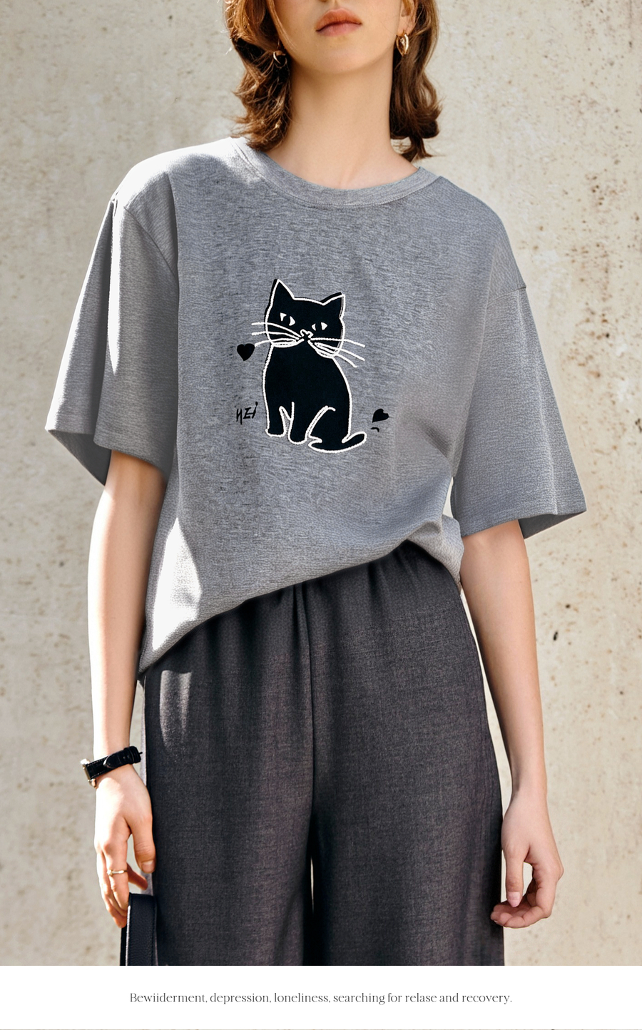 OLrain欧芮儿灰色猫咪印花百搭T恤女夏季2025新款休闲短袖上衣